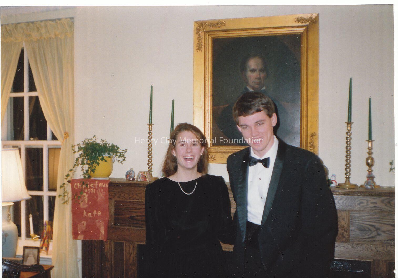 A photograph of a young woman and a young men, in front of a fireplace, ovre the mantle the portrait of Henry Clay.