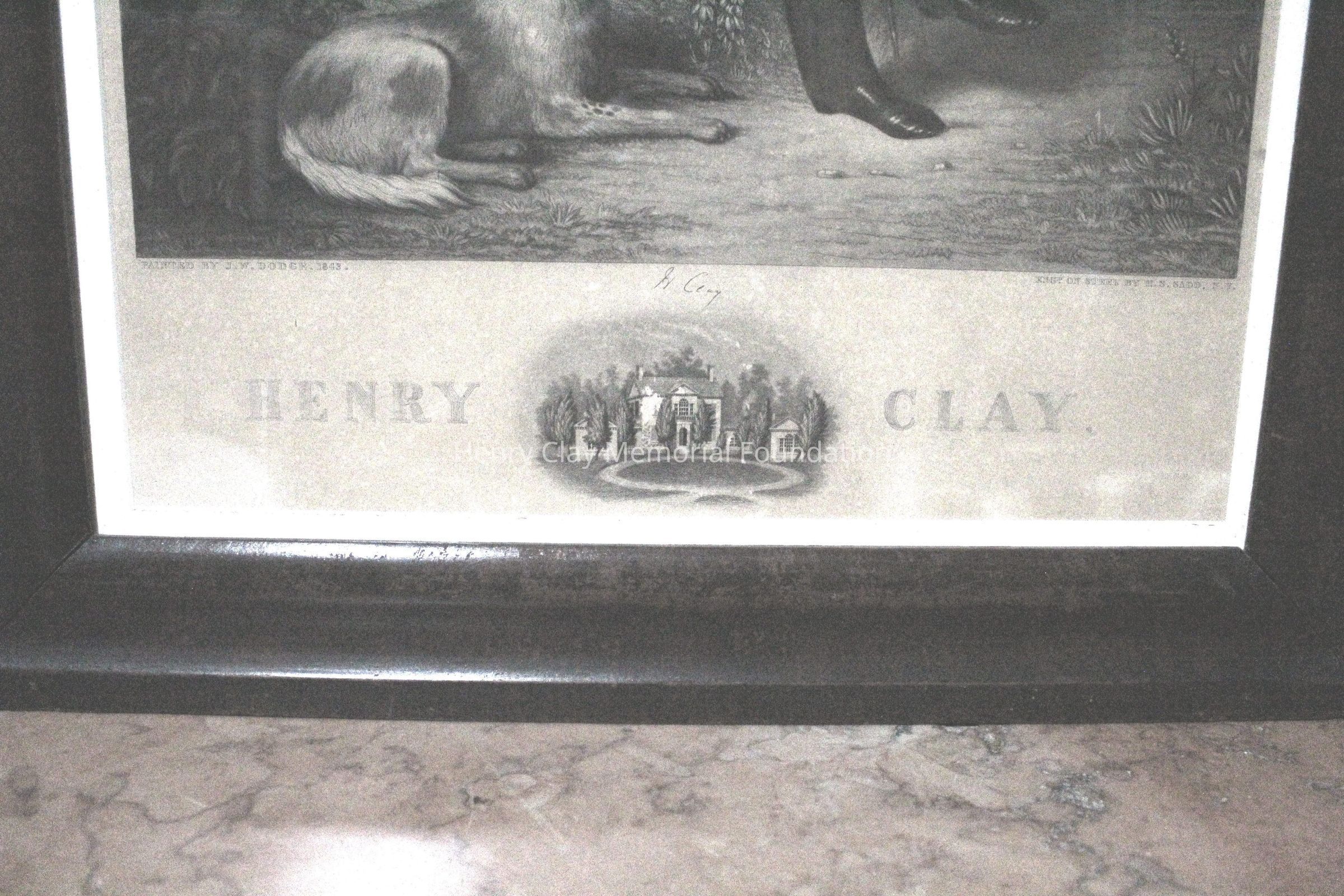 This is an engraving of Henry Clay showing him seated upon a tree limb in a pastoral setting with livestock and his mansion in the background. A dog is seated next to Henry Clay. The engraving is titled Henry Clay and is labeled with the painter's abd engraver's name and that the image was entered according to act of congress in 1843. It is framed in a simple dark wood frame with brass hanging ring at the top that dates to the period of the engraving.Dimensions