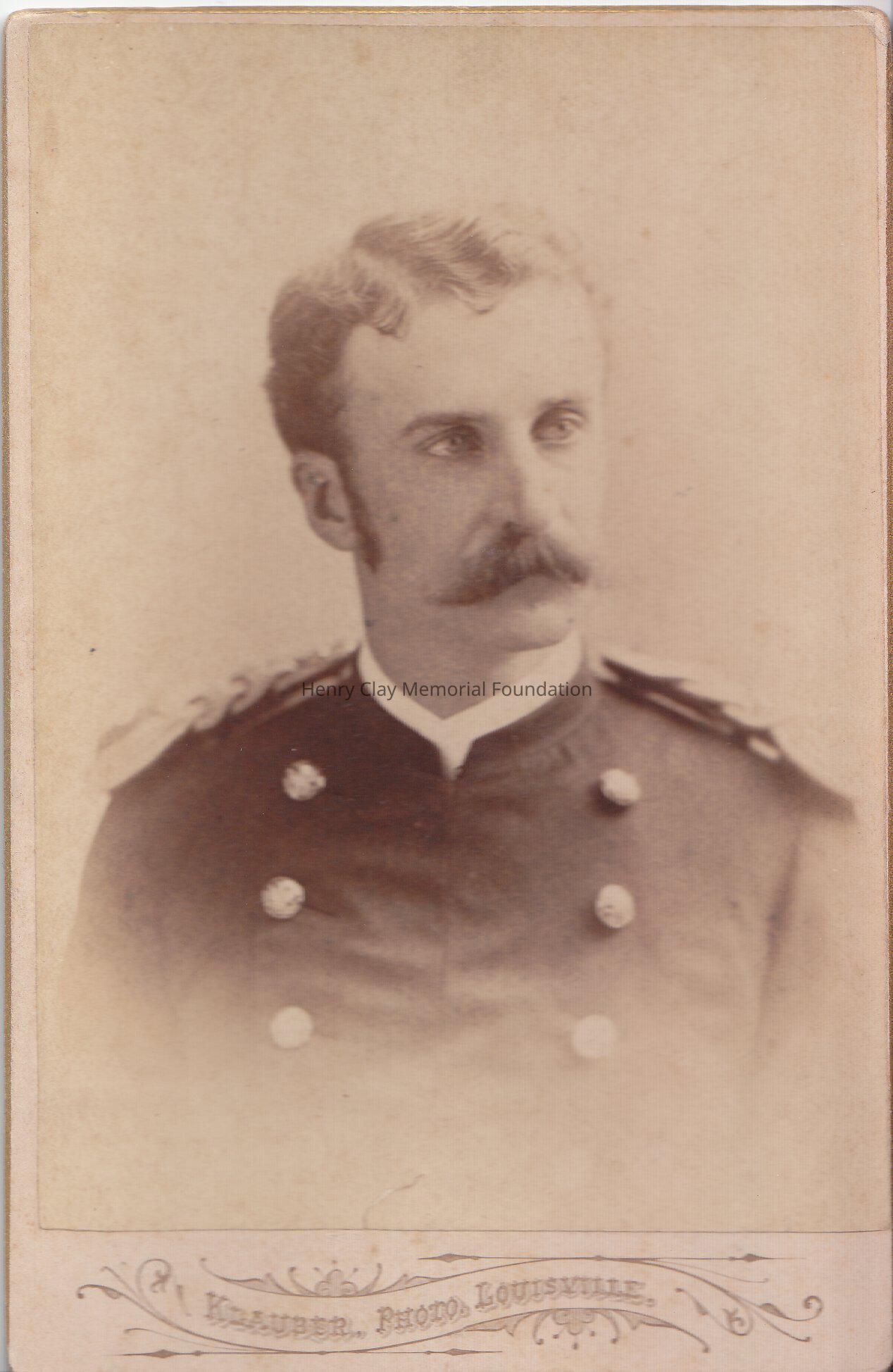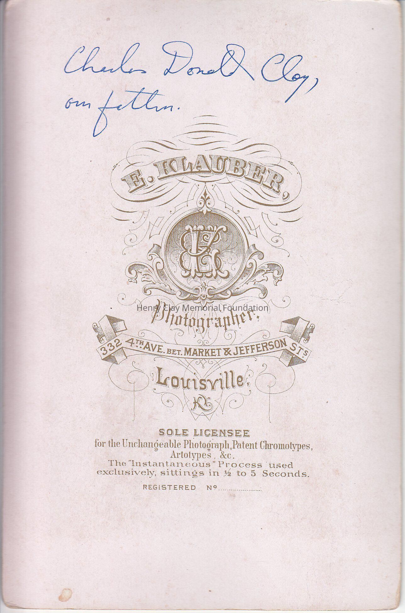 Photograph of Charles D. Clay wearing a uniform. He is wearing nicely shaped mustache. The uniform has golden buttons. At the bottom of the photograph printed is the name of the photographer " Klauber, Photo, Louisville". The photograph is framed in gold. Behind the photograph in pen handwritten is "Charles Donald Clay". At the center is the nicely printed name of the photographer. " E.KLAUBER, Photographer, 332 4th ave.bet. Market & Jefferson St.s, Louisville" and in finer print " SOLE LICENSE for the unchangeable Photograph, Patent Chromotypes, Artotypes, &c. The "Instantaneous" Process used exclusively sitting in 1/2 to 5 seconds. Registered no....."Dimensions