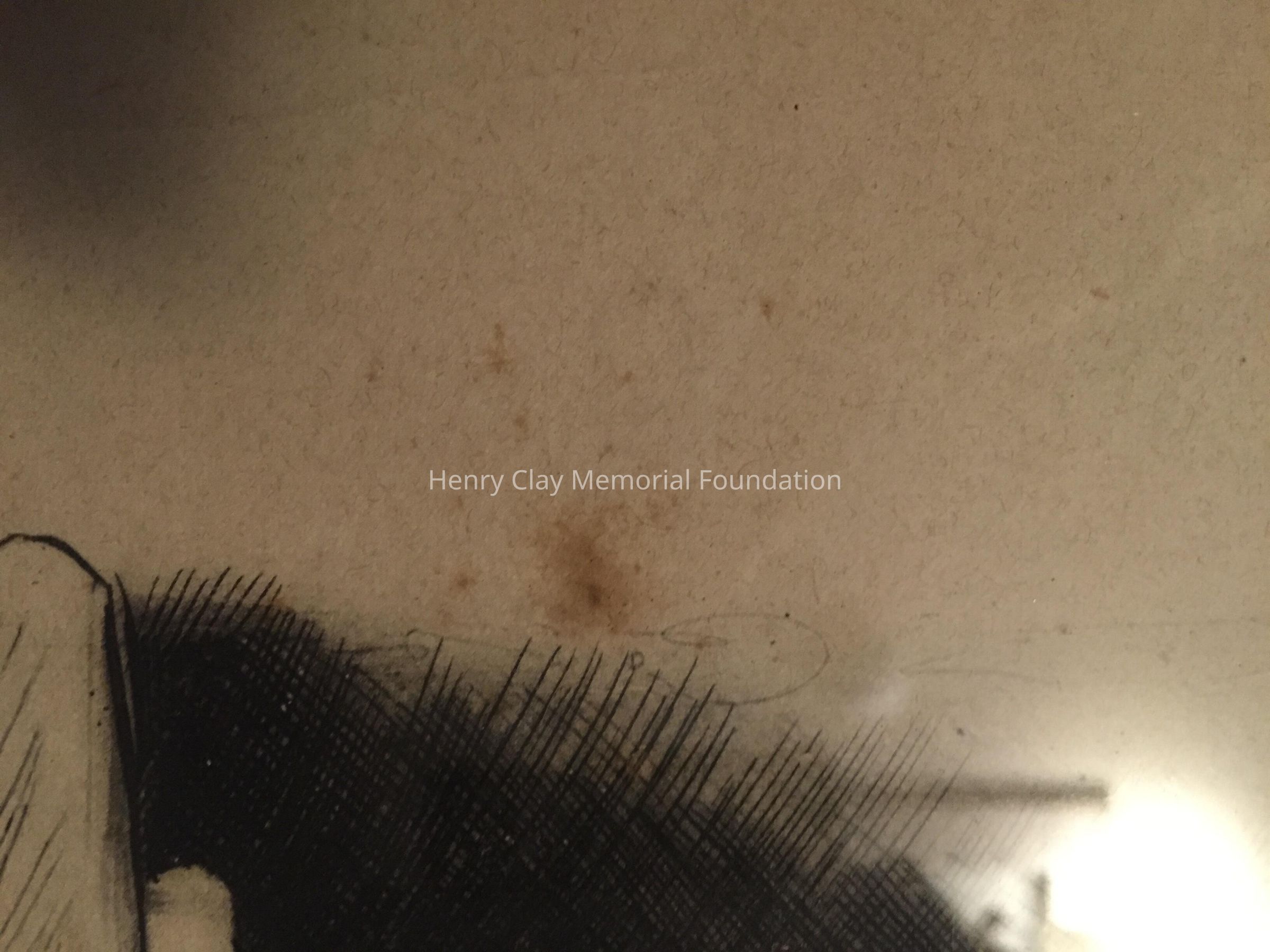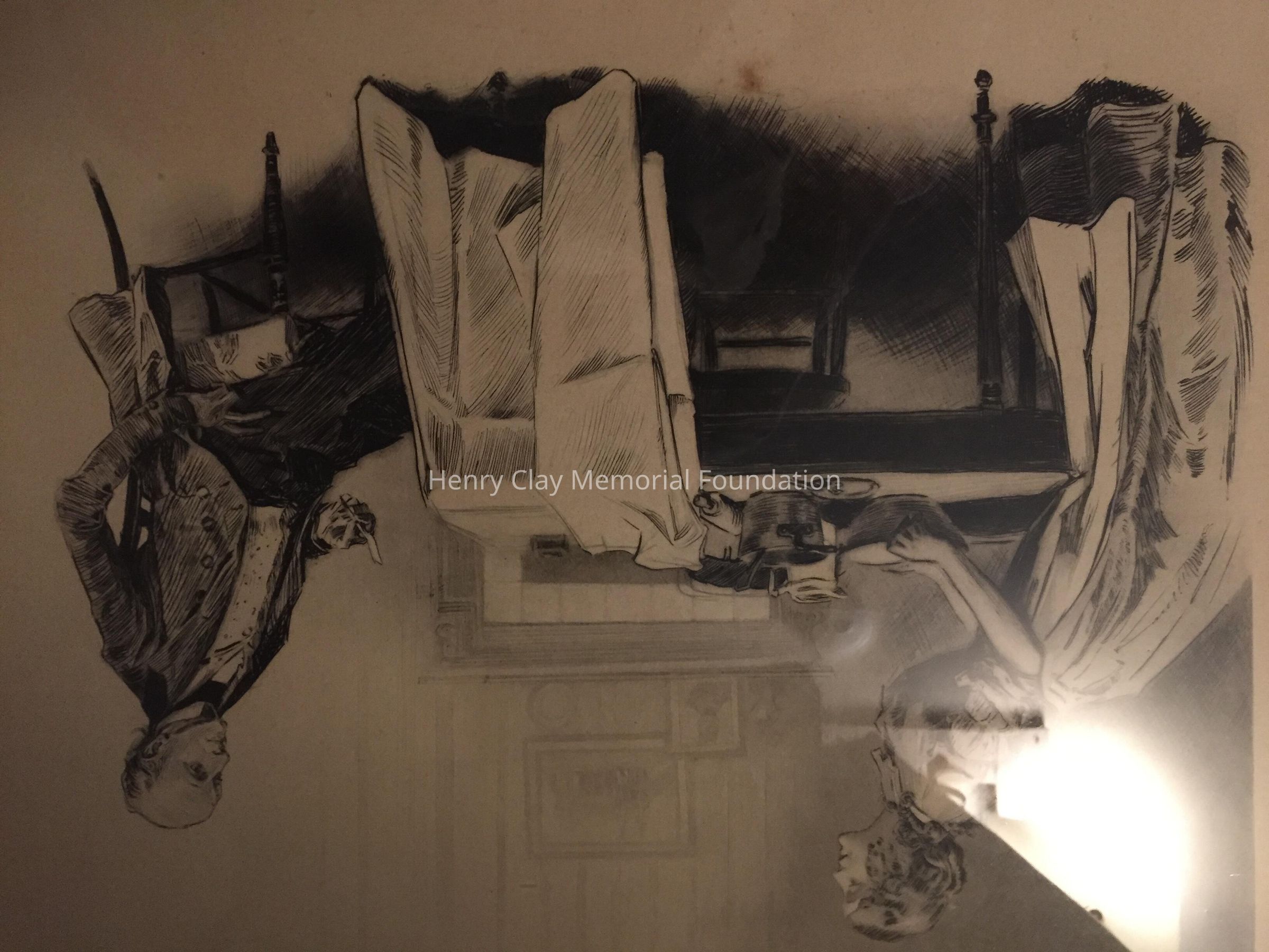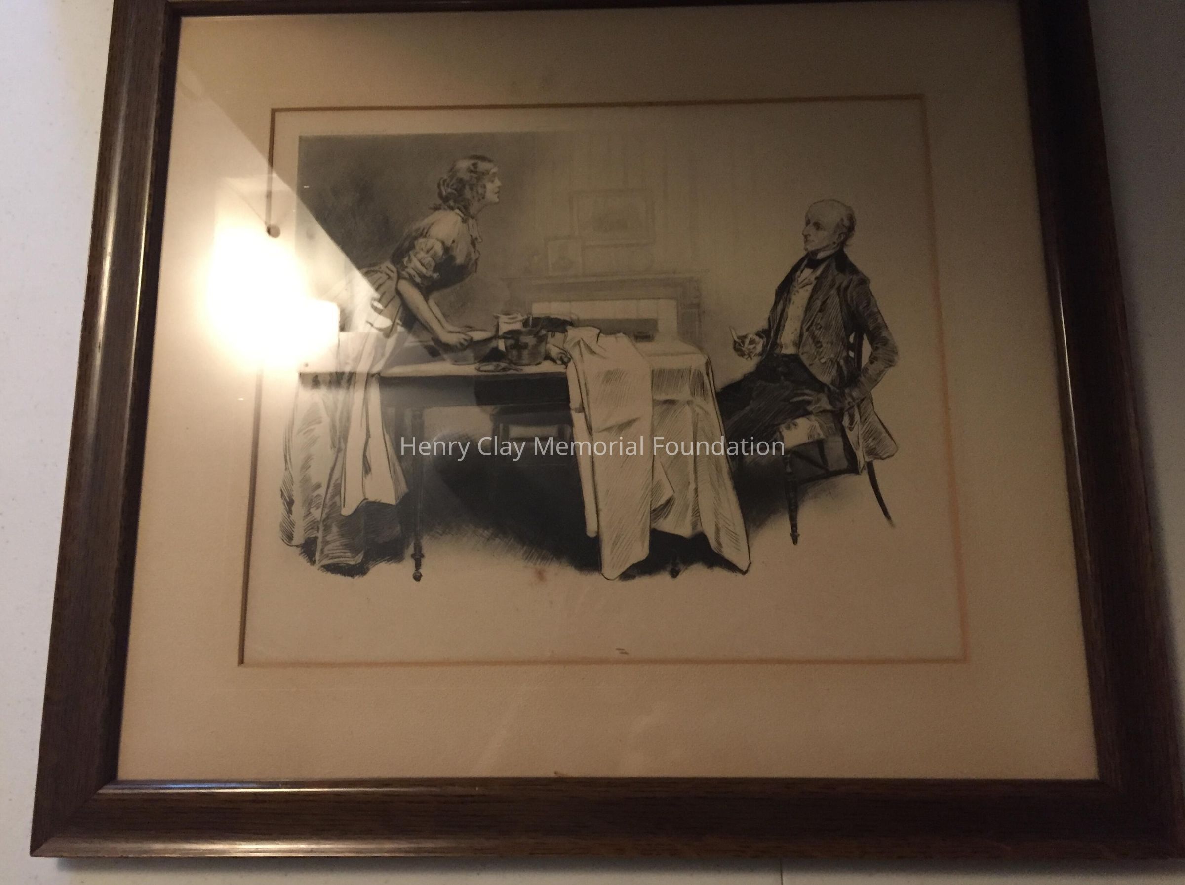 Black and white intaglio of man seated and woman preparing meal at table. Top left corner: "Copyright 1897 by Robert Howard Russell." Frame: plain wooden.