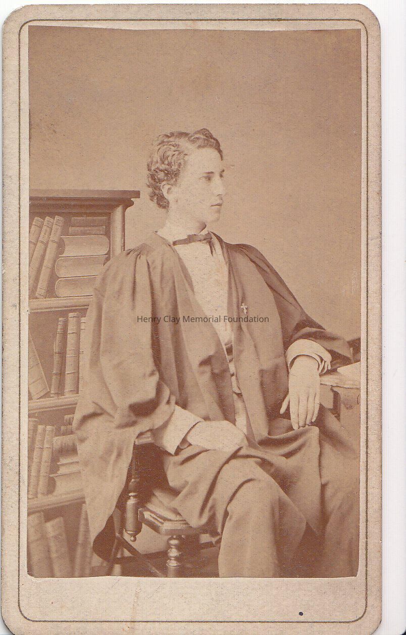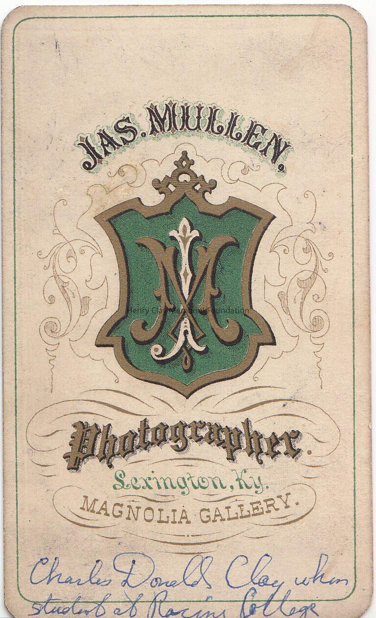 A carted de visit depicting Charles D. Clay when he was a young student at college. He is sitting on a wooden chair, behind him a picture of a book shelf. He is wearing a toga. Behind the picture JAS MULLEN Photographer Lexington, Ky Magnolia Gallery. In pen "Charles Donald Clay when student at Racine College"Dimensions