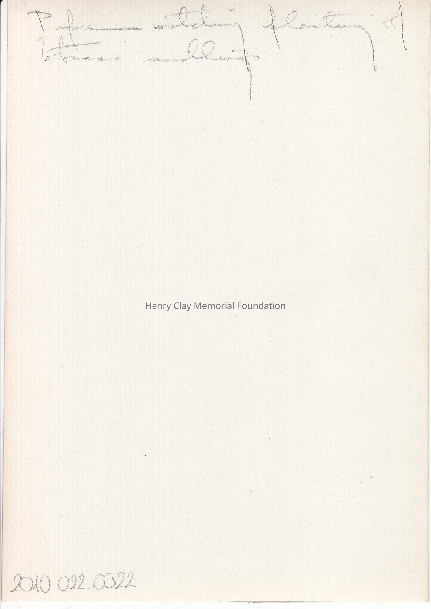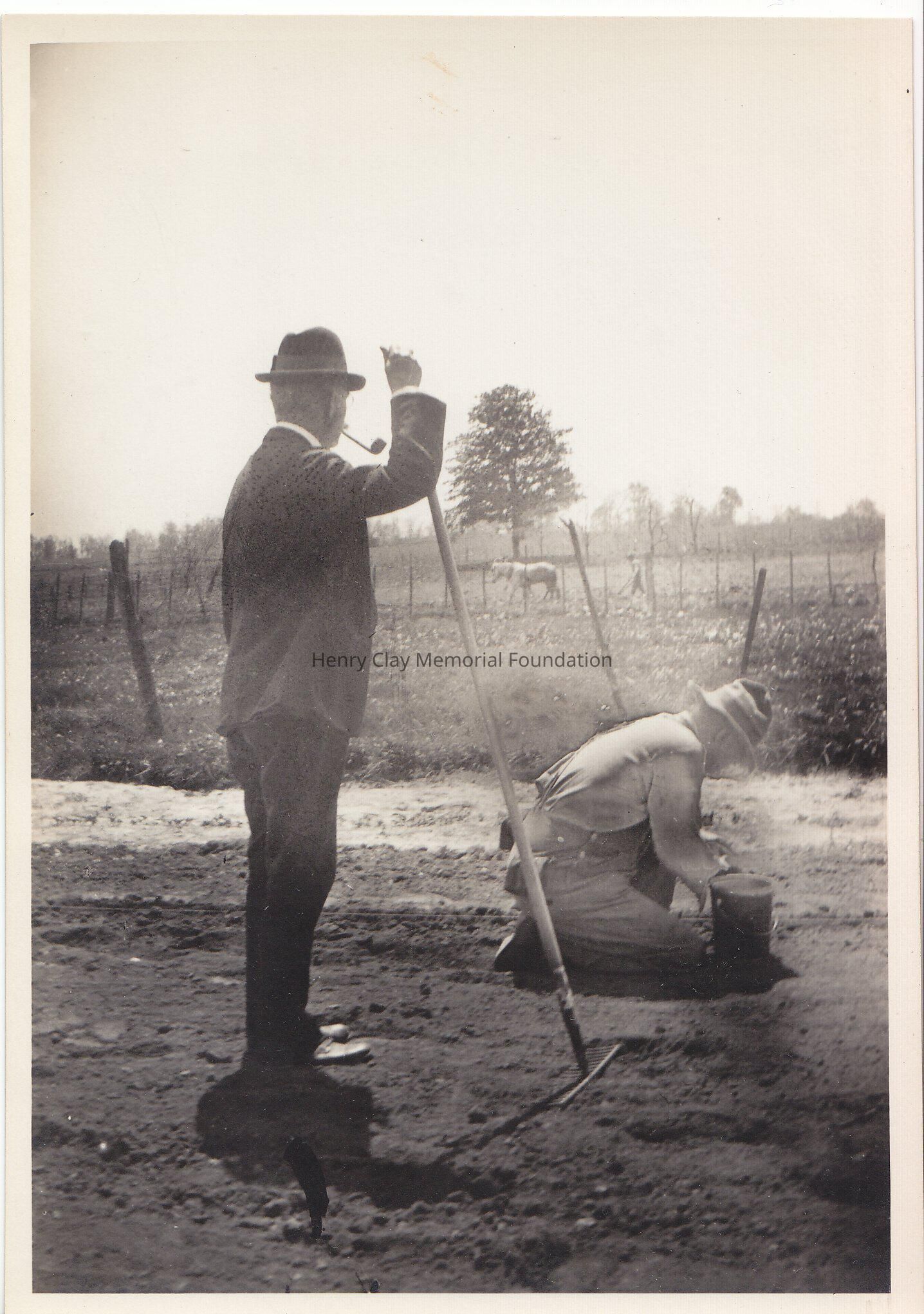 Photographs of Charles D. Clay watching planters of tobacco. He is standing with a pipe in his mouth, a rake in his right hand. He is wearing a dark suit and a hat. A tobacco planters is kneeled before him working. Behind them a metal fence with wood posts, fields, a horse and a tree, are behind the fence. In the rear of the photo there is a handwritten note in pencil " Papa watching planters of tobacco".