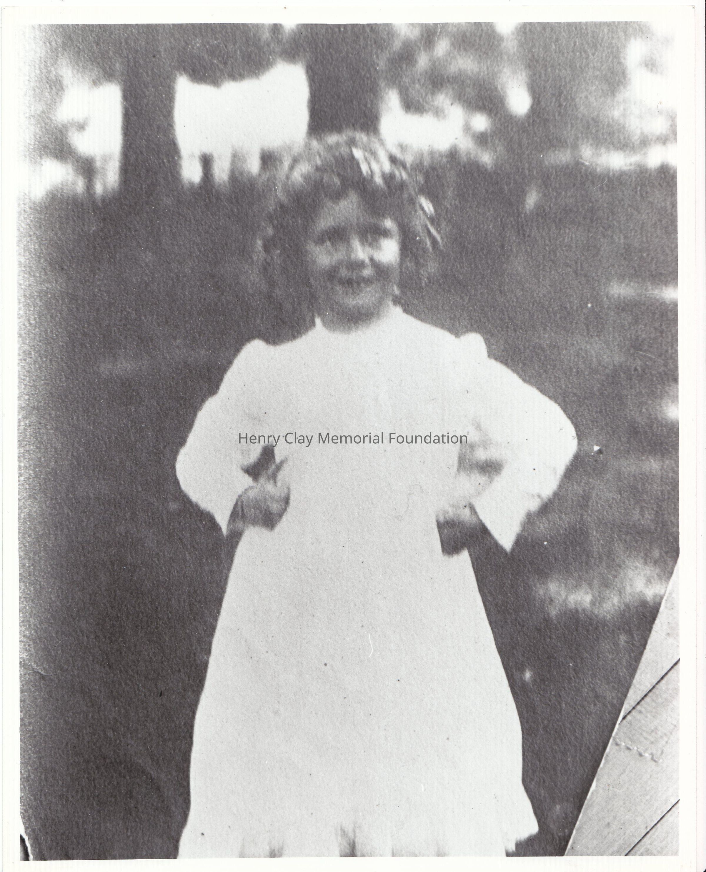 Reprint of a black and white photograph of Susan Sawitzky as a young child. She is wearing a light colored dressed with long sleeves, and some ruffle at the hem. Her hand are on her waist in fist. She is smiling. Her hair are very curly. The background is to fuzzy to make out but it seems she is outside in a yard.