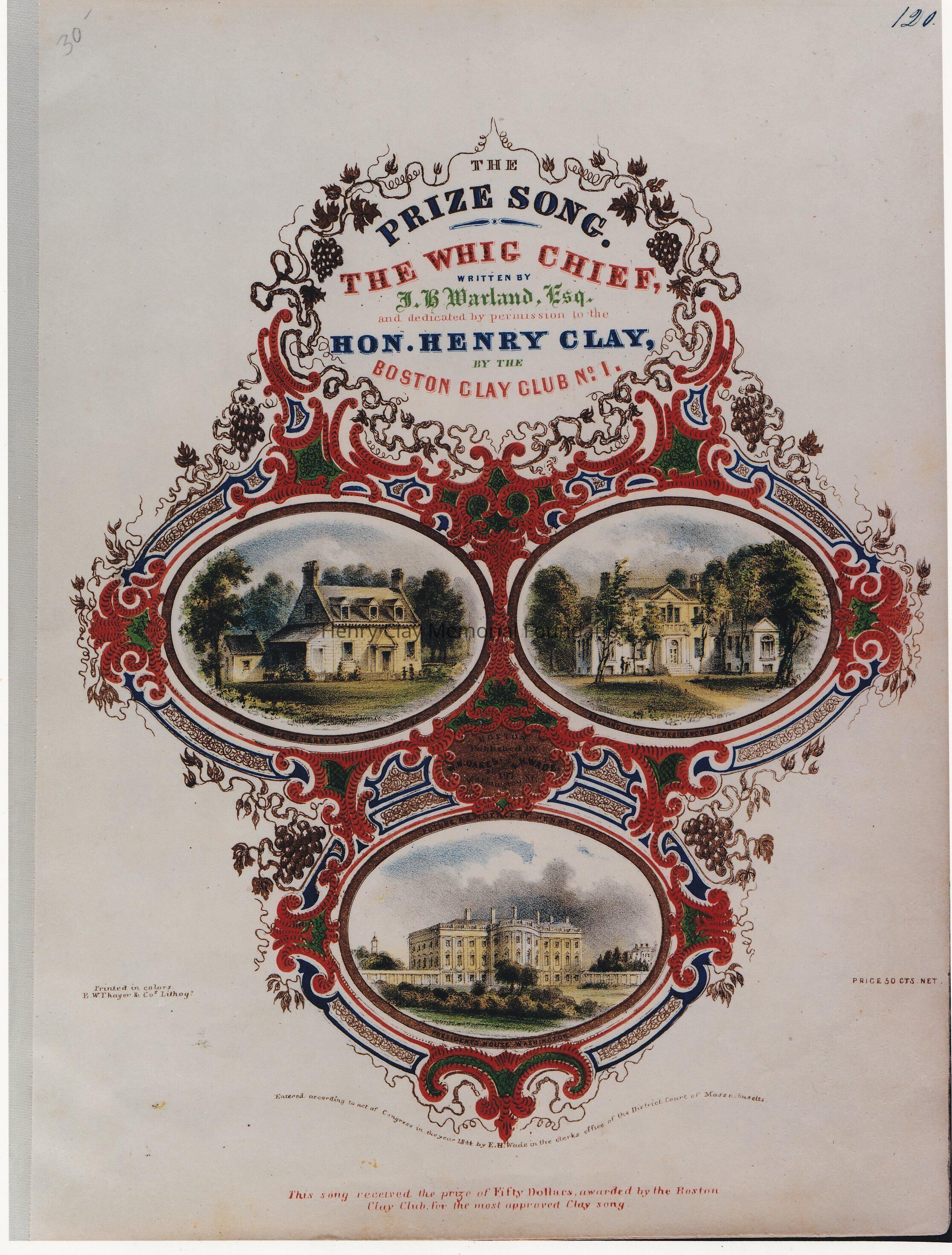 The photograph depicts three houses surrounded by an elaborated design with grapes, grapes vines. On top "The Prize Song The Whig Chief written by J.B.Warland, Esq. and dedicated by permssion to the Hon. Henry Clay by the Boston Clay Club No.1" at the bottom "Printed in color B.W.Thayer &Co. Lithog. Price 50 cents. ", " This song received the prize of Fifty Dollars awarded by the Boston Clay Club for the most approved Clay song.