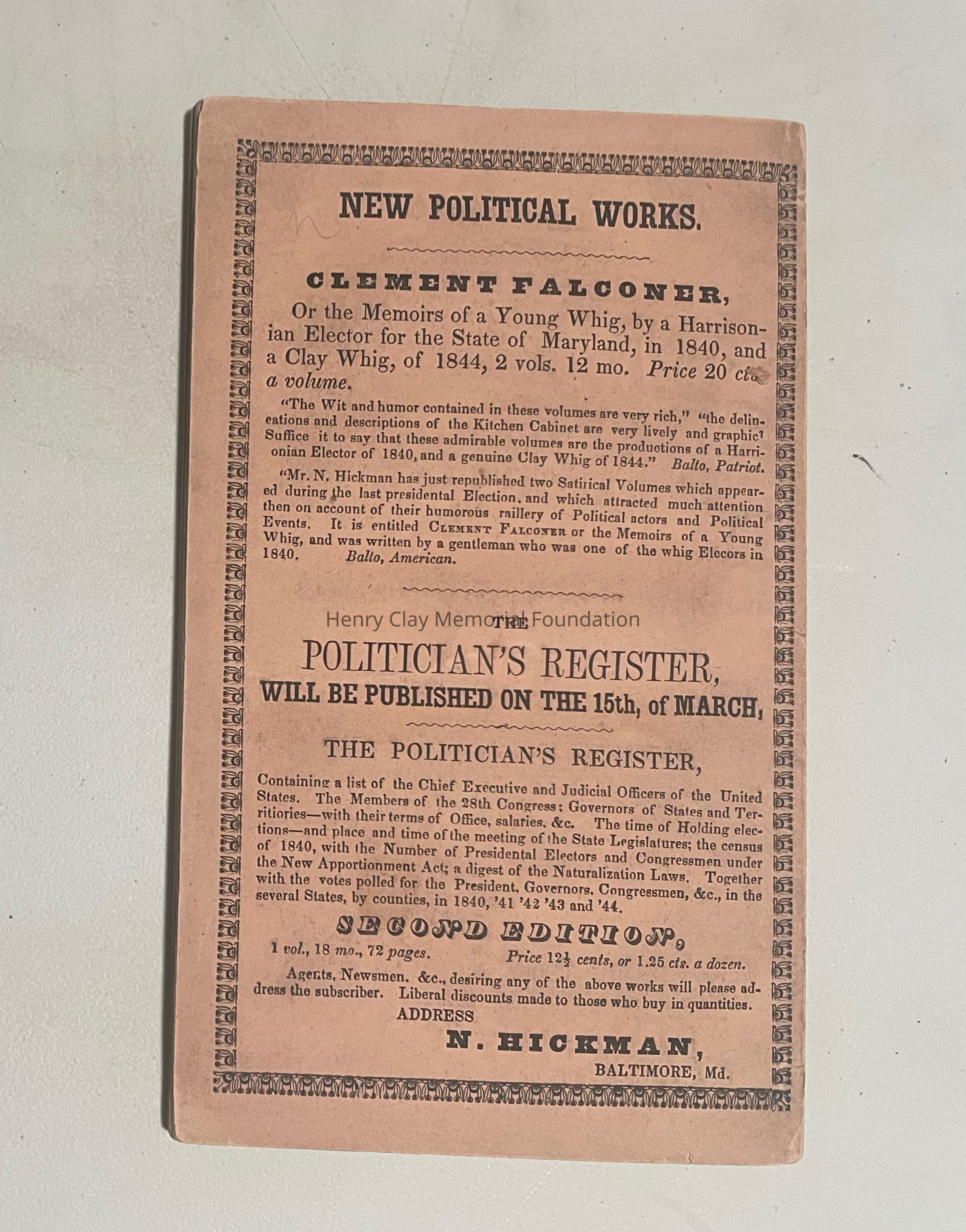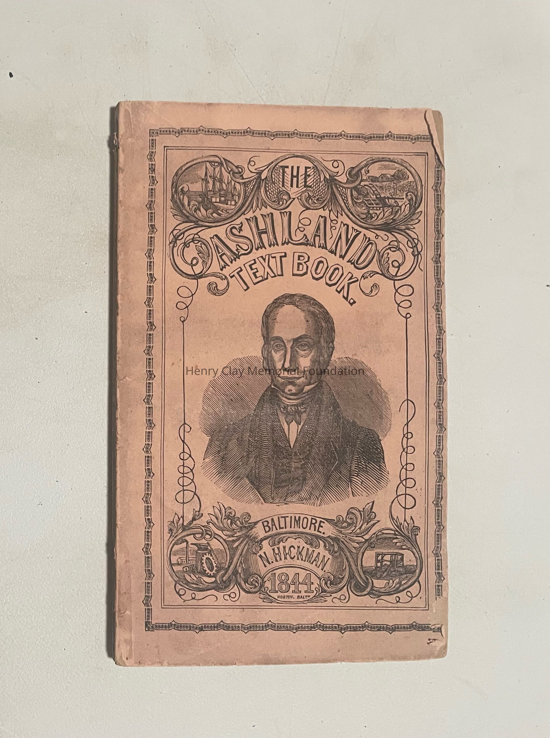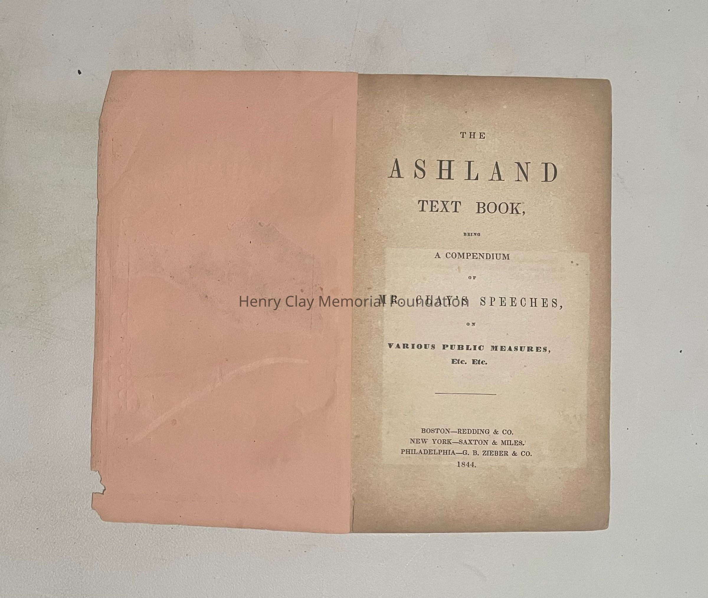 A pinkish paper-bound book titled "The Ashland Textbook." On the front is an image of Henry Clay; The back contains reviews of new political works. Published in 1844, it is a book of Henry Clay's speeches.Dimensions