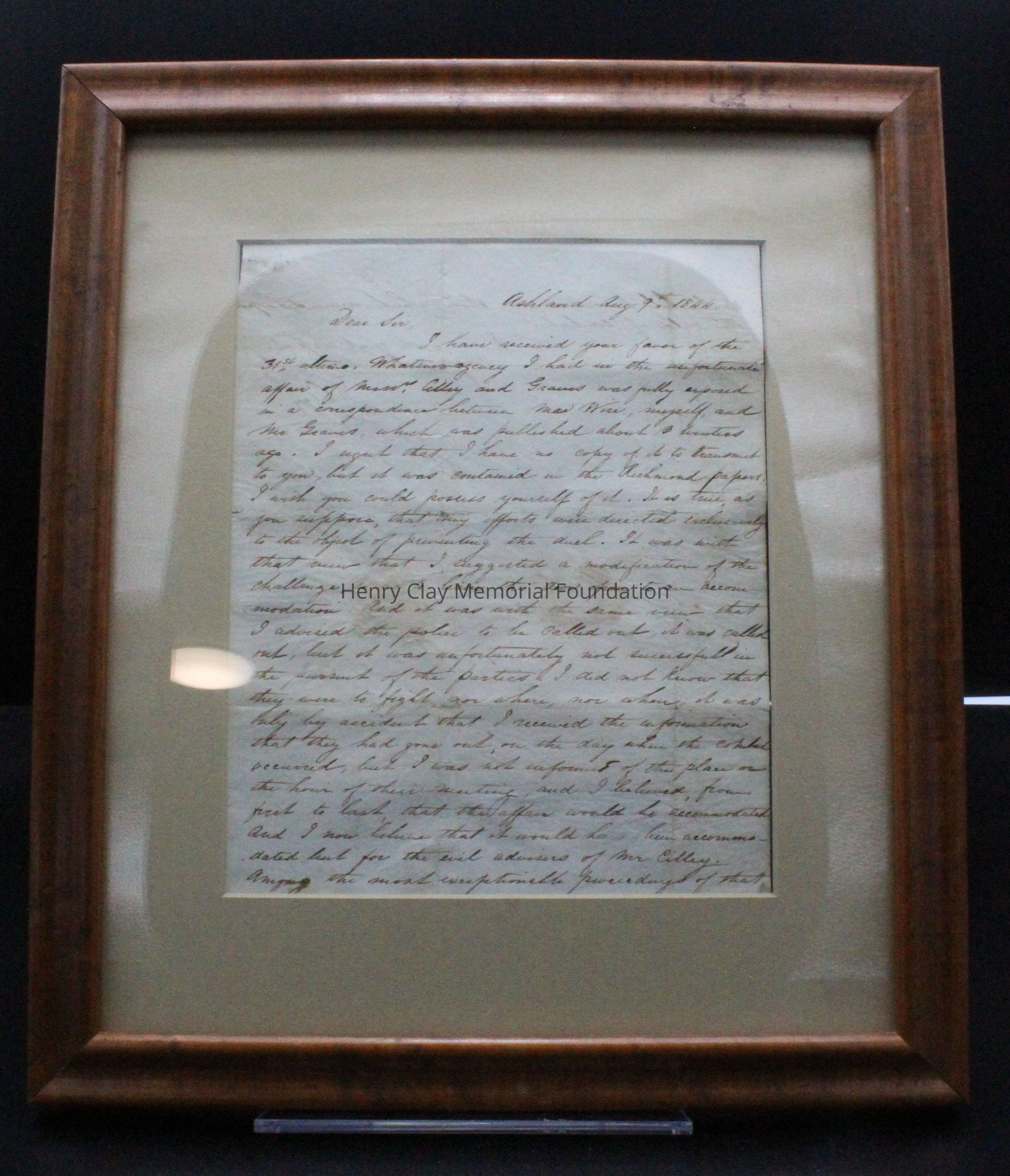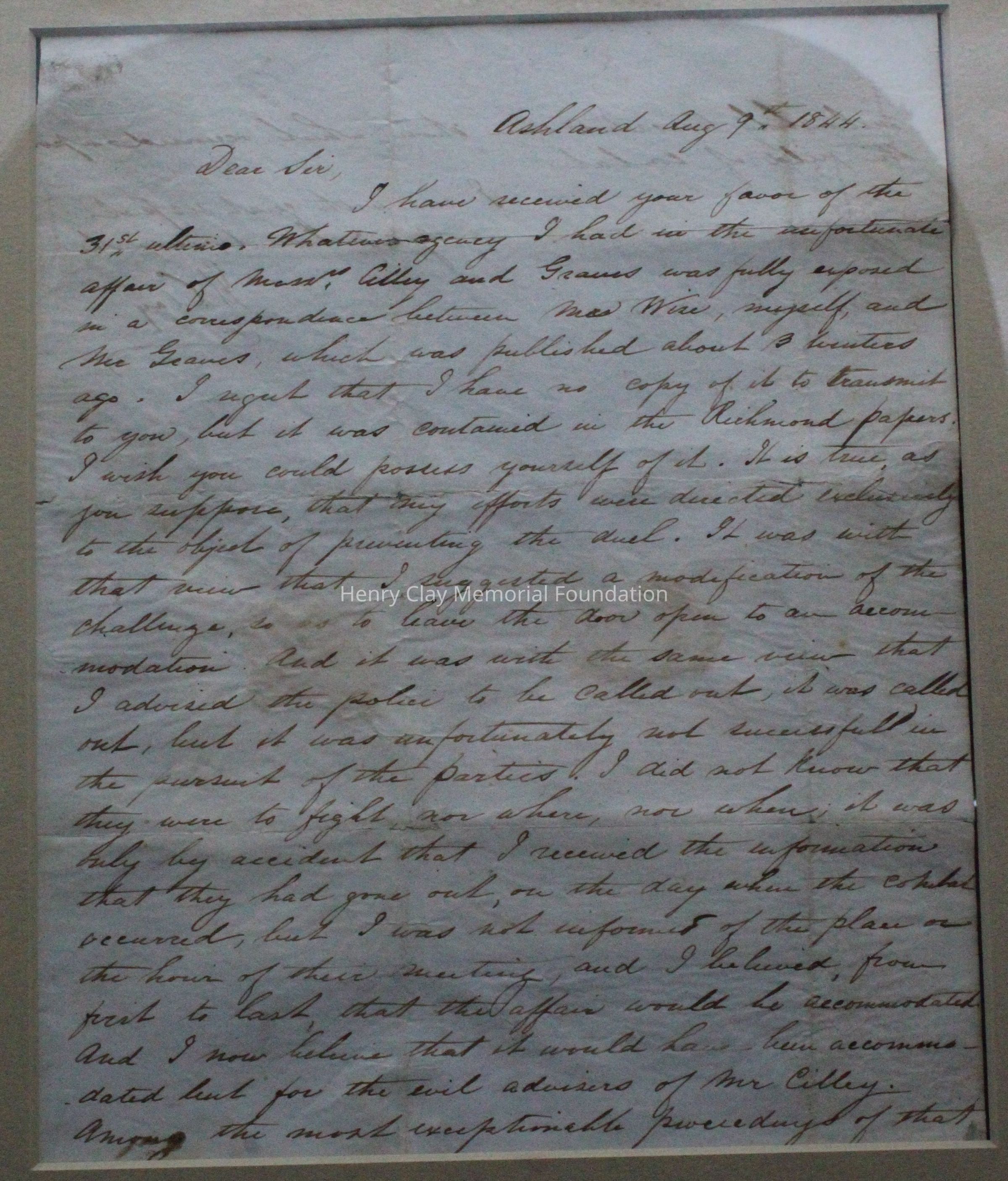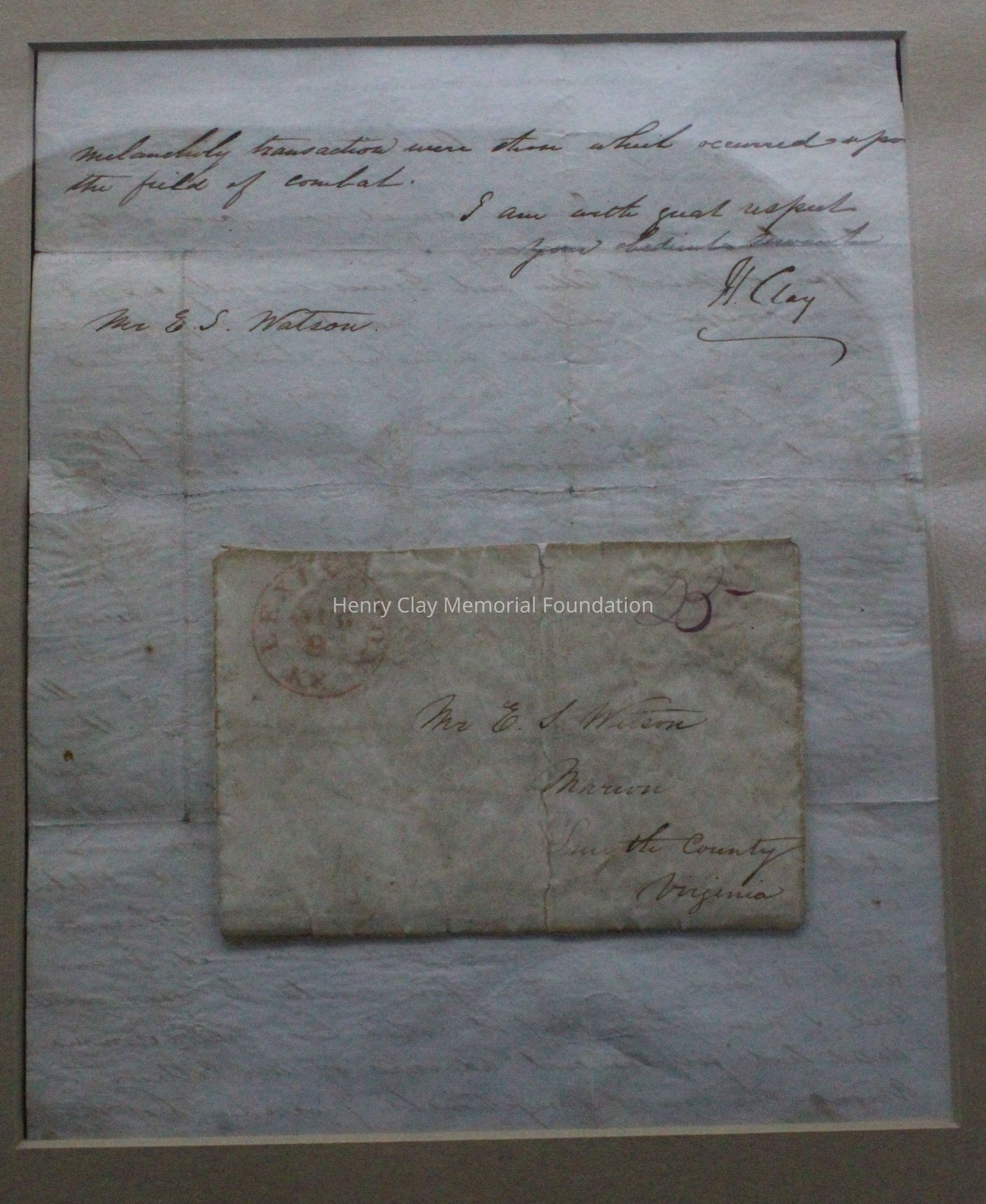 1 letter from Henry Clay to ES Watson 8/9/144 re: Cilley - Graves duel. 1 piece of paper and envelope.