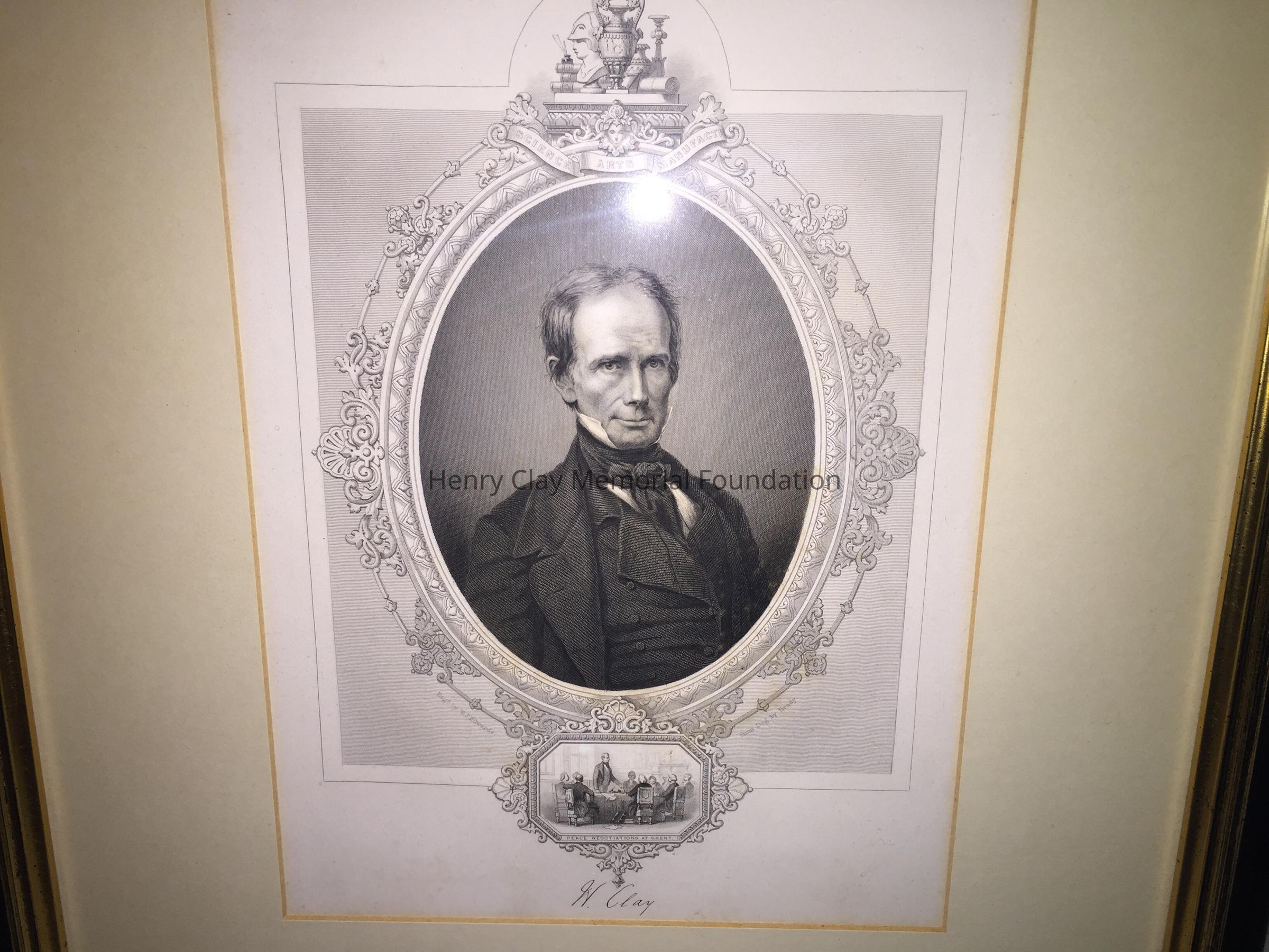 Intalgio of Henry Clay inside decorative oval frame with vignette at top of urn, bust of woman, books, etc. Under written: "Science / Arts / Manufacti..." Vignette at bottom depicts men seated around table, one standing with words "Peace negotiations at Ghent" underneath. Left side under picture: "Engd. by W. J. Edwards." At bottom, copy of Henry Clay's signature.Dimensions