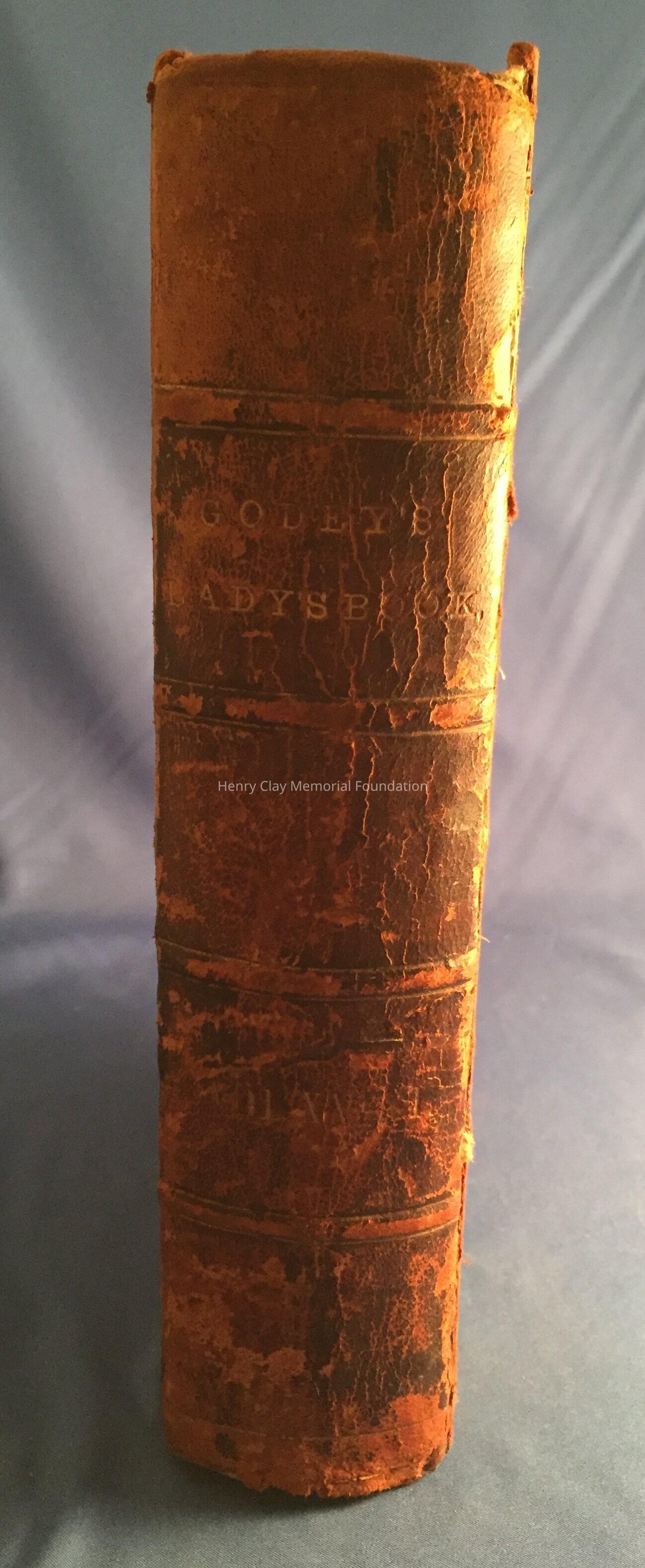 Omnibus edition of 1848 Godey's Ladies Book, a journal of fashion and lifestyle for women. Bound in cardboard with leather spine and corners.
