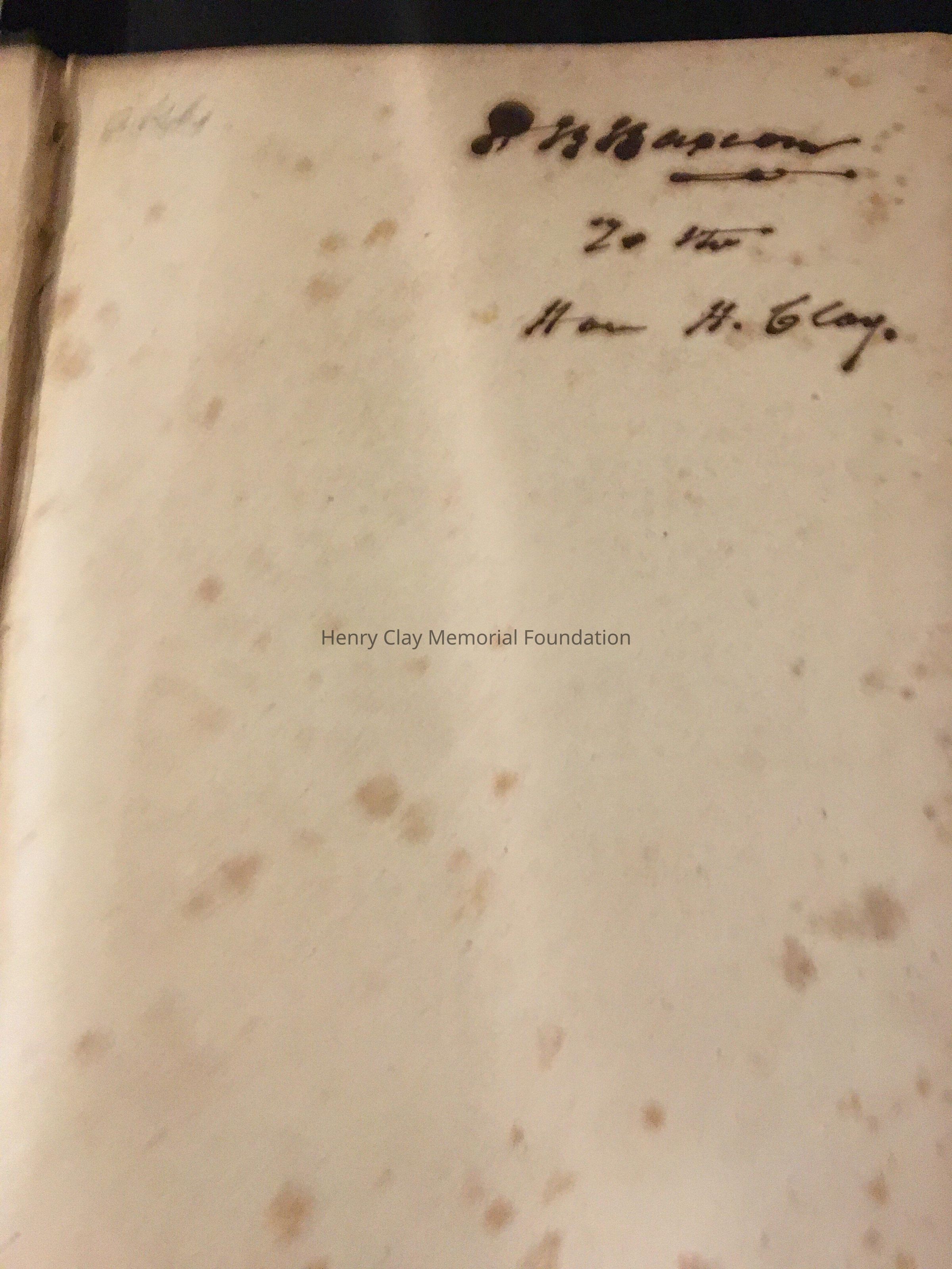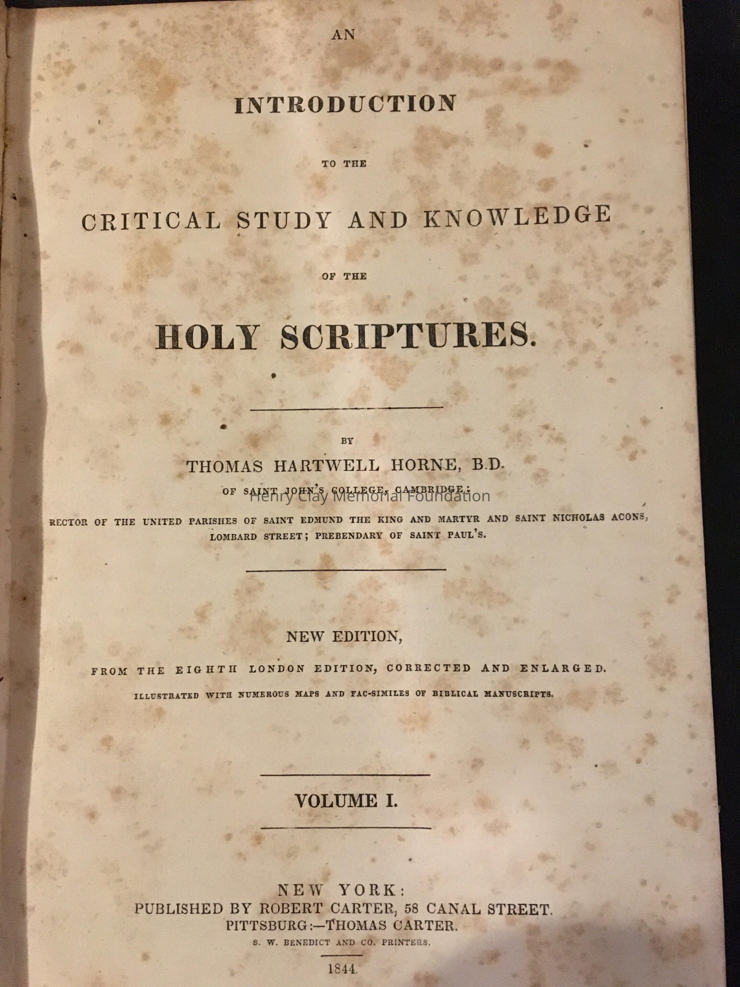 A religious book introducing the reader to the Holy Scriptures. In the first page in black ink there is a note "? to the Hon. H. Clay"