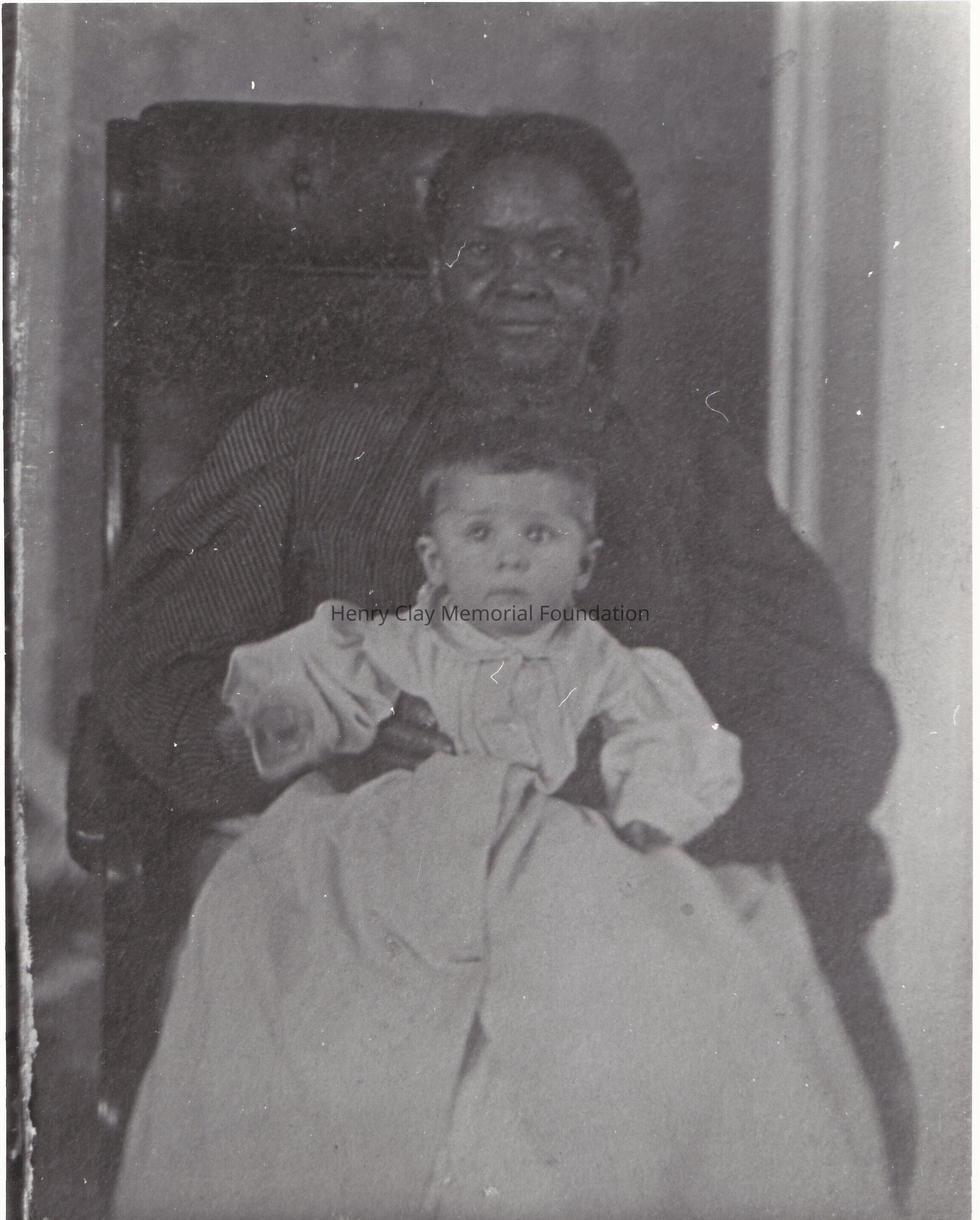 A copy of a black and white photograph of Susan Clay as a baby. She is in her "Mammy" arms (Mary Jackson?) and they are sitting on a leather chair. Susan is wearing a wide light colored dress, while the servant is wearing a dark dress with light stripes.Dimensions