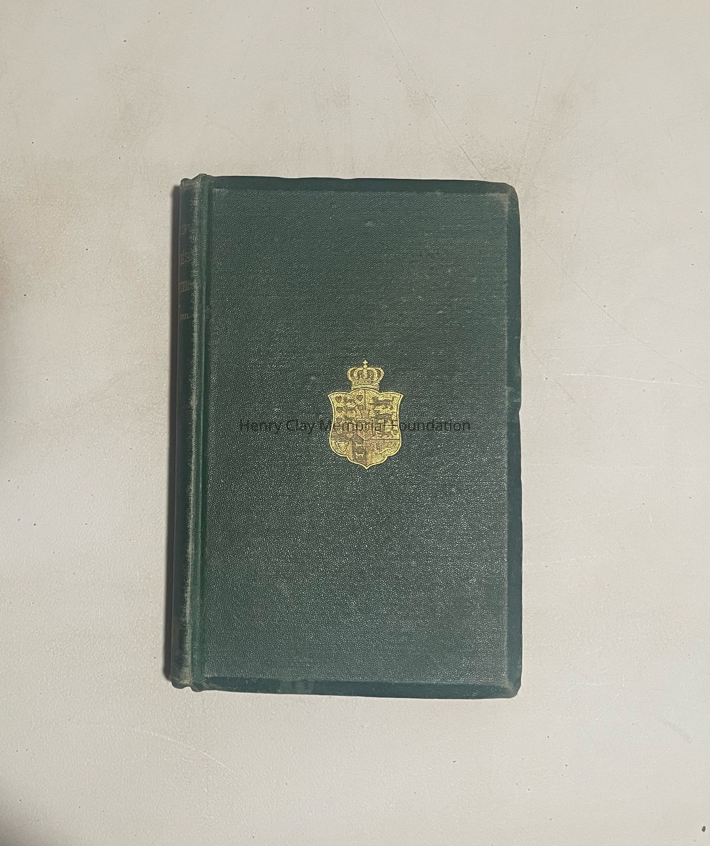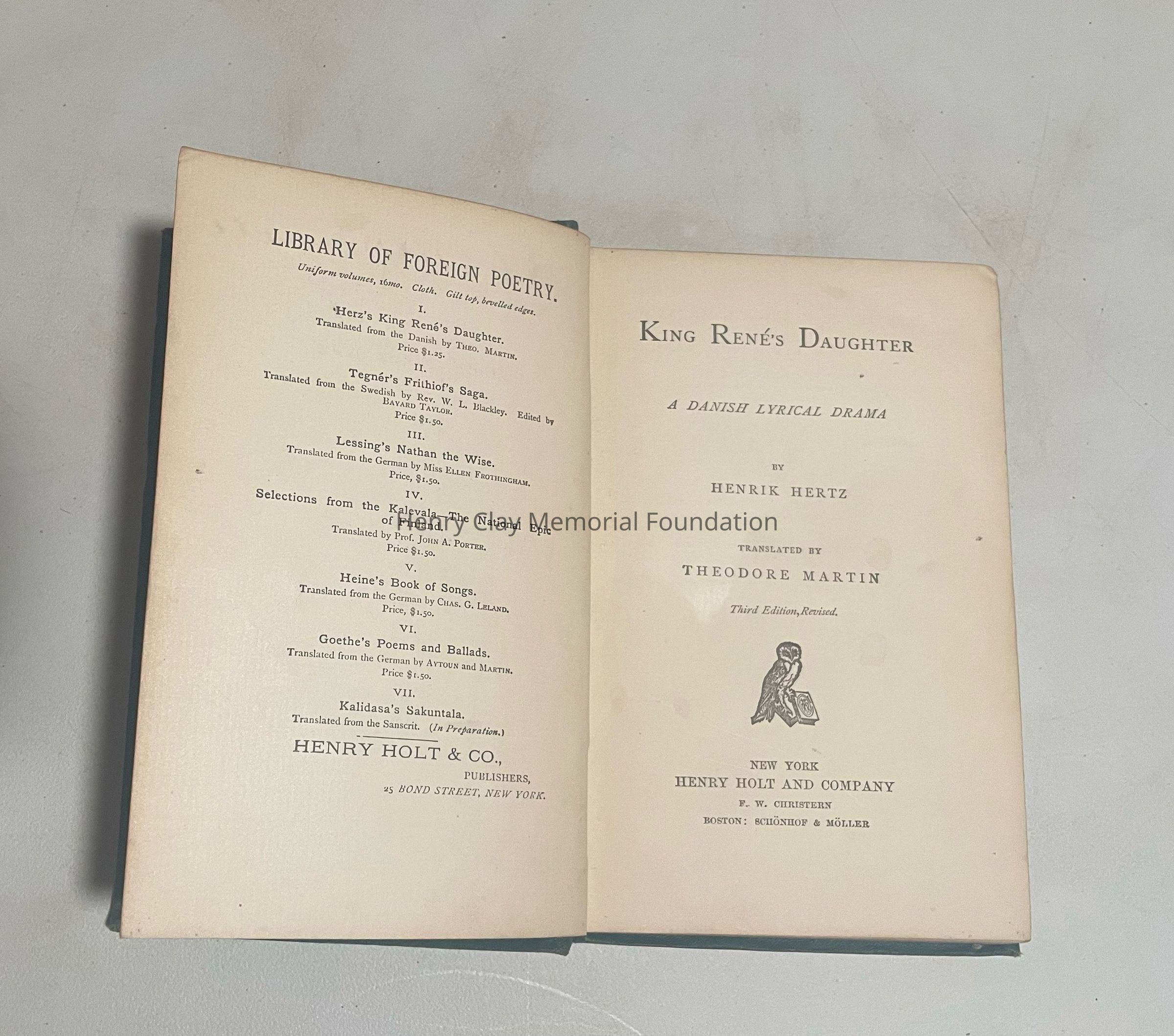 A book titled King Rene's Daughter, A Danish Lyrical Drama written by Henrik Hertz and translated by Theodore Martin. Bound in a green leathery material with gold stamping and lettering.Dimensions