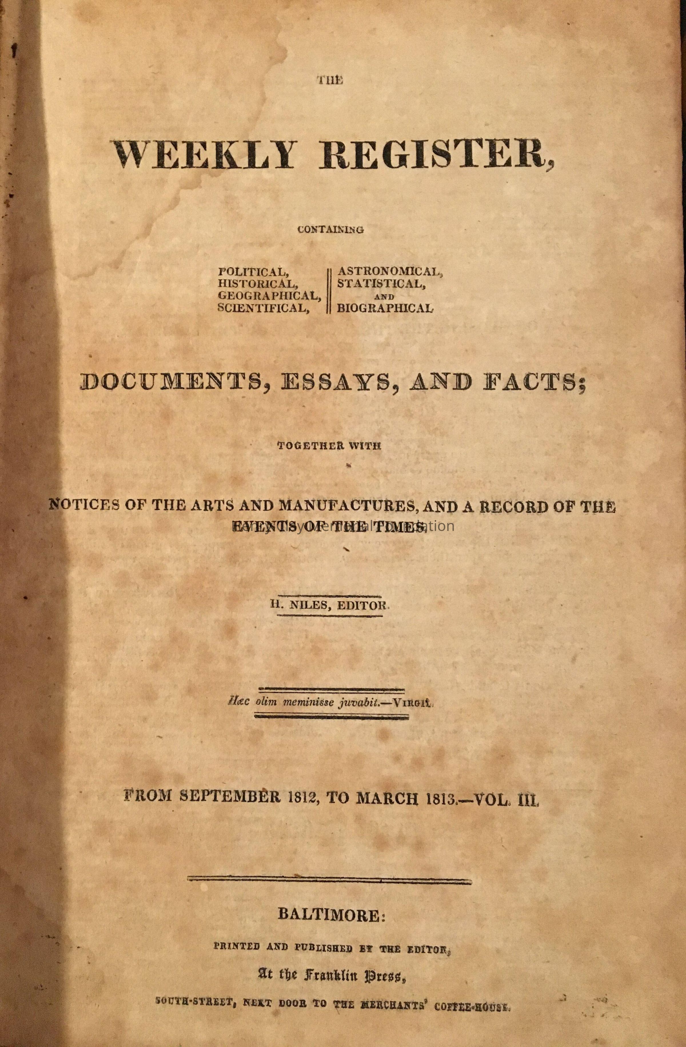 Weekly Register collection. Writing on inside cover about events on certian pages. (too small to read). Writing in pencil on the inside of back cover.