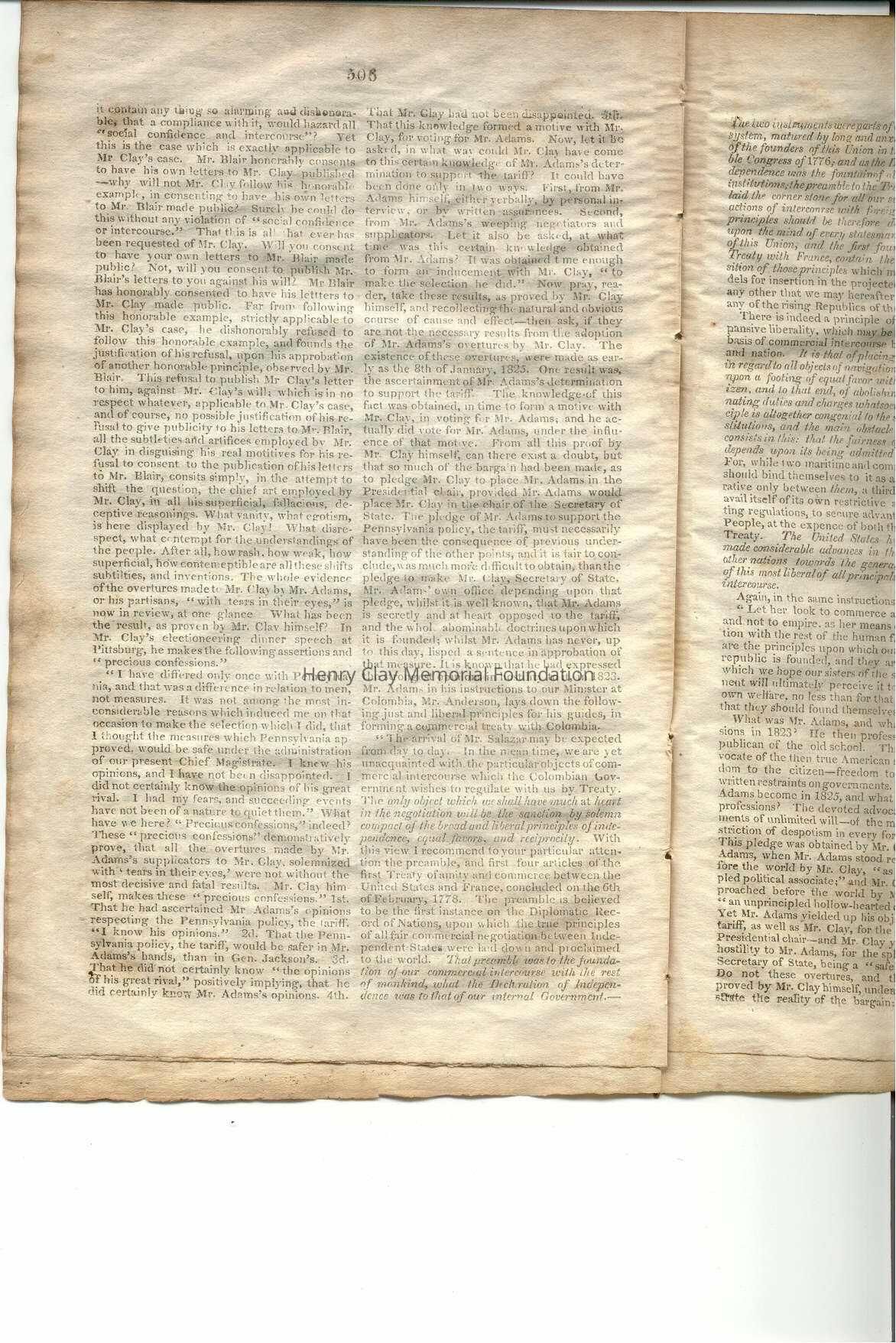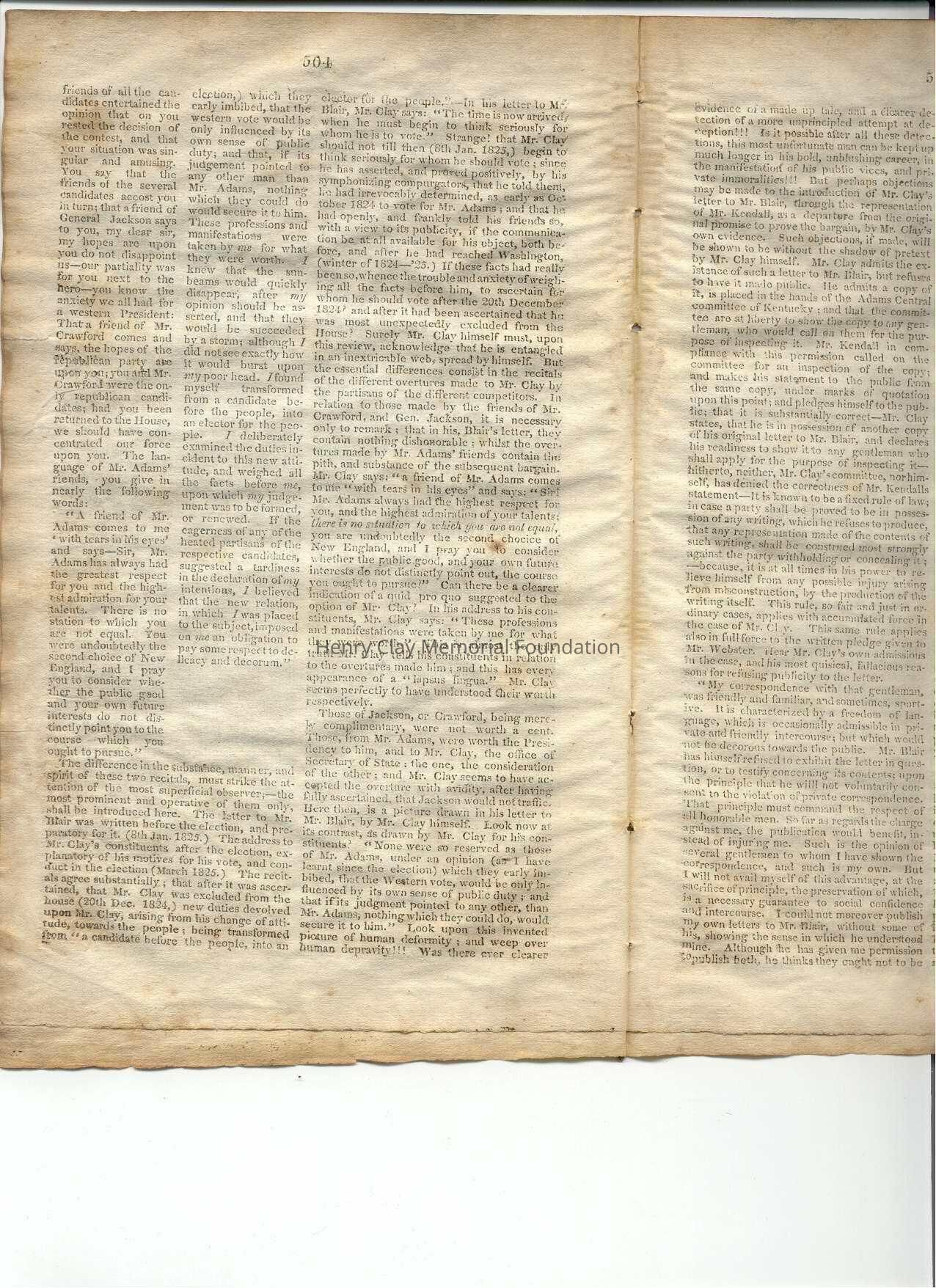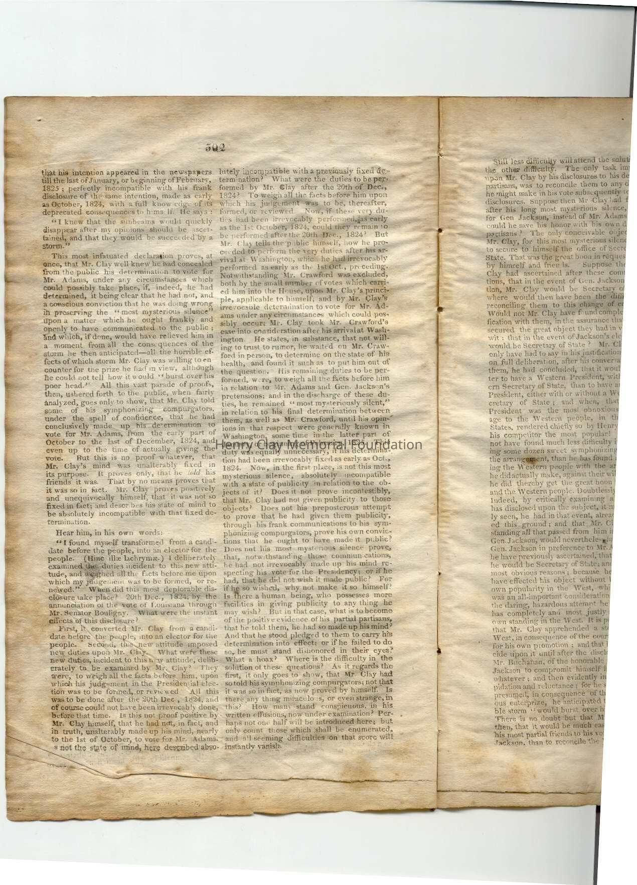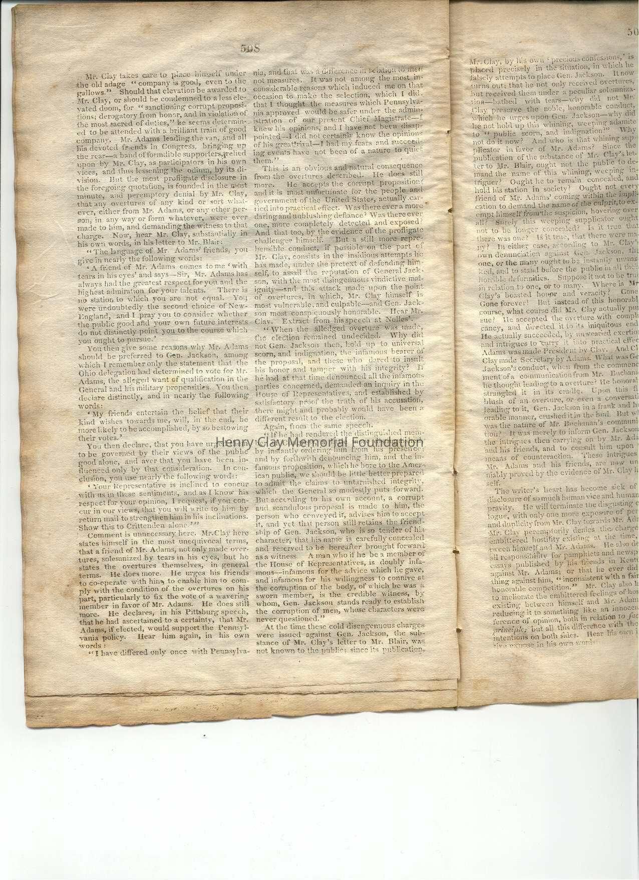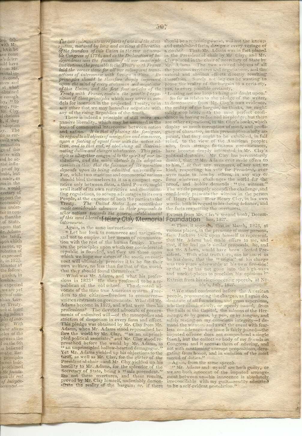 An article written to refute Henry Clay's claims of the nonexistence of a "Corrupt Bargain" between Clay and John Quincy Adams to throw the 1824 presidnetial election to Adams in exchange for the office of Secretary of State.