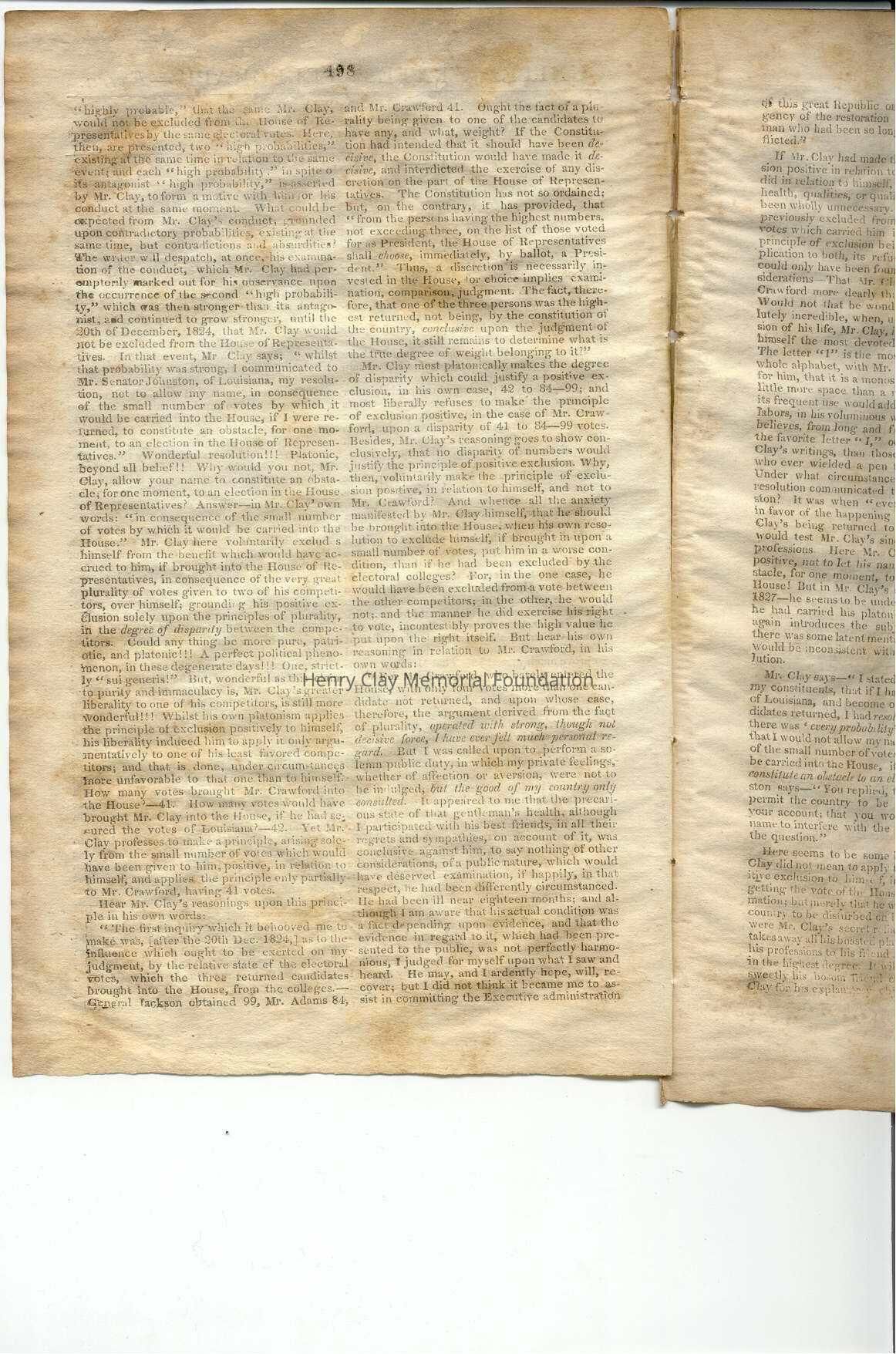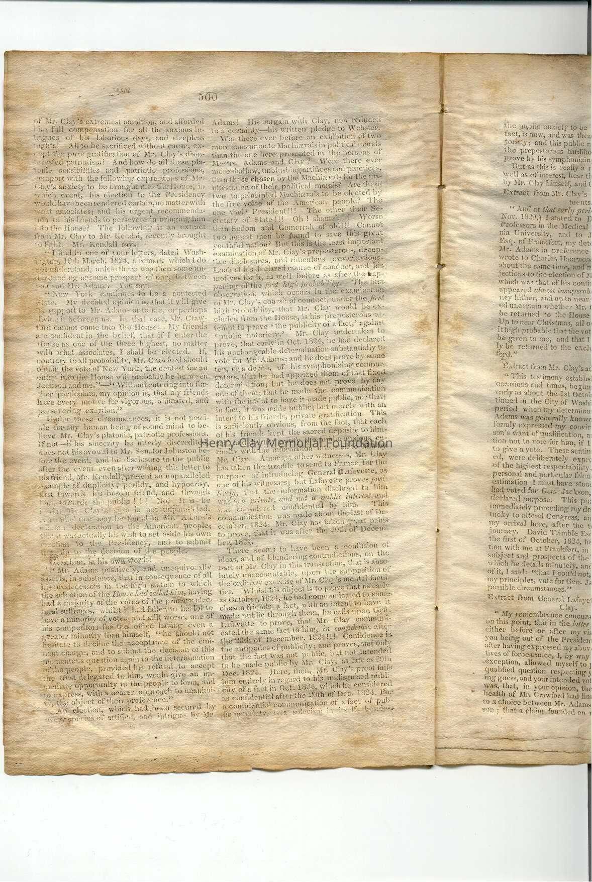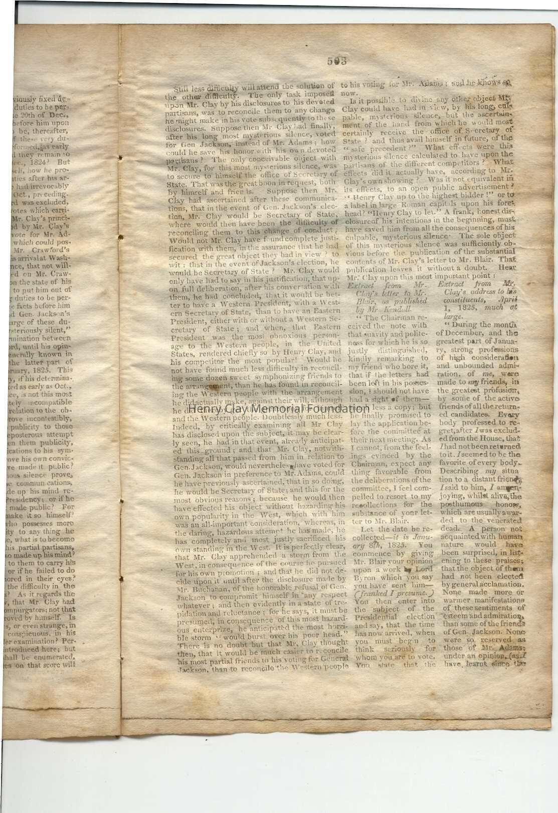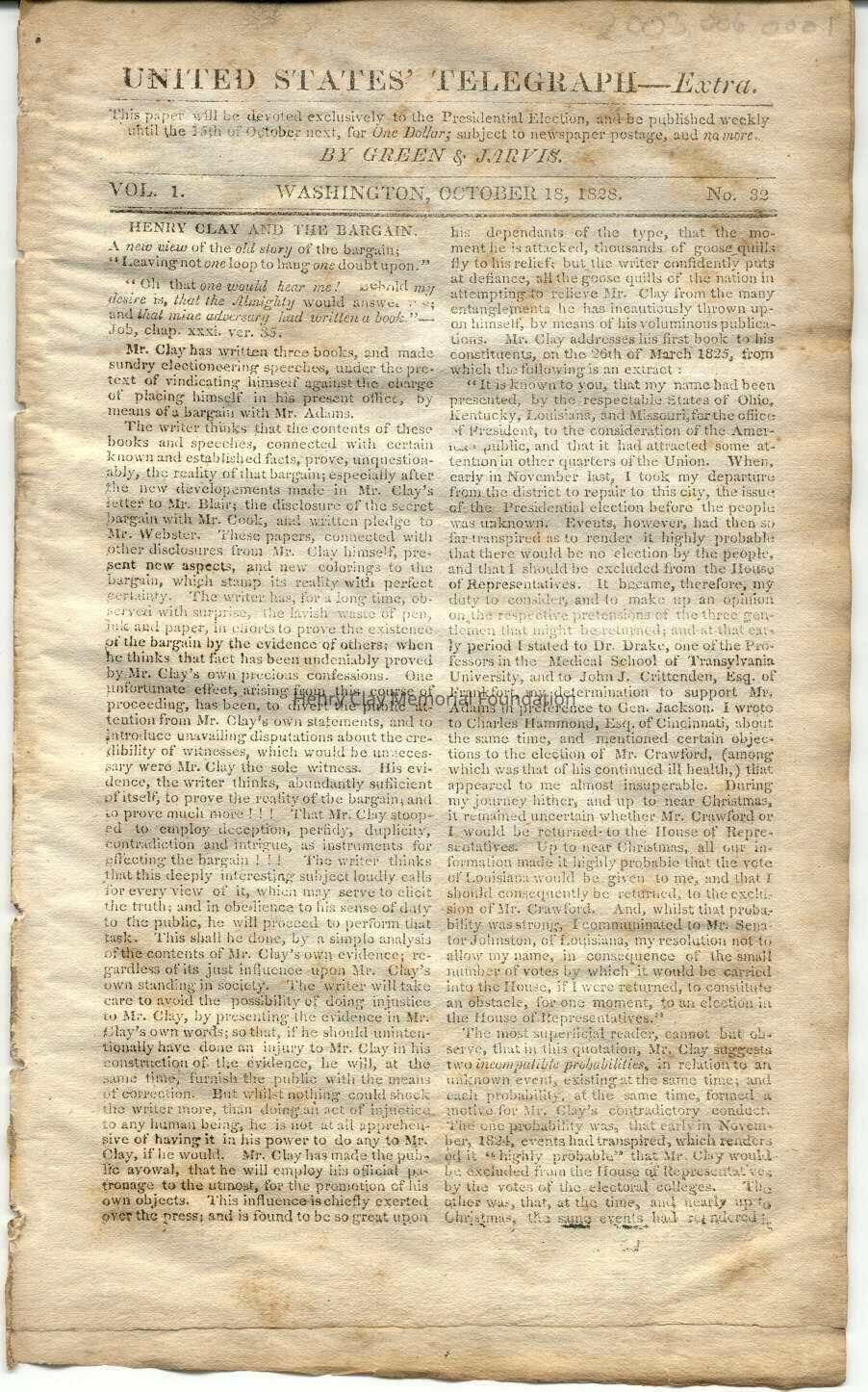 An article written to refute Henry Clay's claims of the nonexistence of a "Corrupt Bargain" between Clay and John Quincy Adams to throw the 1824 presidnetial election to Adams in exchange for the office of Secretary of State.