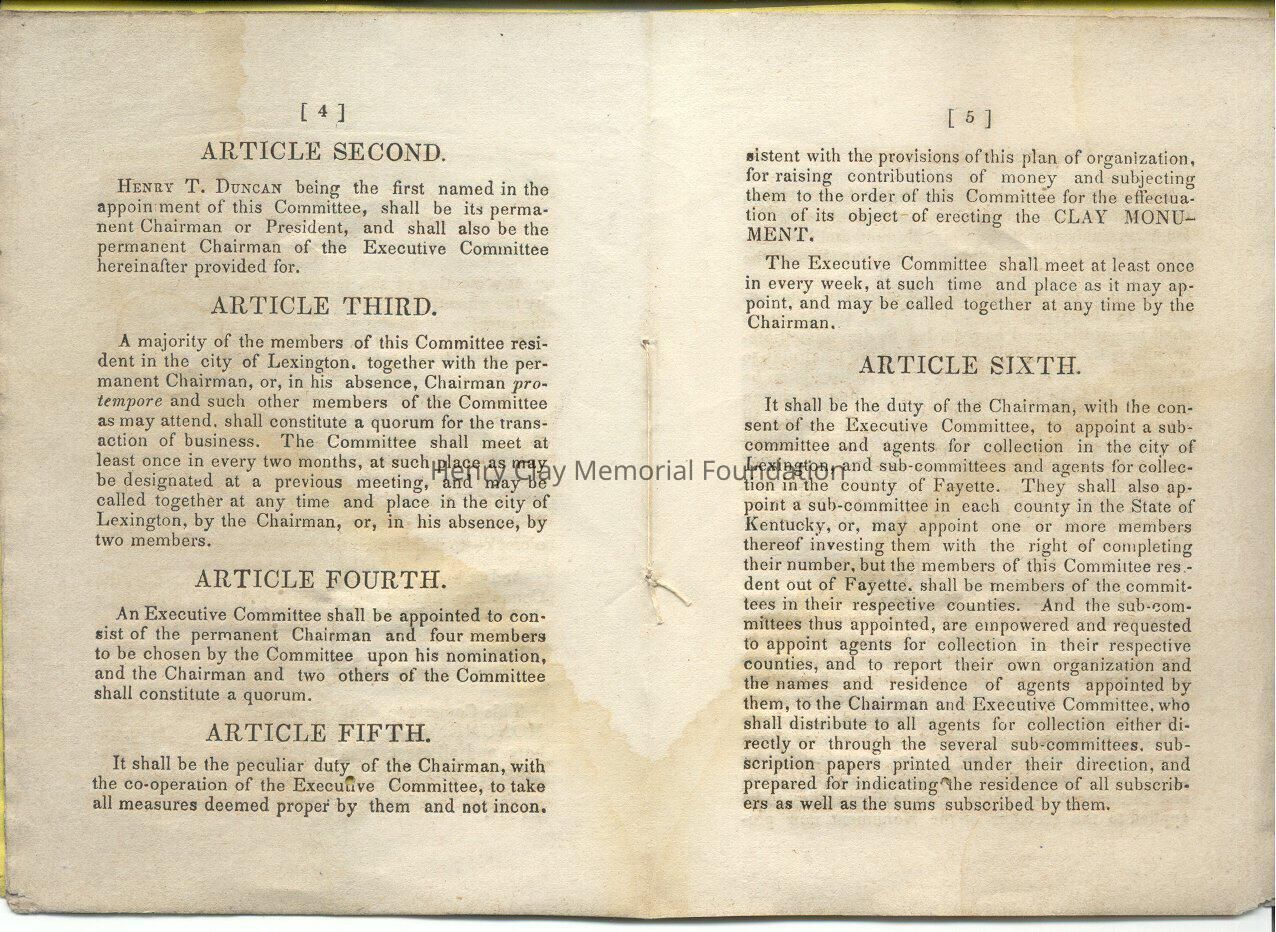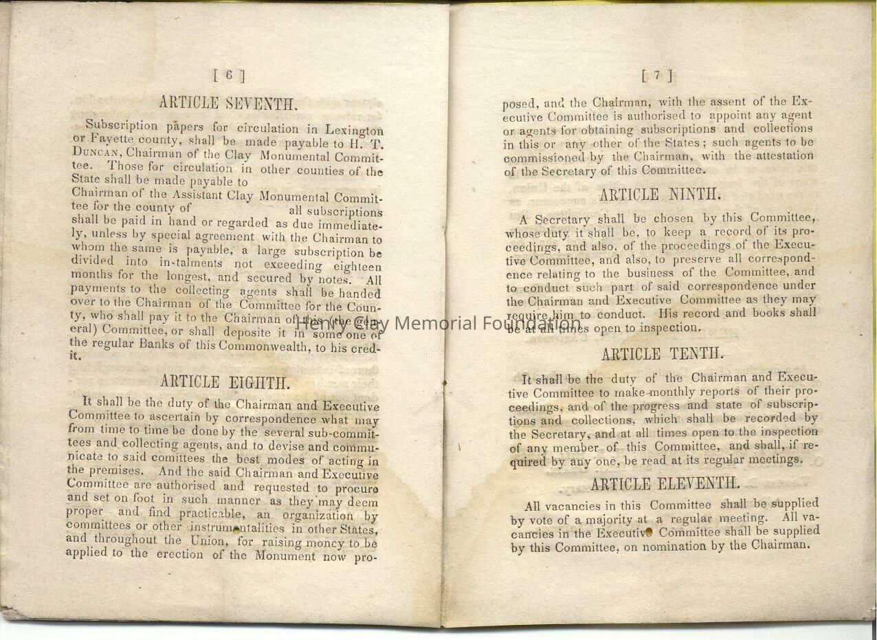 This booklet was distributed to those involved in the Clay Monument Association and laid out how they would operate to achieve the goal of constructimg the monument to Henry Clay in the Lexington Cemetery.
