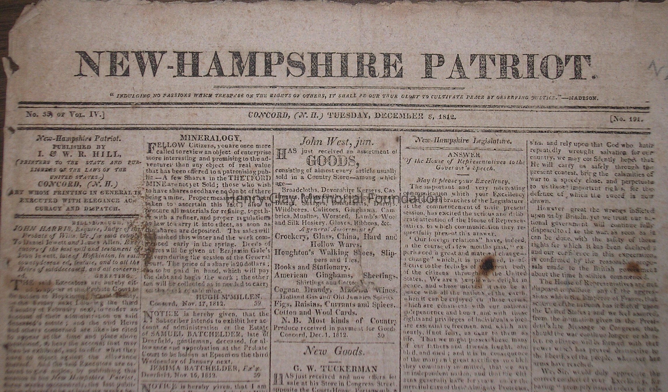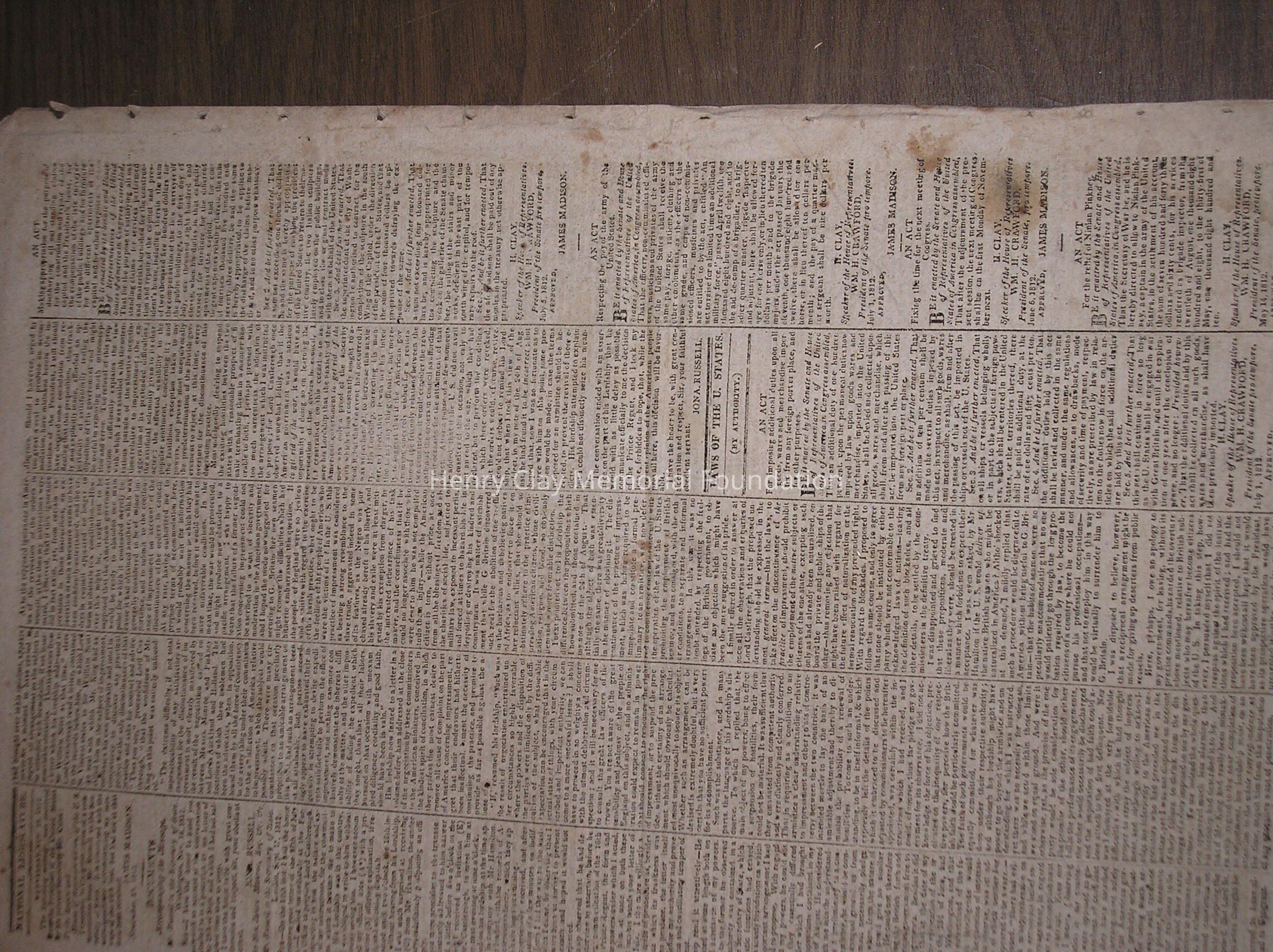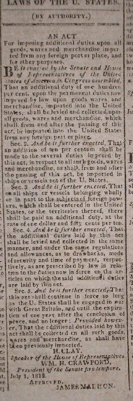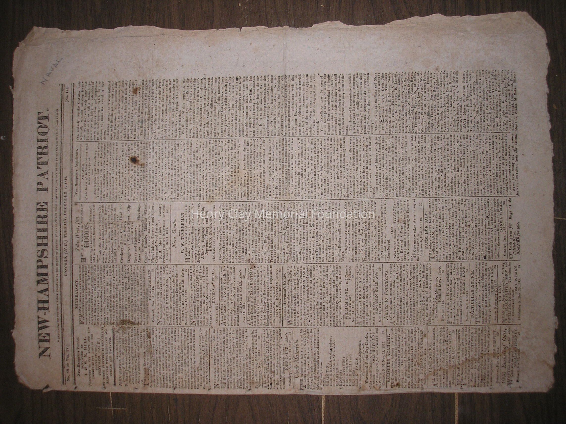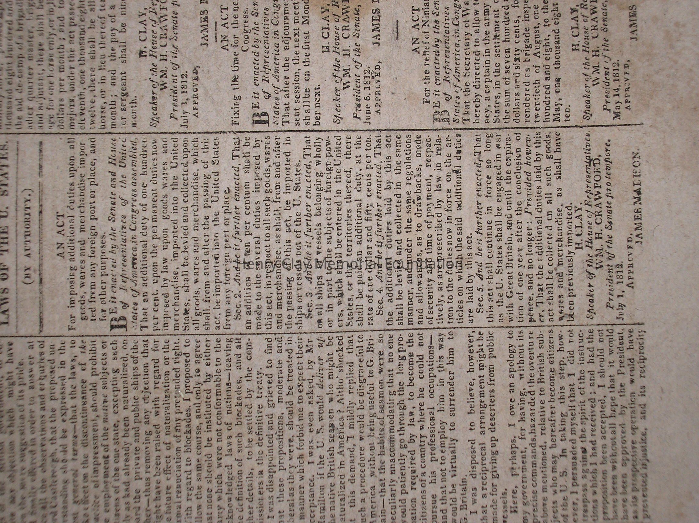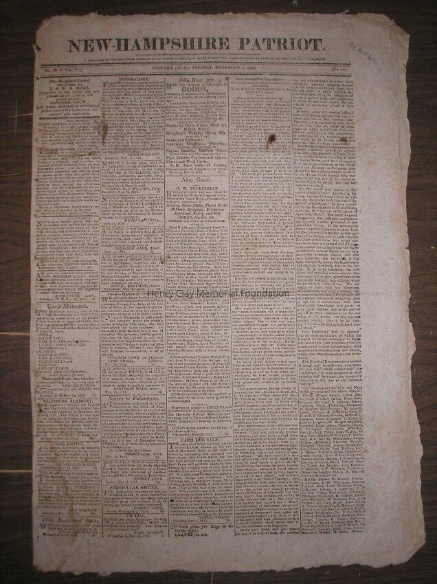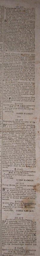 A New Hampshire Patriot newspaper containing historical information on the War of 1812. The paper contains several congressional acts bearing House Speaker Henry Clay's signature.