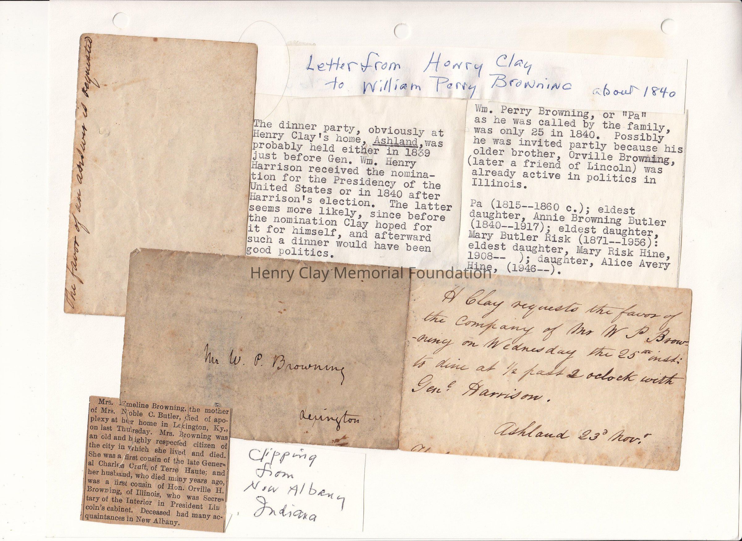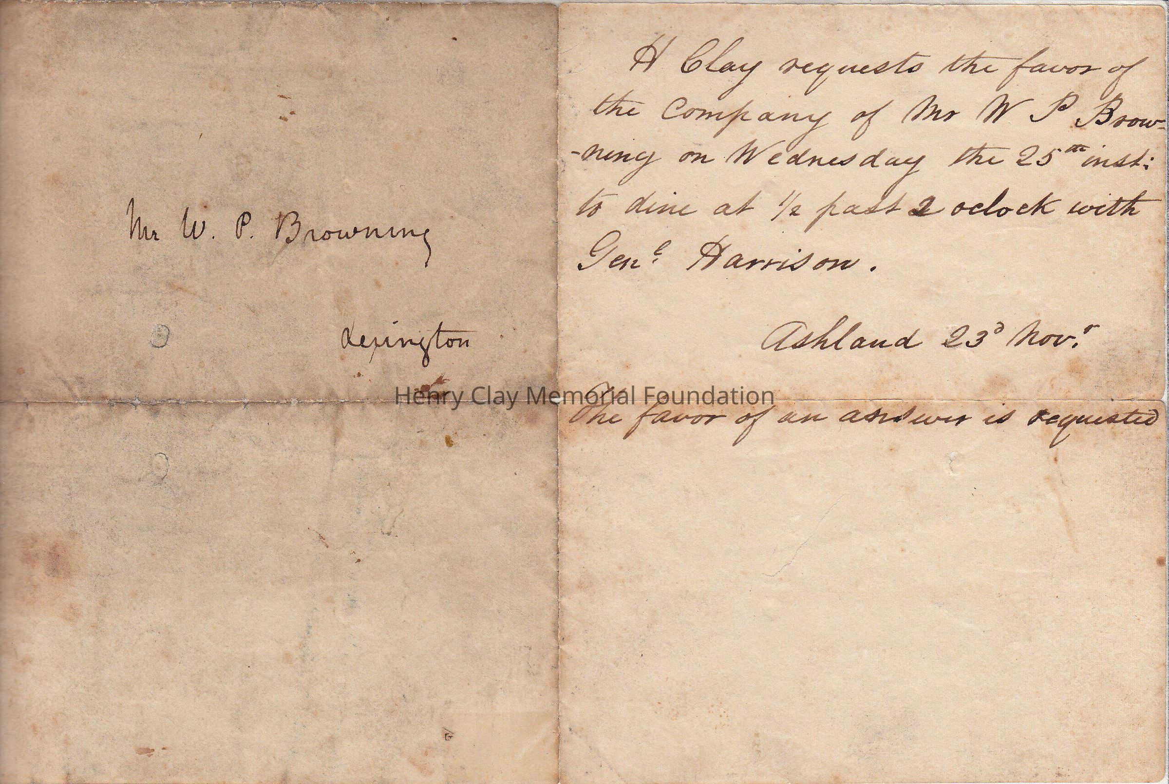 An invitation to W.P. Browning for dinner with General William Henry Harrison at Ashland on November 25, 1840 at 2:30pm.