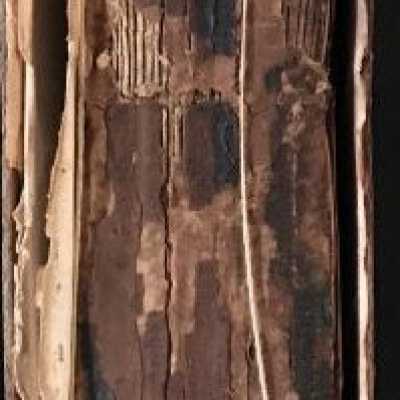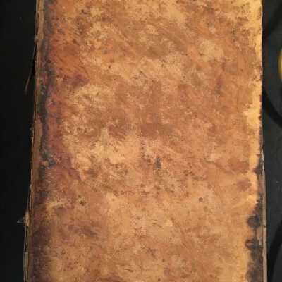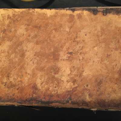 Leather bound, spine is mostly gone, cover is burned in a few spots, cover is almost detached from book.