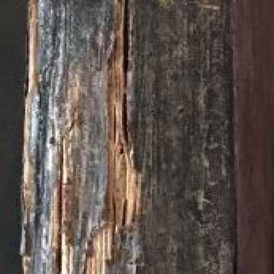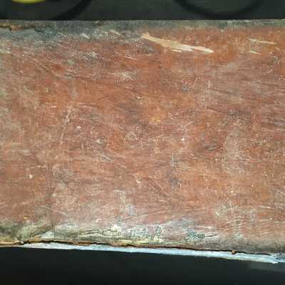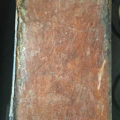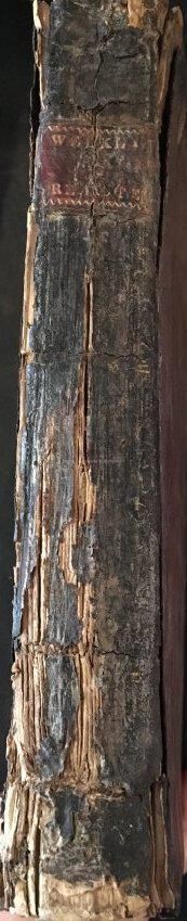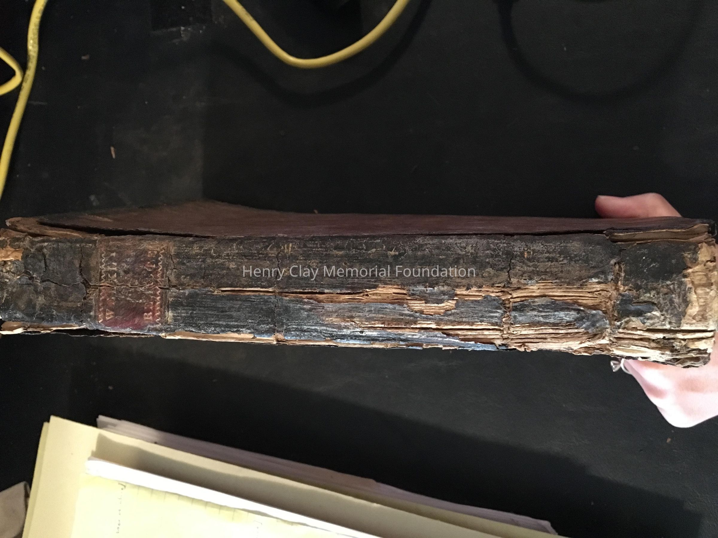 Cover is damaged by fire. The top is uplifted. Spine is black and cracking, with parts missing.