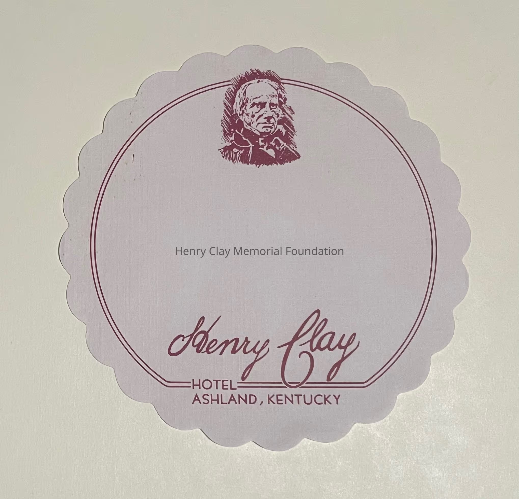 a white, scallop-edged coaster with red detailing from the Henry Clay Hotel in Ashland, Kentucky.