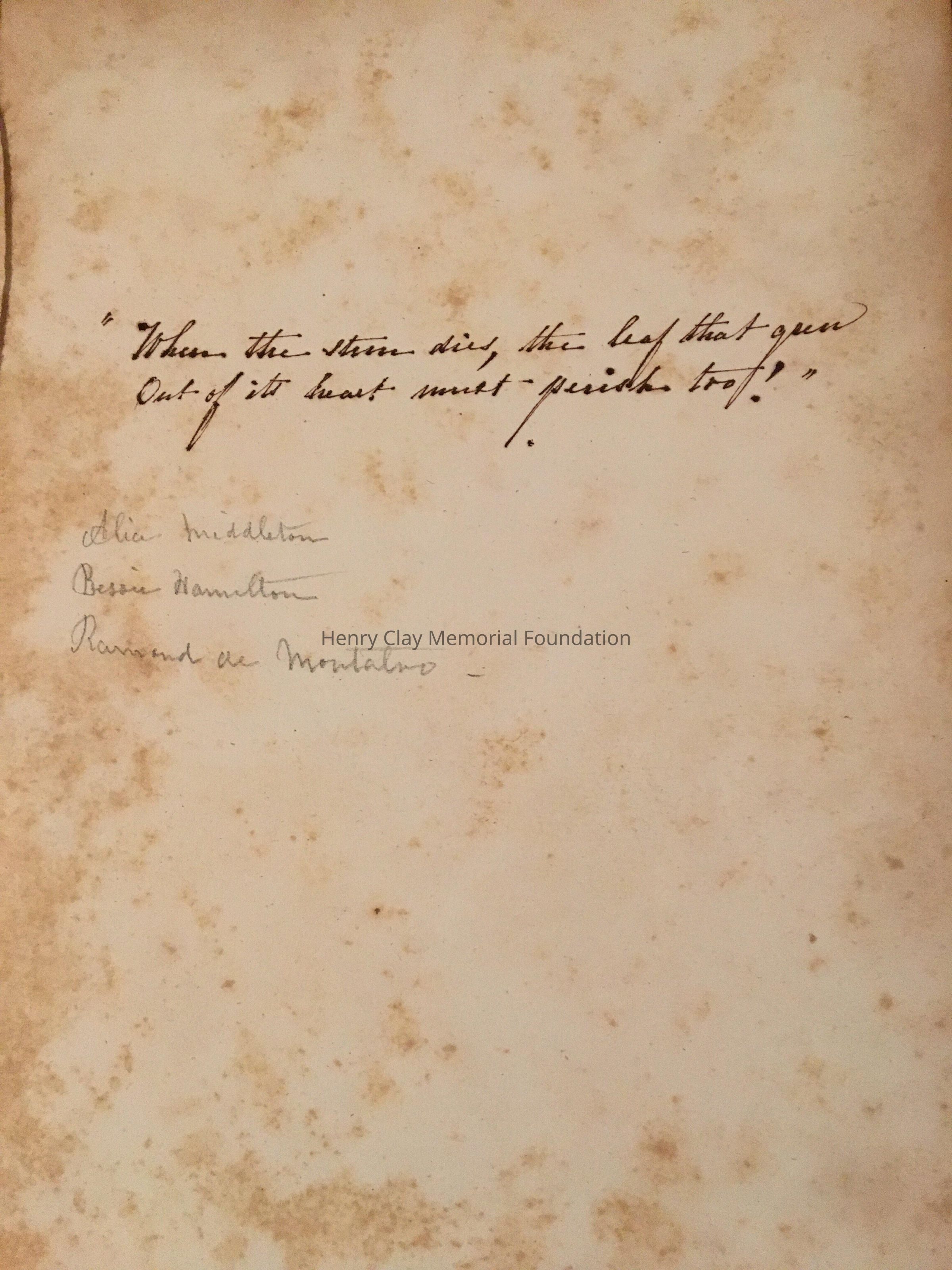 On another page " When the stem dies, the leaf that grew out of its heart must perish too" below in pencil "Alice Middleton, Bessie Hamilton, Ramond de Montalna(?)"