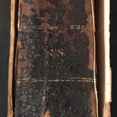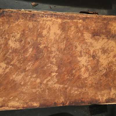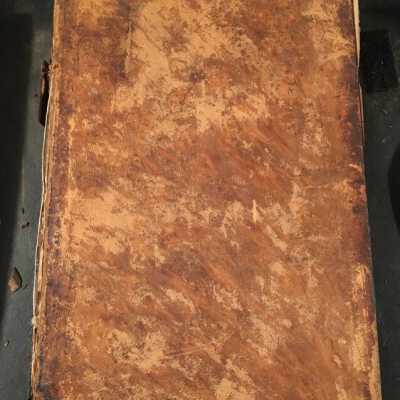 Leather cover. Spine is black, cracking, and is all shivreled up.