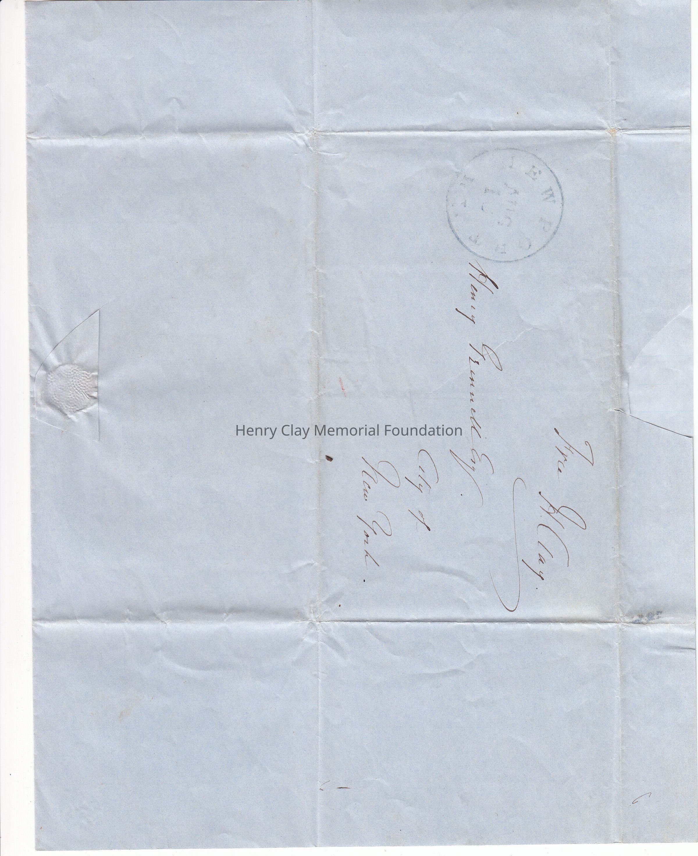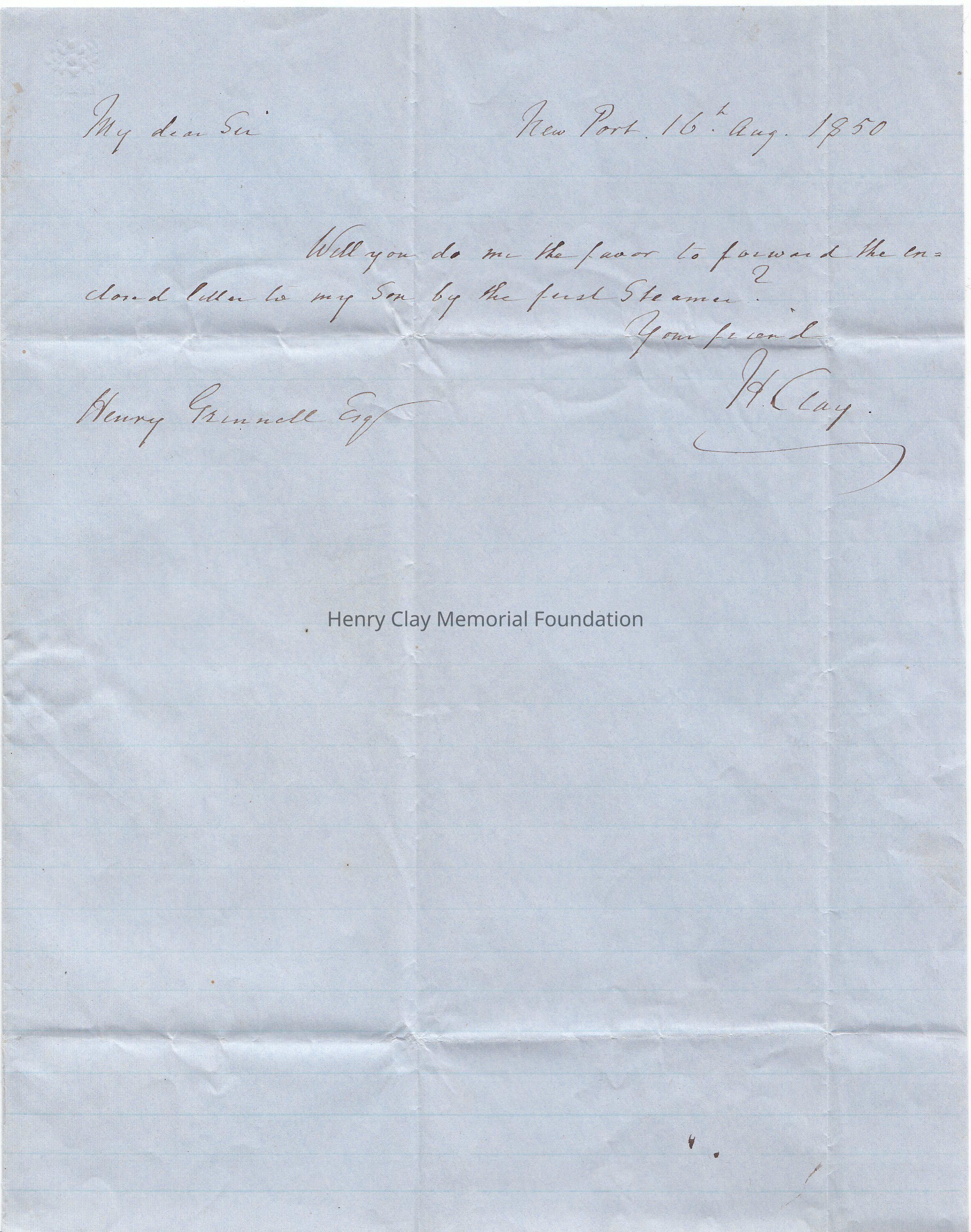 A letter from Henry Clay to Henry Grinnell, August 16, 1850. Clay requests that Grinnel, a shipping merchant, forward a letter to his son James B. Clay, who serves as the U.S.Charge'd'affair in Portugal.