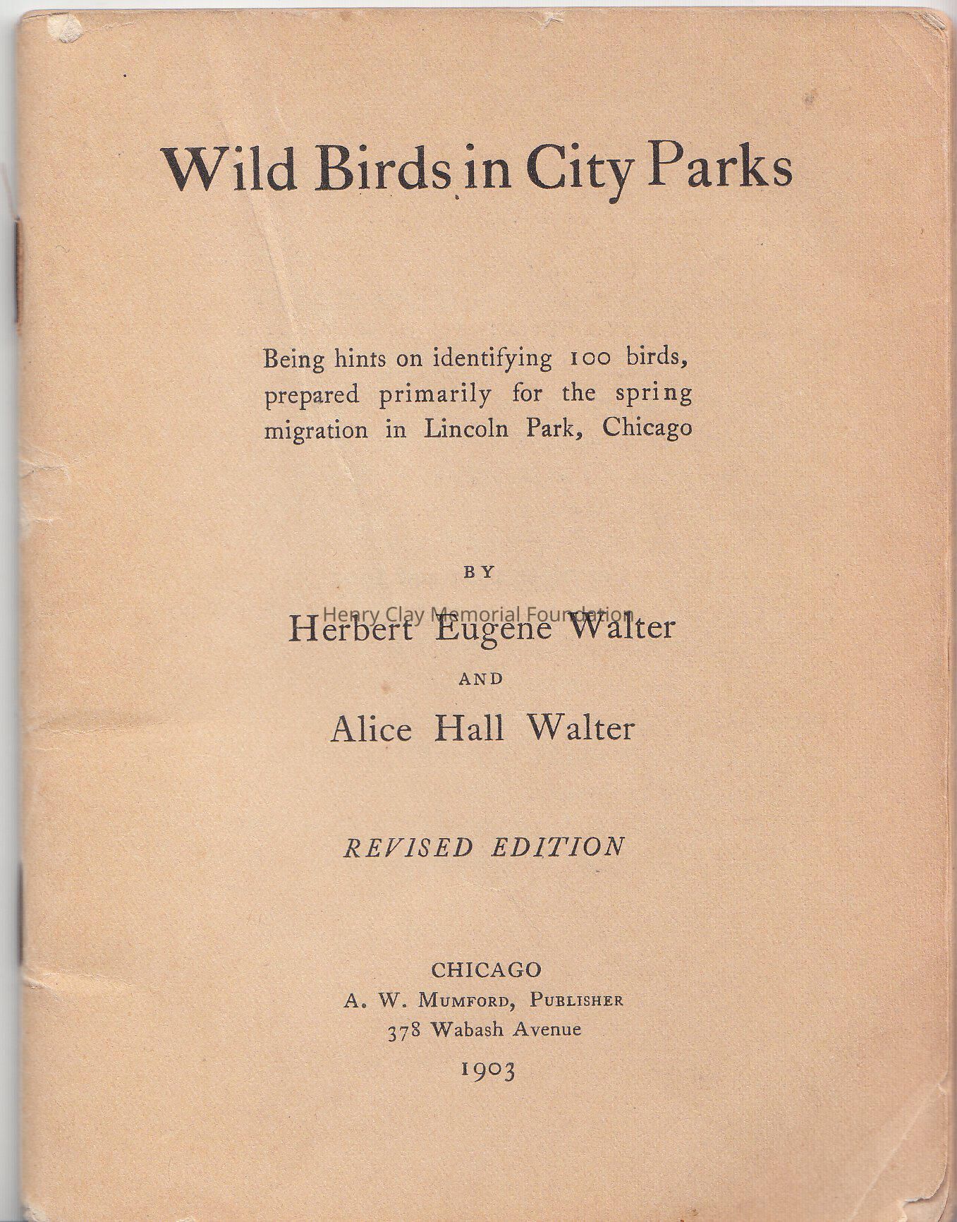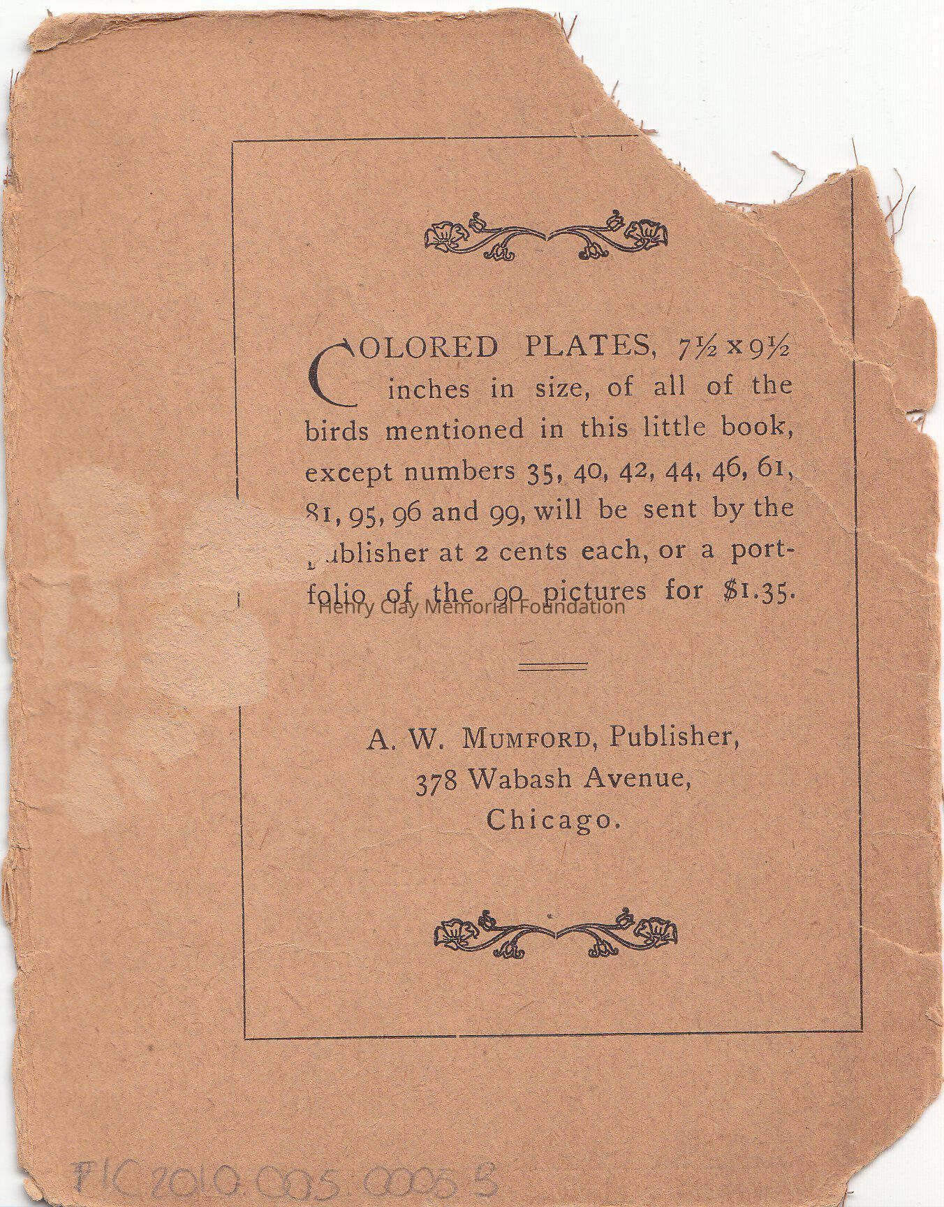 A booklet to help identify 100 birds, called " Wild Bords in City Parks" by Herbert Eugene Walter and Alice Hall Walter. Revised Edition Chicago. A.W.Mumford, publisher 378 Wabash Avenue, 1903. On the rear cover it is advertised that all of the colored plates of the birds listed in the book, can be ordered at 2 cents each, or 1.35$ for 90 pictures.