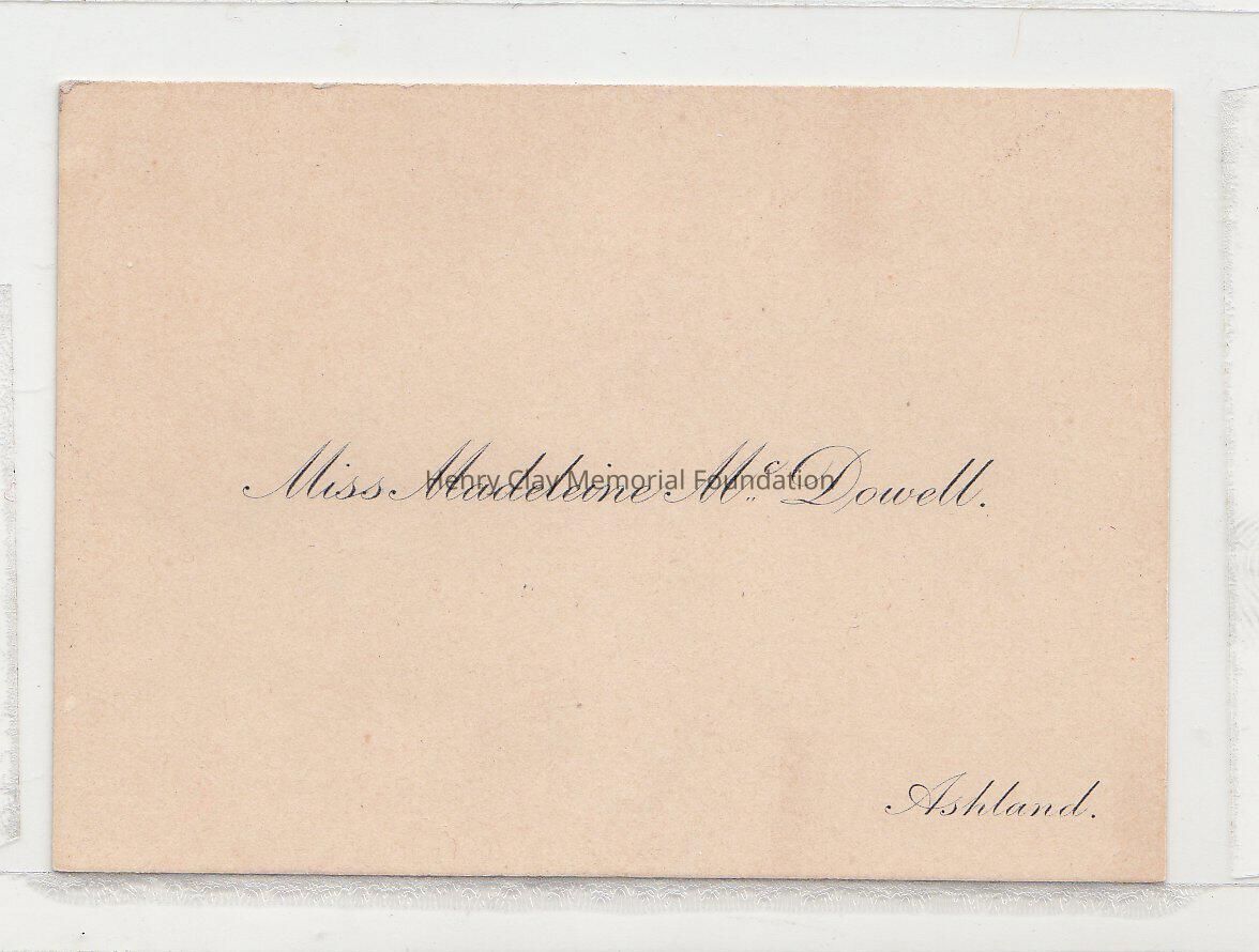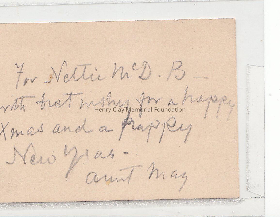 A calling card from Miss Madeleine McDowell, Ashland In the rear an handwritten note " For Nettie McD.B with great wishes for a happy Xmas and a happy New Year. Aunt Mag"