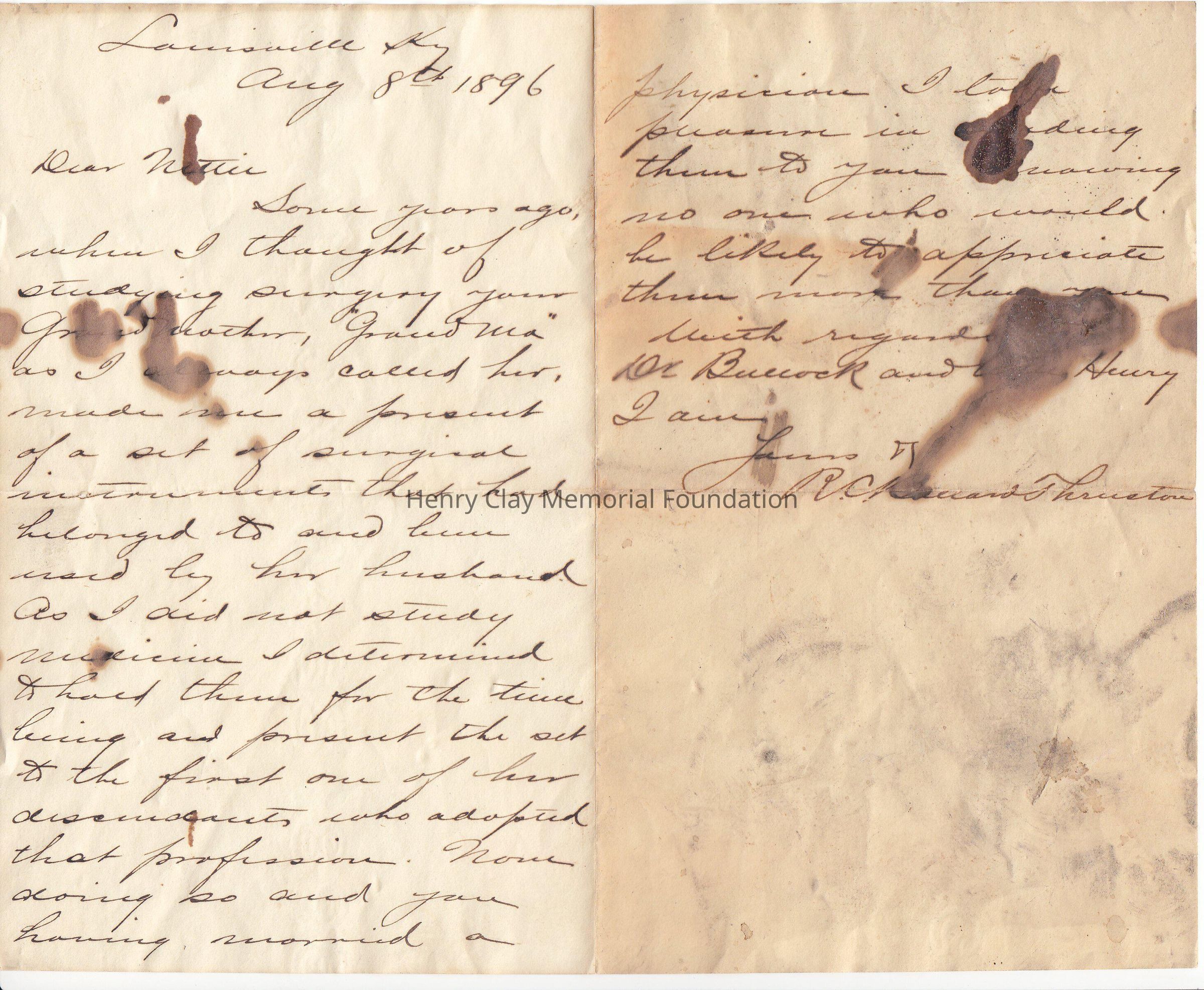 A letter to Nanette Bullock from R.C Ballard Thruston, august 8 1896. The letter seems telling Nettie about Ballard studying and professional goals.