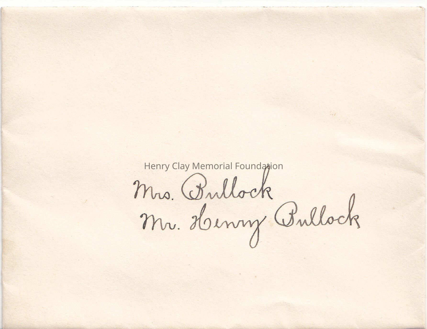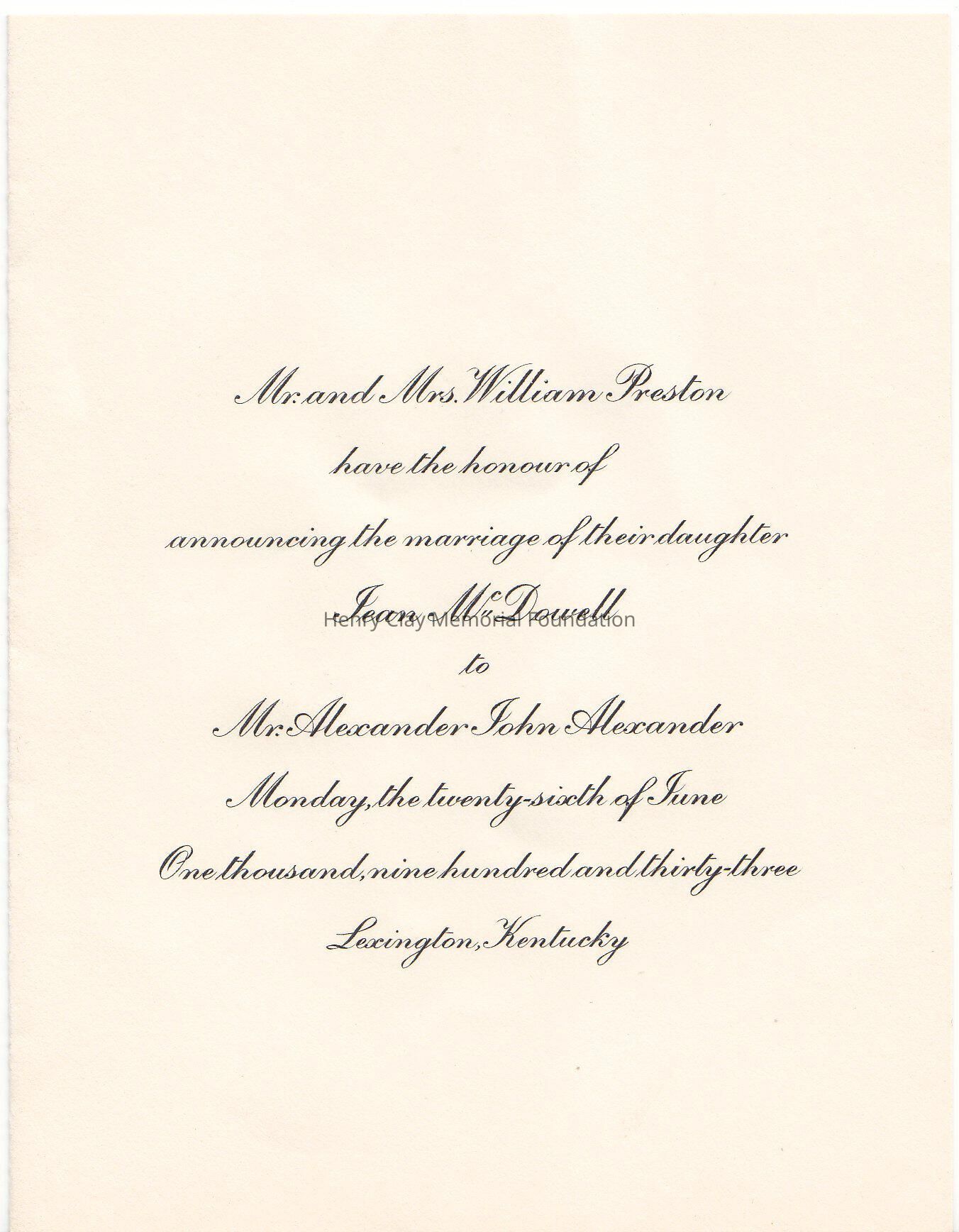 Wedding invitation mailed to Mrs. Bullock and Mr. Henry Bullock The invitation is for Jean McDowell to Alexander John Alexander on monday the 26th of June 1933, in Lexington Ky.