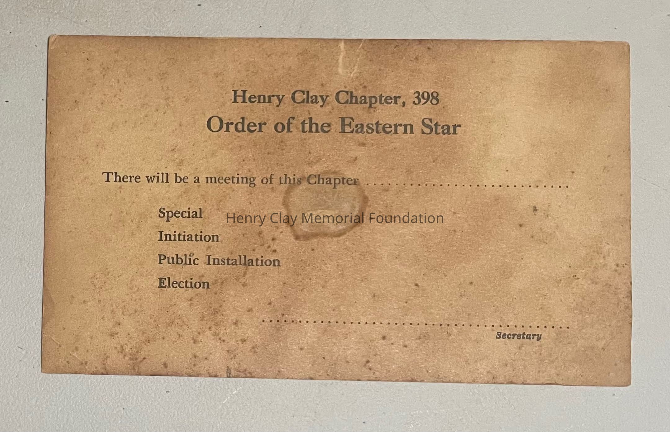 a blank postcard invitation to a meeting of the henry clay chapter of the order of the eastern star
