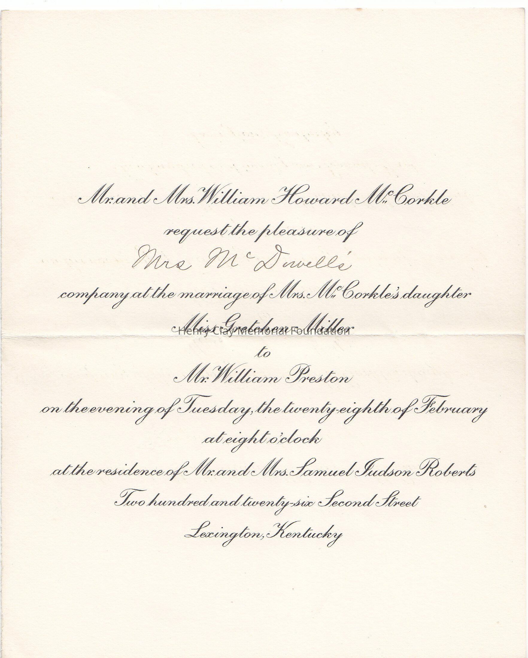 Mr. and Mrs. William Howard M. Corkle request the company of Mrs. McDowell (in pen) company at the marriage of Mrs M.Corkle daughter Miss Gretchen Miller to William Preston on the evening of Tuesday 28th february at 8 o'clock at the residence of Mr. and Mrs. Samuel Roberts, 226 seconf street Lexington, Ky