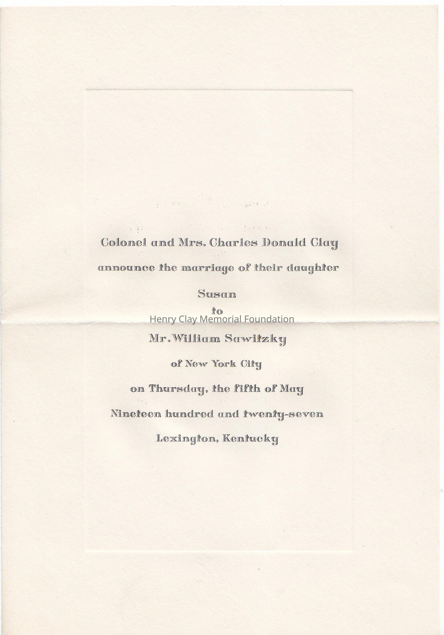 Colonel and Mrs. Charles Donald Clay announce the marriage of their daughter Susan to Mr. William Sawitzky of New York City on Thursday, the fifth of May 1927, Lexington Kentucky