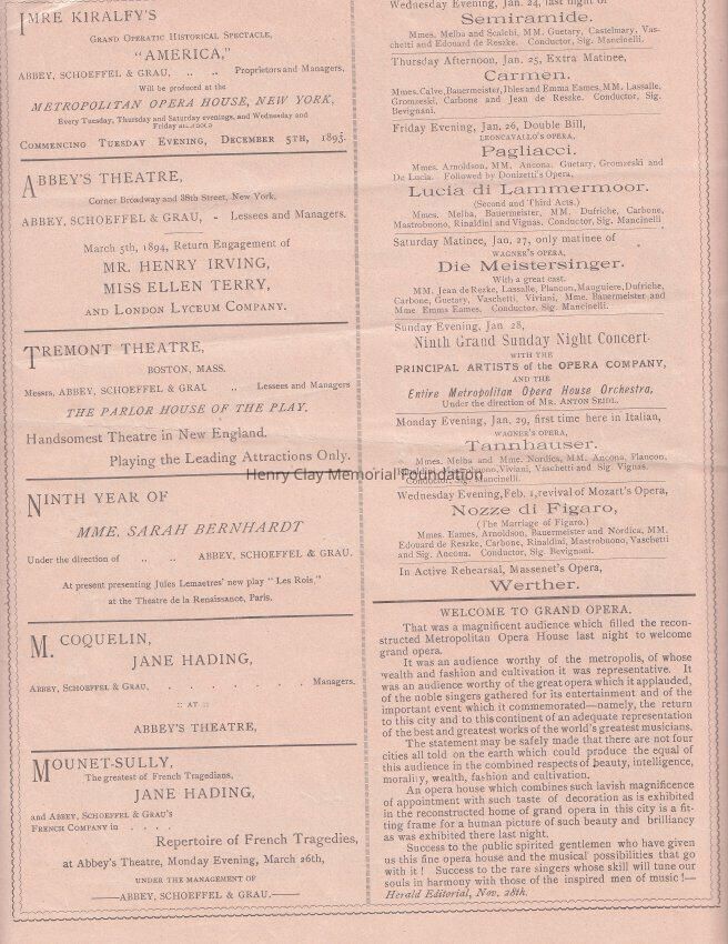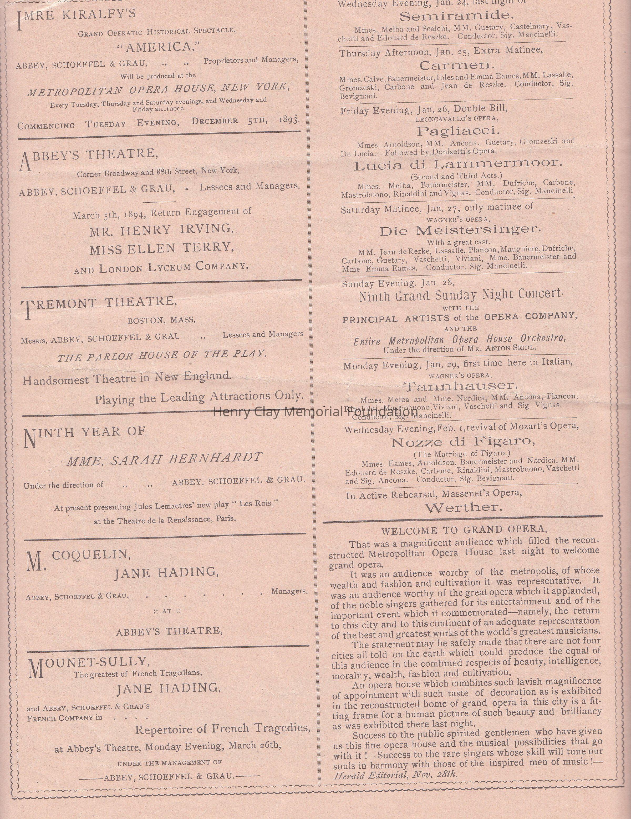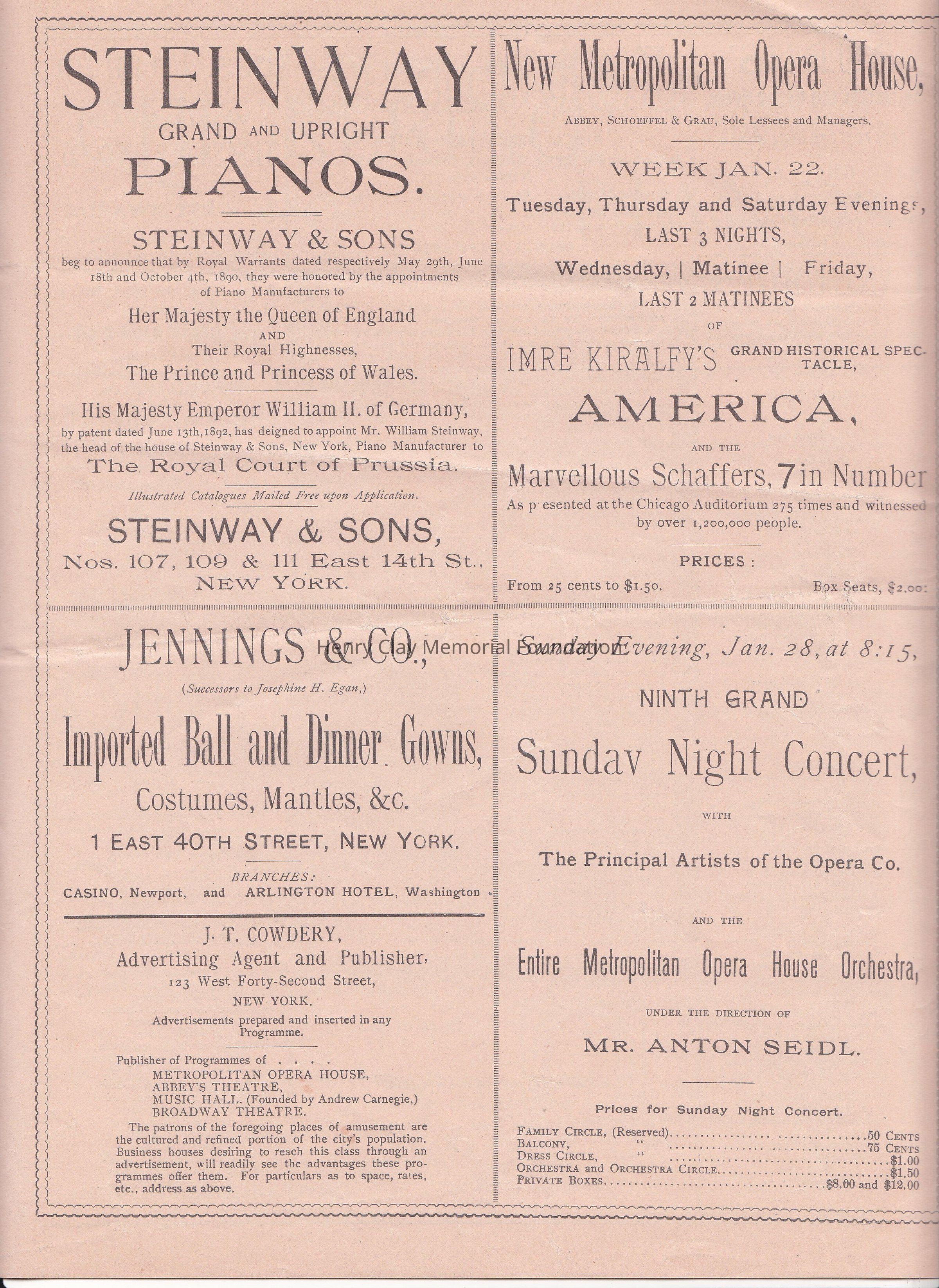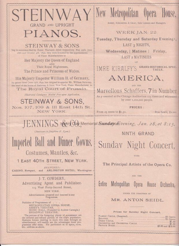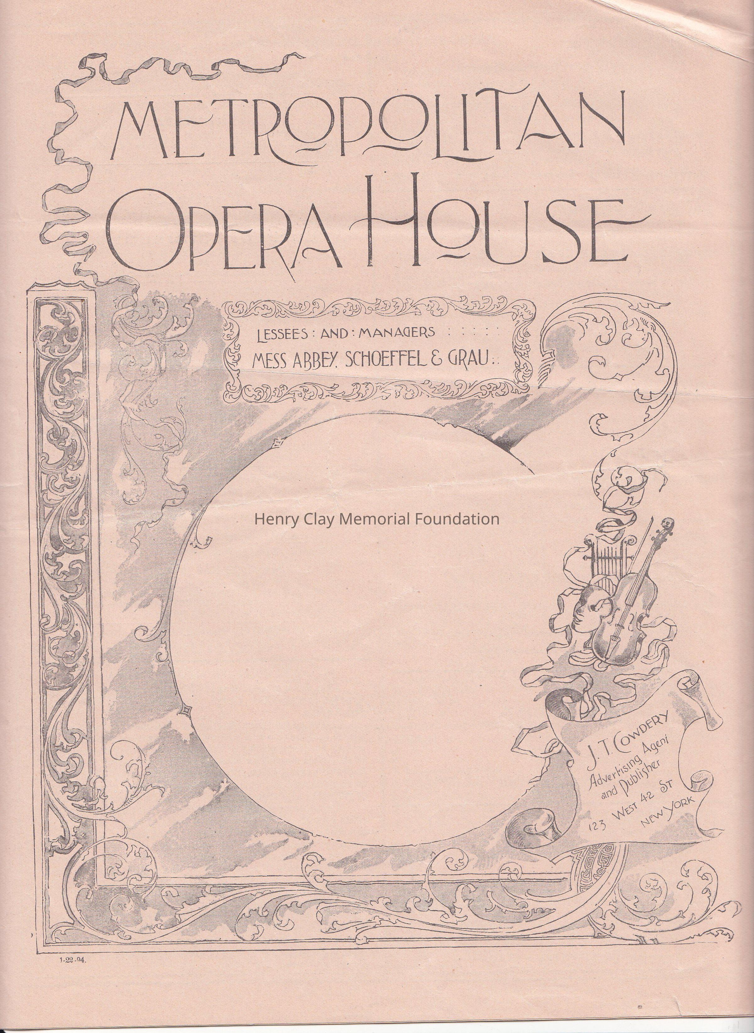 A program of the Metropolitan Opera House. Lesses and managers Mess Abbey Schoeffel & Grau J.T. Cowdery Advertising Agent and Publisher 123 West 42 St. New York.