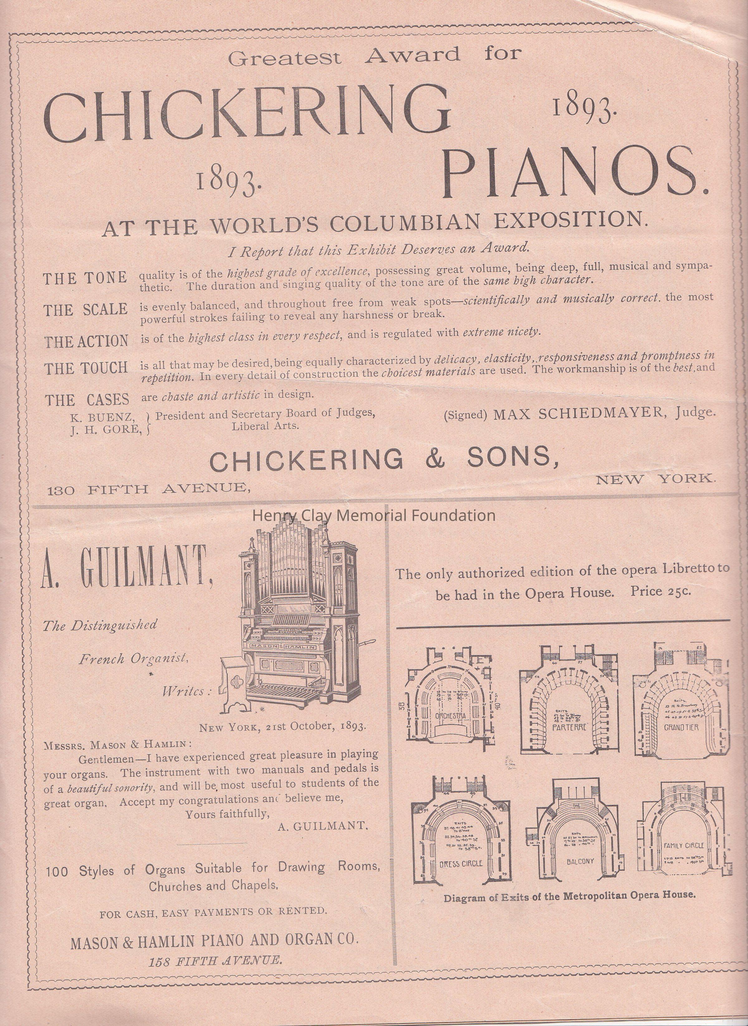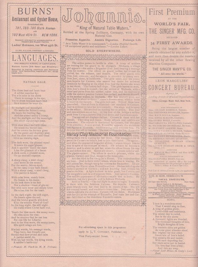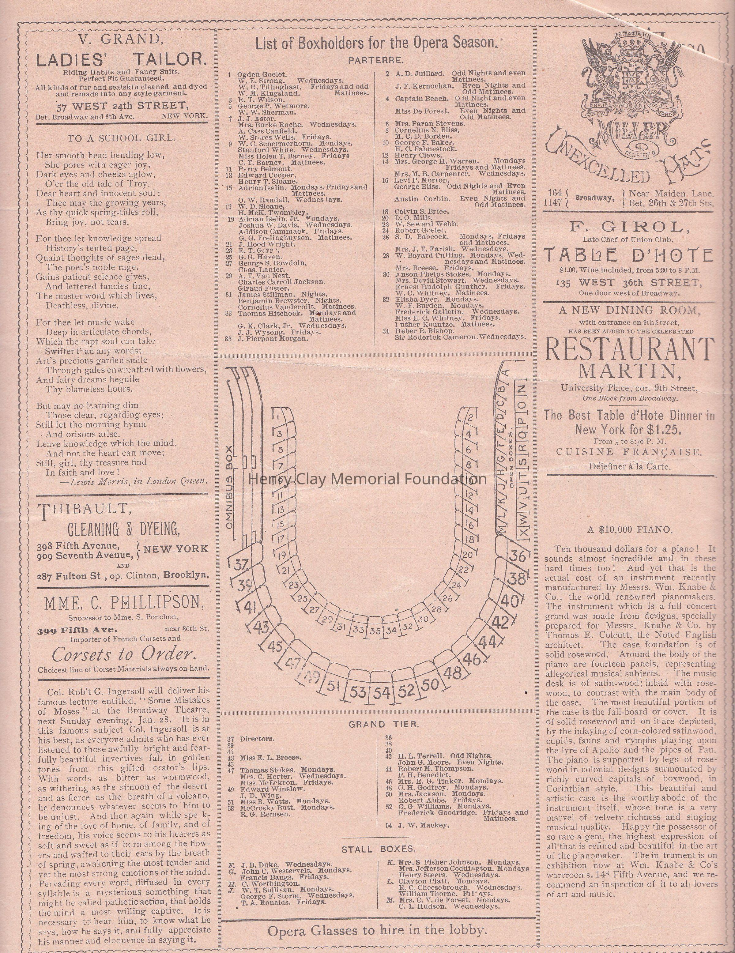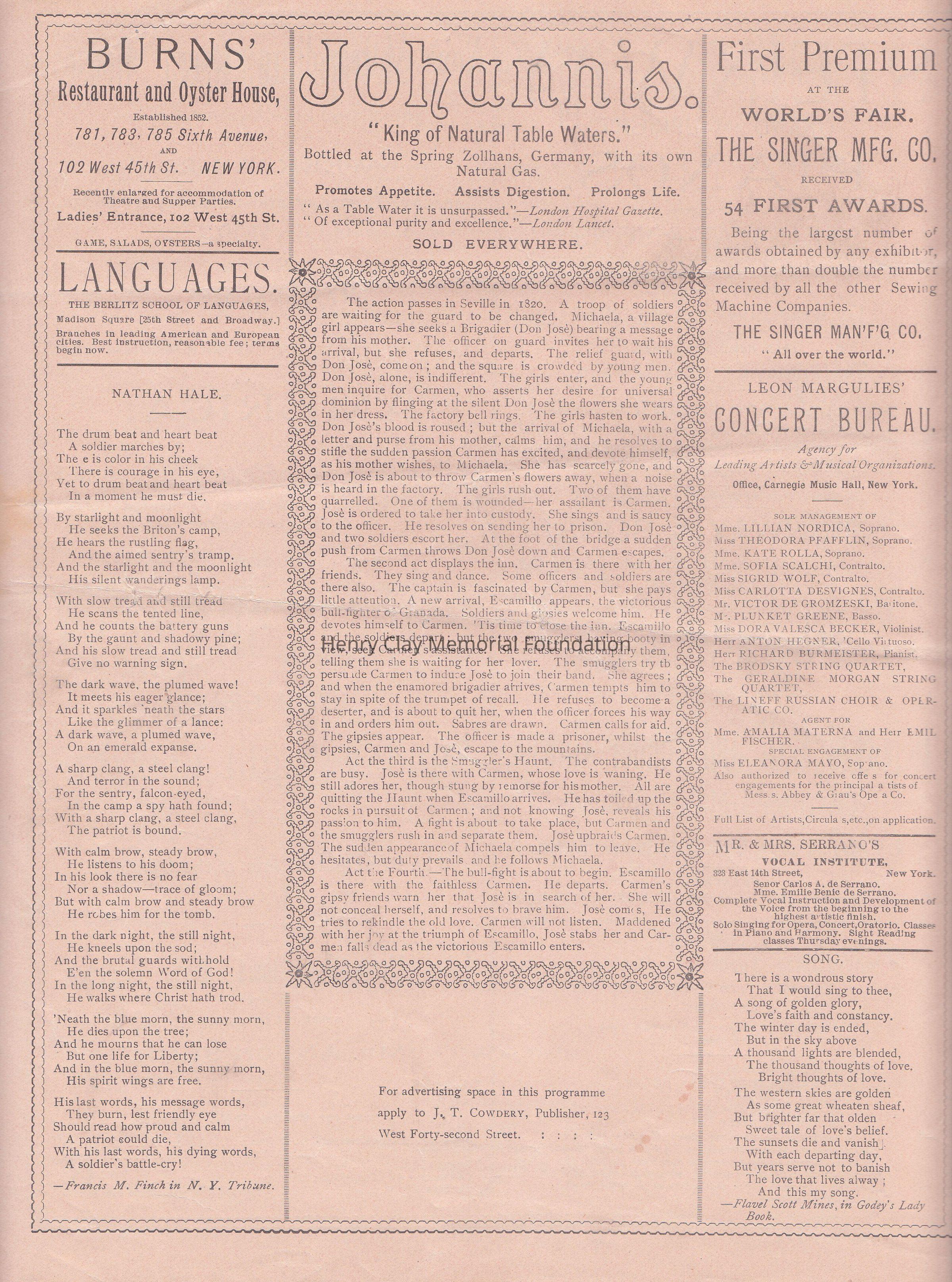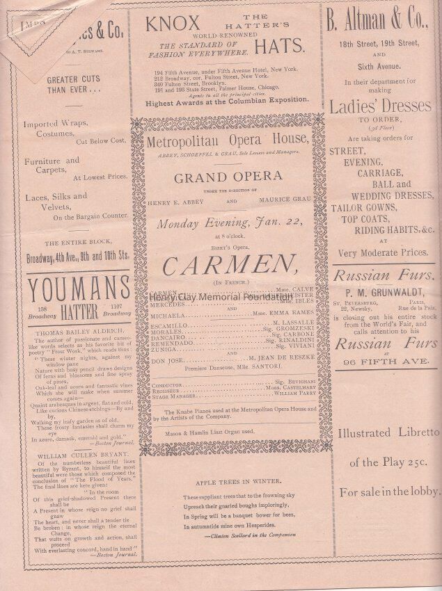 A program of the Metropolitan Opera House. Lesses and managers Mess Abbey Schoeffel & Grau J.T. Cowdery Advertising Agent and Publisher 123 West 42 St. New York.