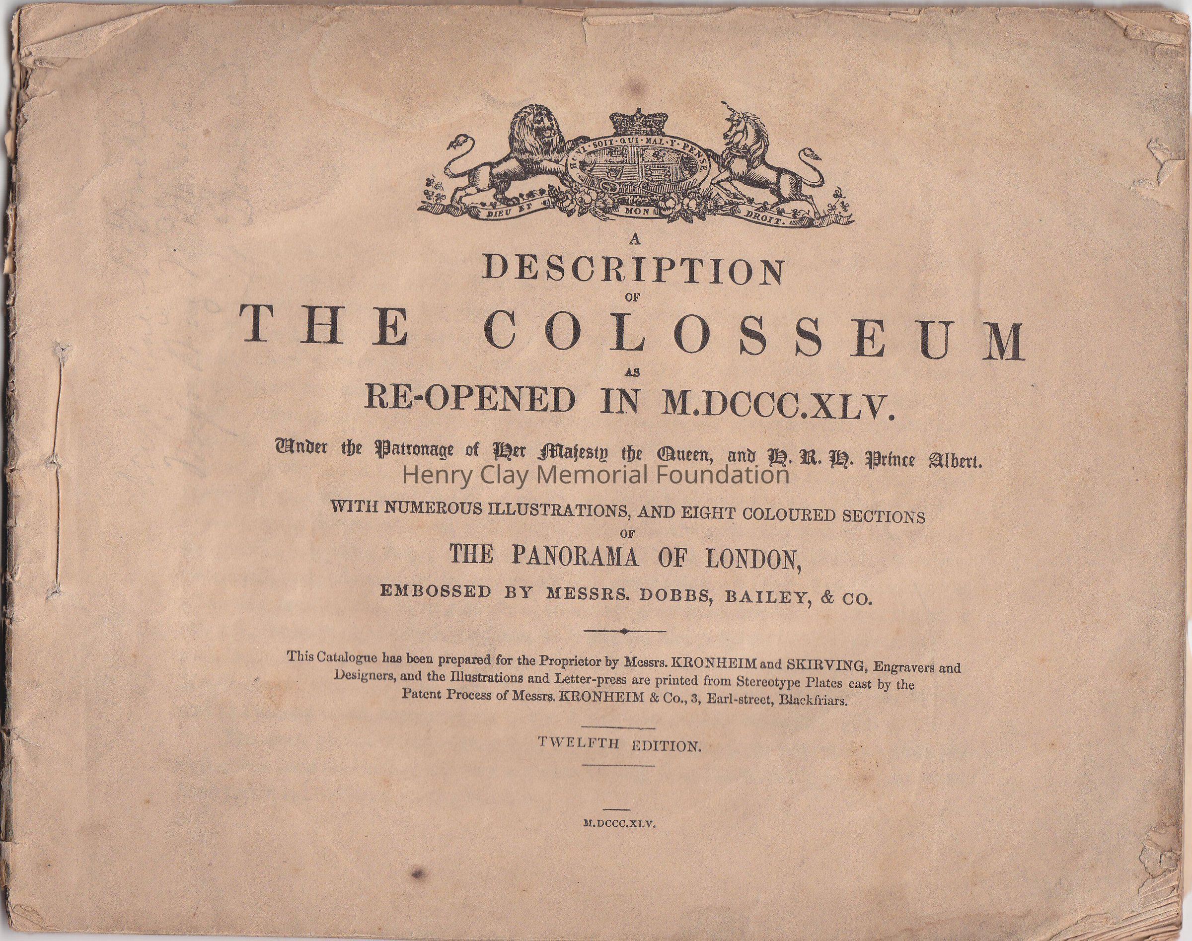 First cover " A description of the Colosseum Re opened in M.DCCC.XLV under the patronage of Her Majesty the Queen and H.R.H Prince Albert, with numerous illustrations and eight coloured sections of the Panorama of London embossed by Messrs. Dobbs, Bailey, & Co.
