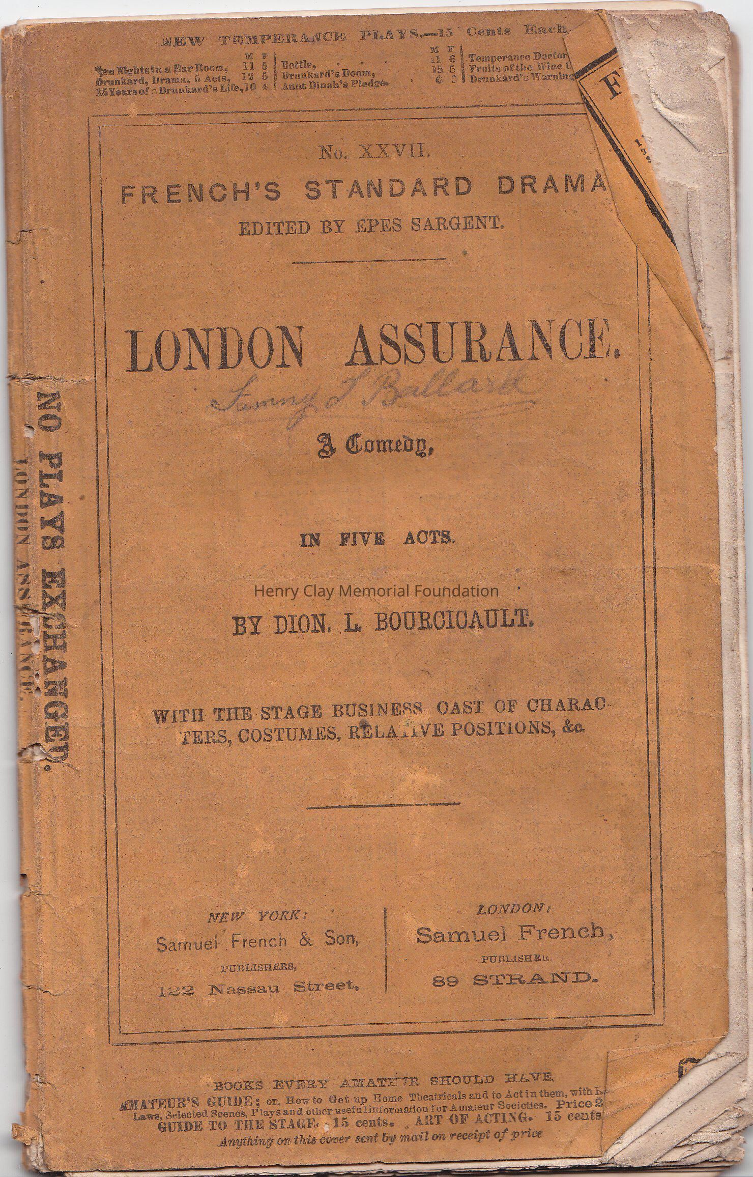On the front cover " No.XXVII French's Standard Drama Edited by Epes Sargent. LONDON ASSURANCE A Comedy in Five Acts By DION L.BOURCICAULT.