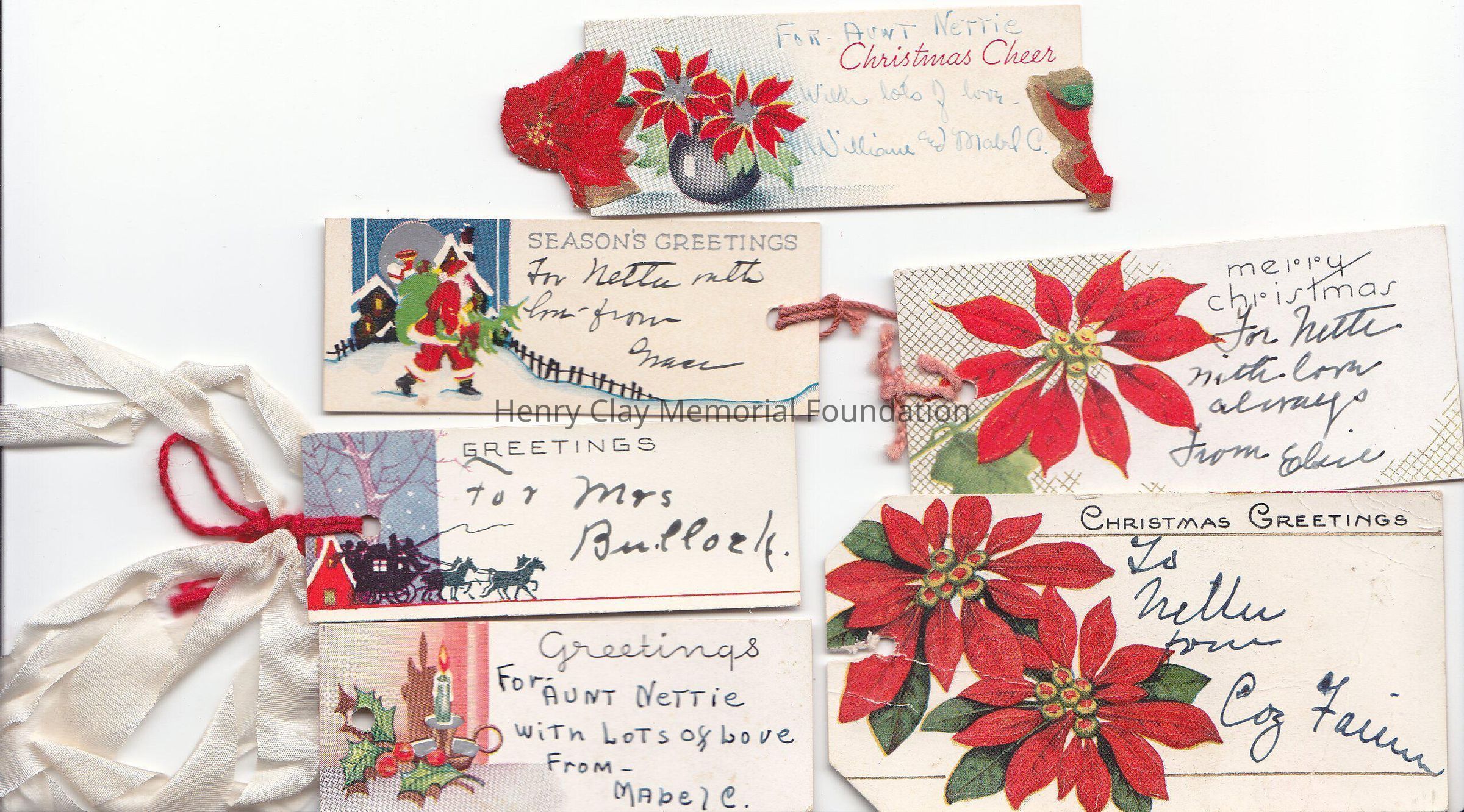Six small Christmas cards all adressed to Nettie. Three have Ponsetta flower, one has a Santa Claus carying a bag of presents, one a house with a charriot in front, and one has a candle with holly.