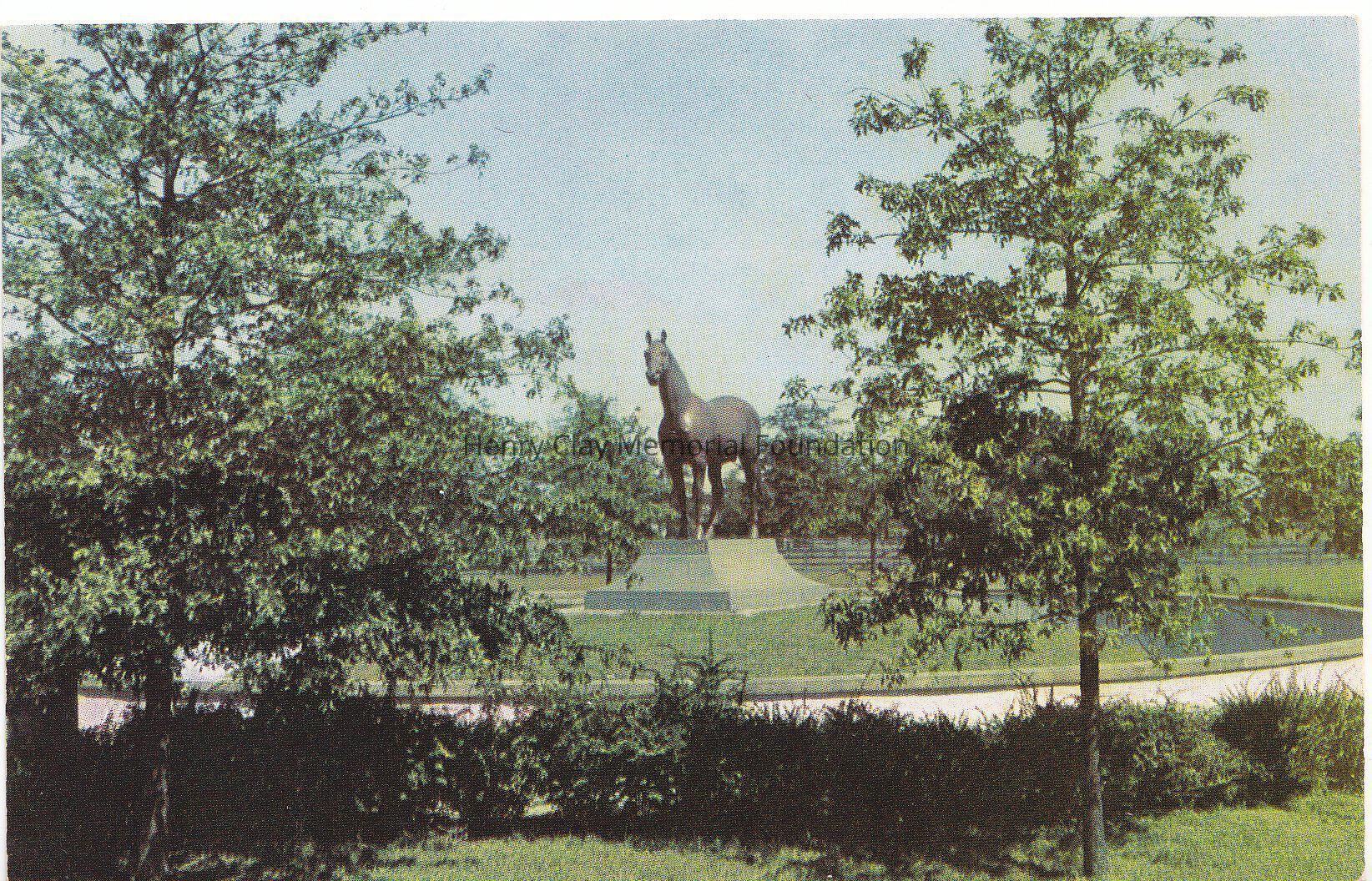 Two identical postcards, colorized, depicting the statue of Man O'War, on Faraway Farm, Lexington Ky. An ektachrome by J.C."skeets" Meadors.