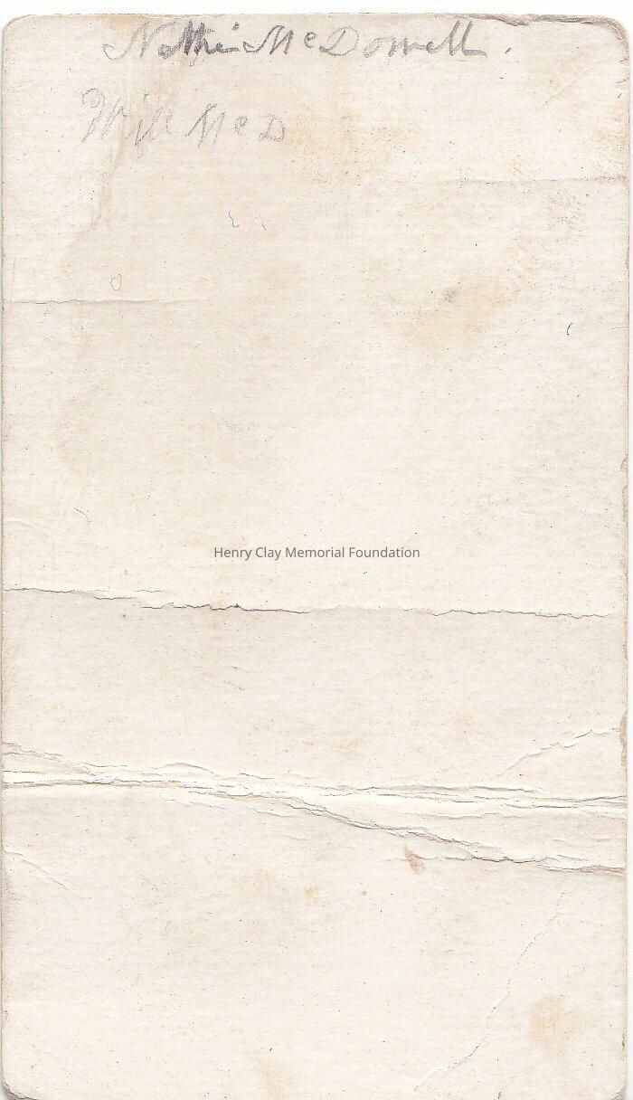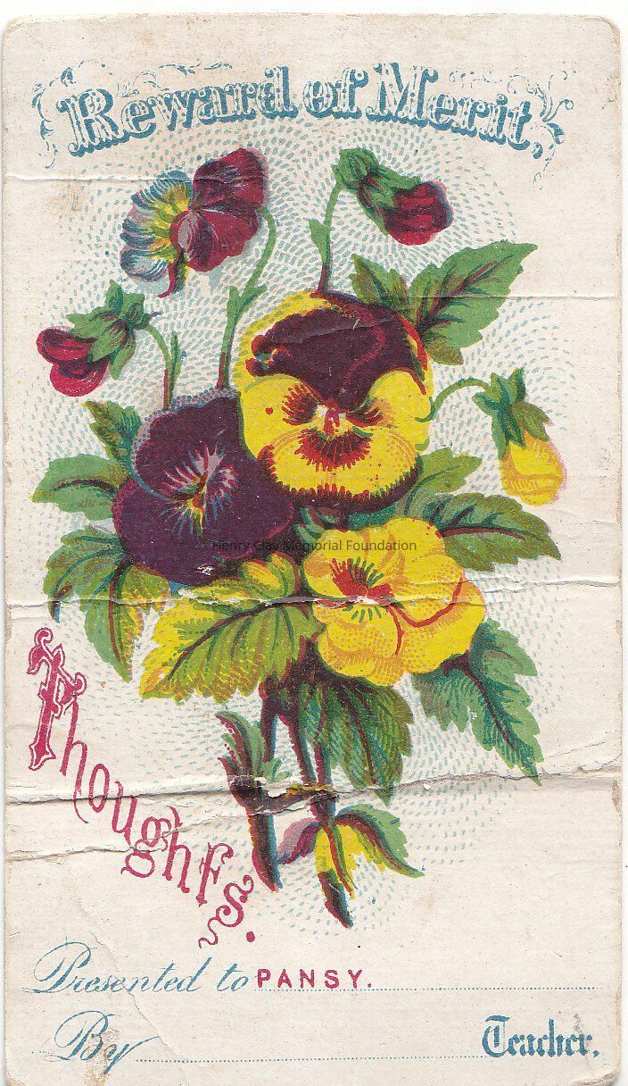 A small card with violets. " Reward of Merit", "Thoughts", "Presented to Pansy By Teacher. behind in pencil "Nettie McDowell"