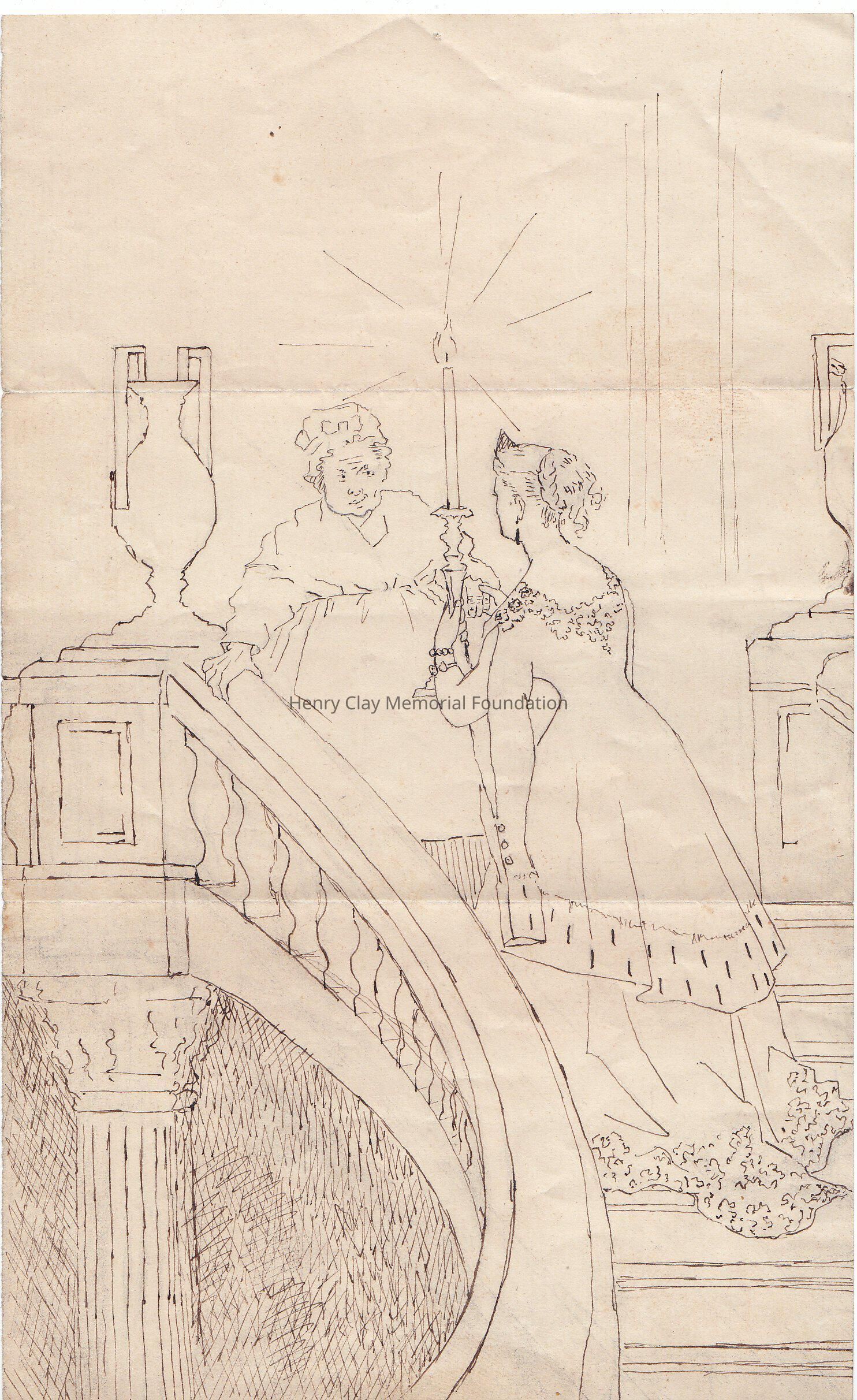 A sketch made in pen. A lady well dressed (1860's) holding a candlestick is met at the top of a nice staircase by the governess.
