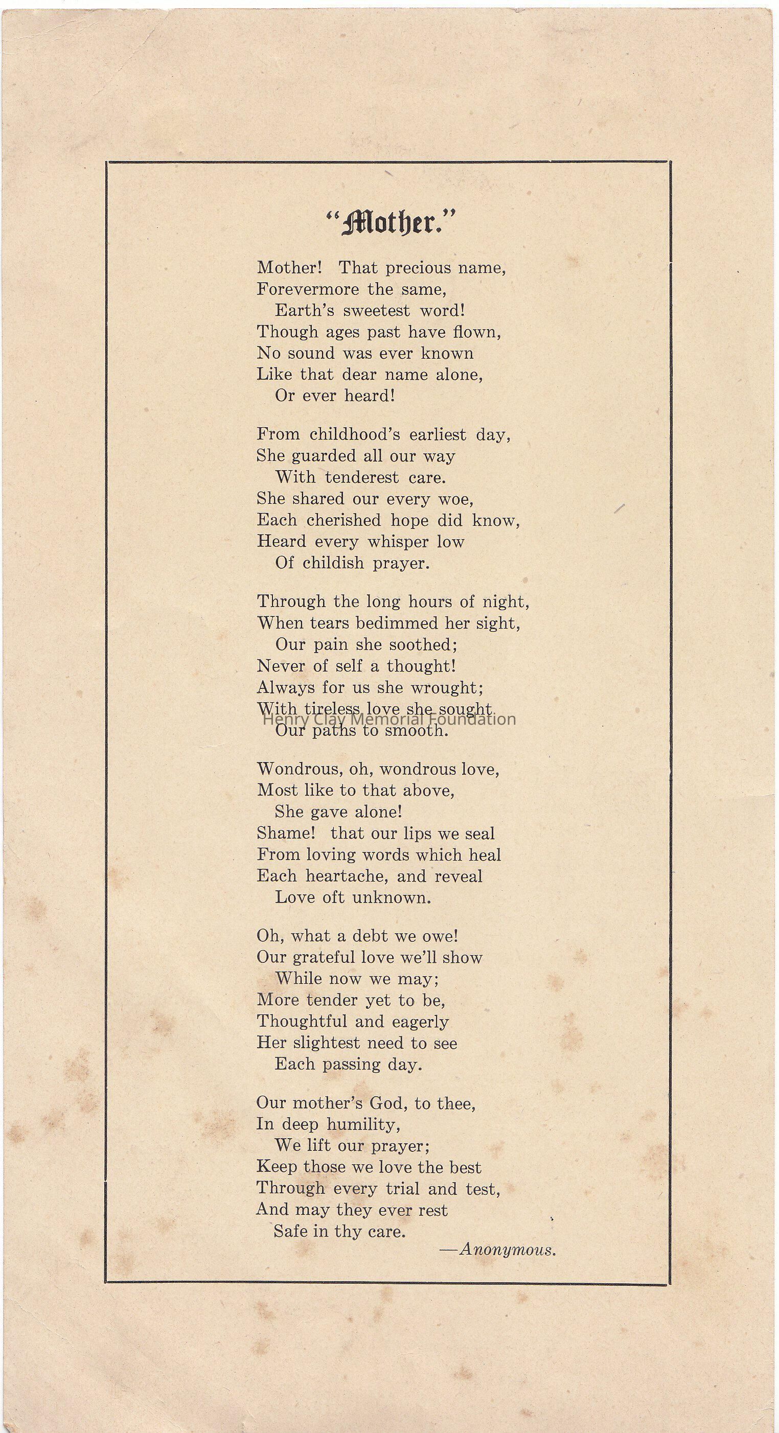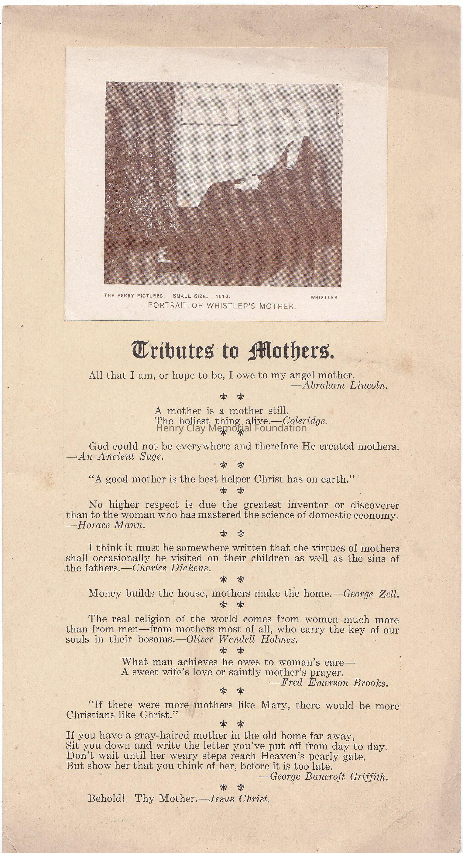 A "Tribute to Mothers". On top a reproduction of a famous painting by Whistler " Portrait of Whistler's mother" Underneath quotes of famous people concerning mothers. We can see Abraham Lincoln quote.
