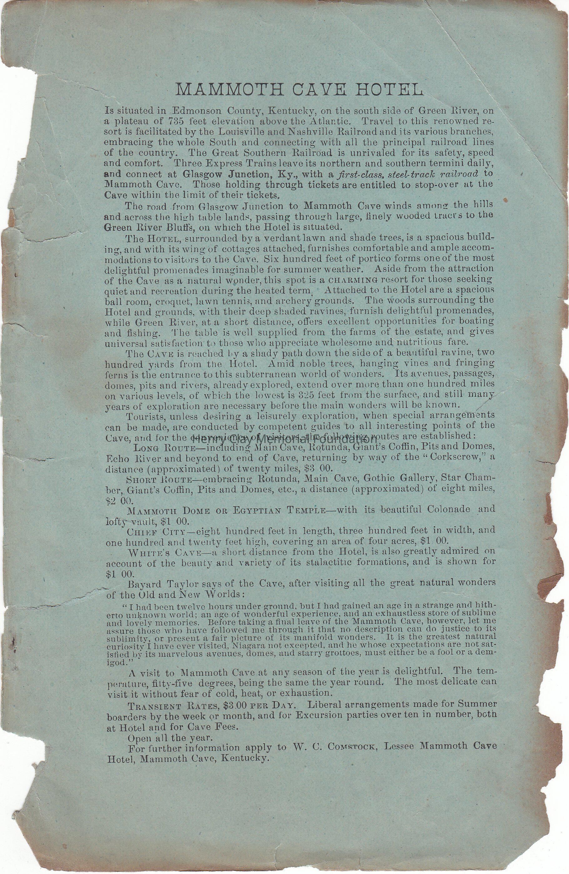The Drawing depicts W.C Comstock, Lessee of Mammoth Cave Hotel. In the rear an exhaustive explanation about the Hotel.