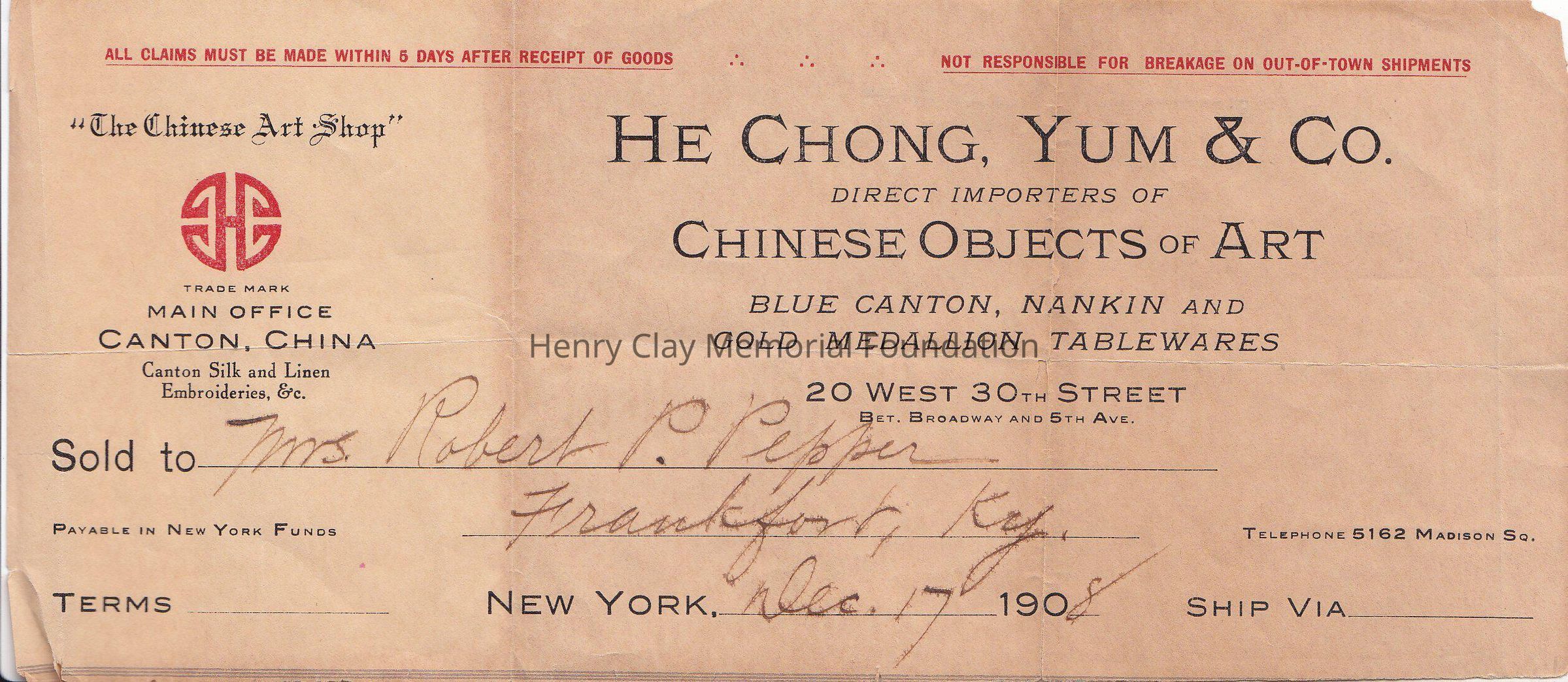The receipt is from He Chong Yum & Co. Direct Importers of Chinese Objects of art. Blue Canton , Nankin and Gold Medalion Tableware