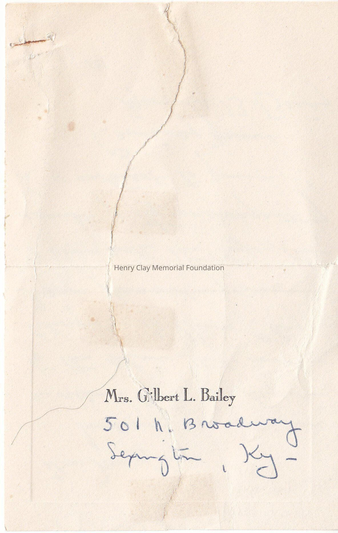 An handwritten note, wrote in a large calling card of Mrs. Gilbert L.Bailey, 501 N.Broadwa, S...Ky.