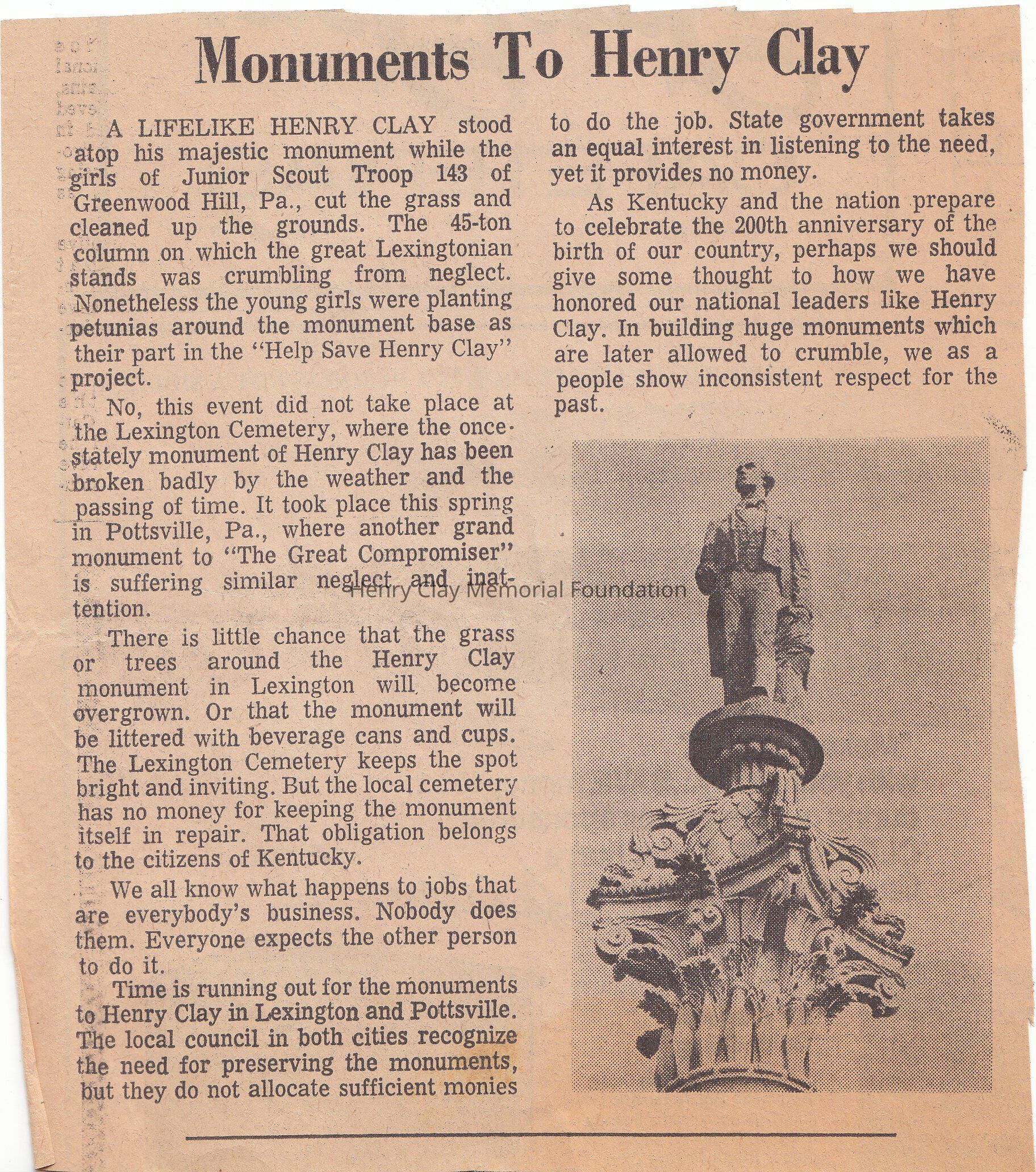 A clipping of newspaper about the cleaning of the Statue of Clay from the Junior Scout Troop 143 of Greenwood Hill, Pa. The cleaning didnt take place in Lexington, Ky but it did took place in Pottsville, Pa, where another monument of the Great Compromiser is suffering similar neglect.
