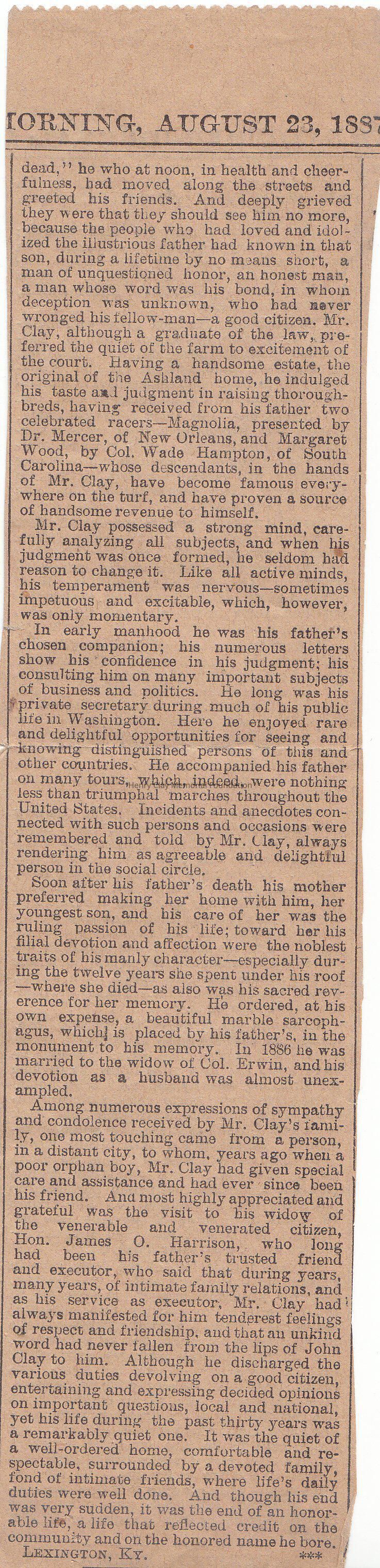 A clipping talking about the passing of Mr.Clay. In the clipping it is reminded about is throughbreds horses at Ashland and his life, and the wedding in 1886 to the Widow Mrs. Erwin.