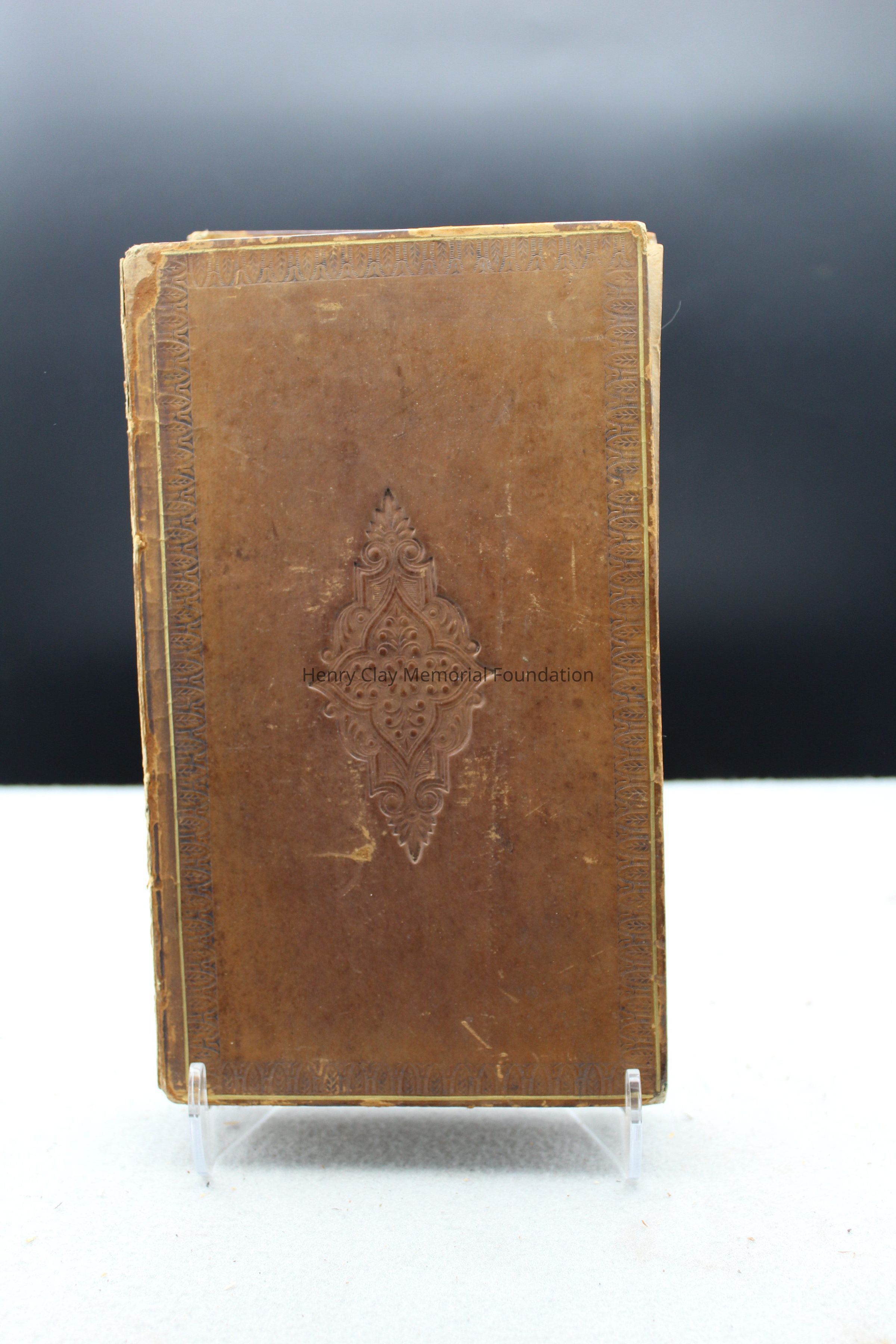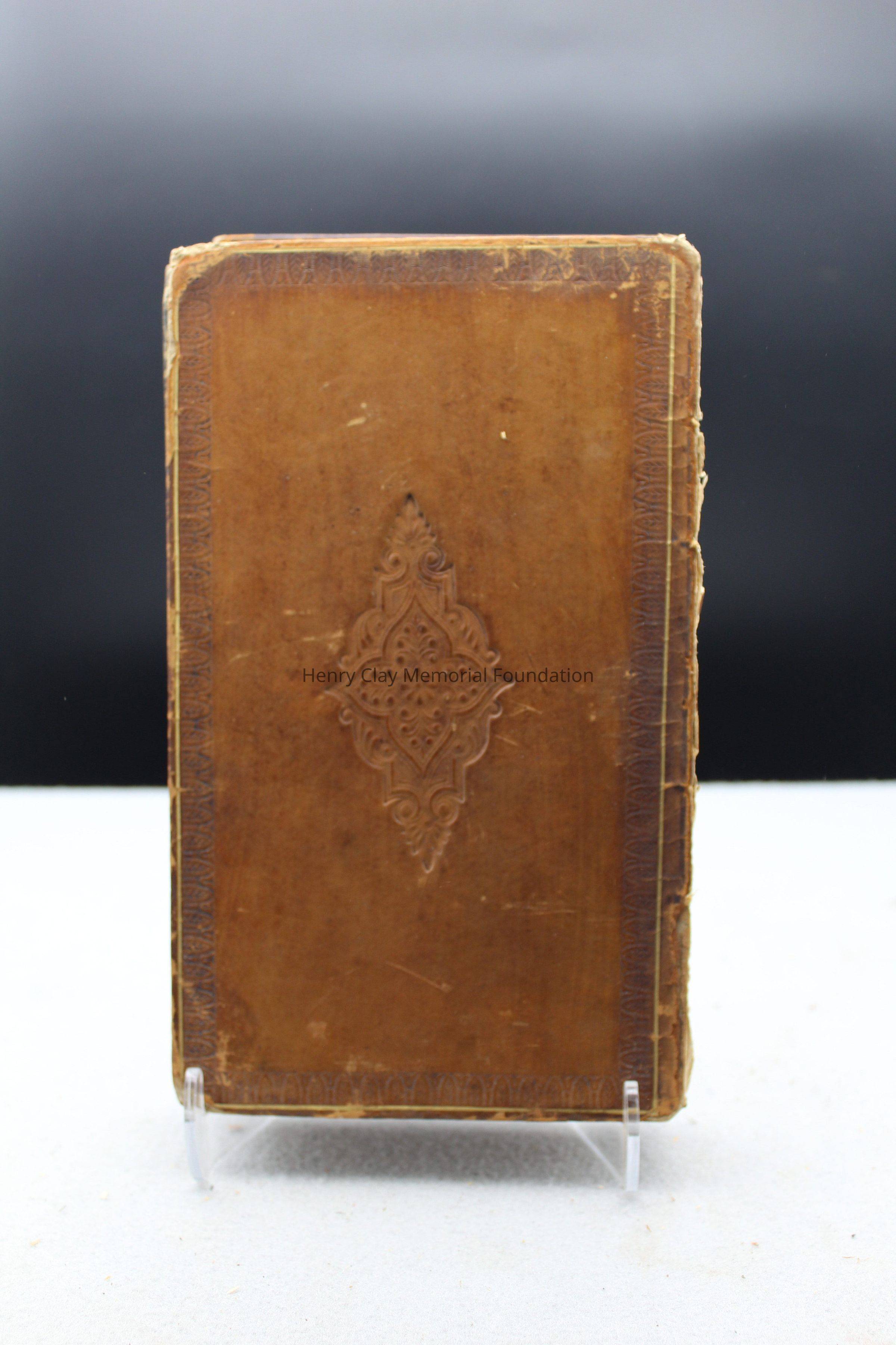 A brown leather book with debossing on center and around perimeter of cover. Front and back covers are detached and the spine is missing. There is foxing throughout and age related browning. This book is a collection of speeches given by General Maximilien-Sébastien Foy.Dimensions