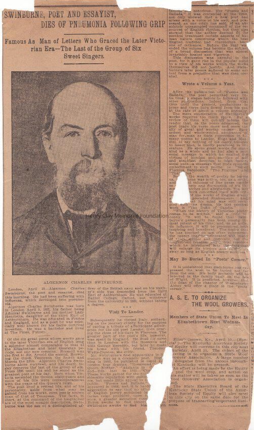 An article about the passing of Swinburne Charles, a poet and essayist in London.